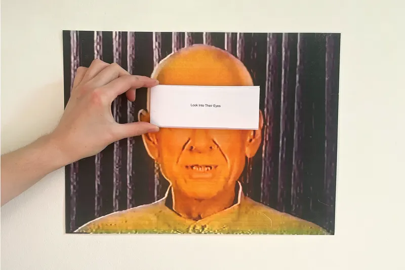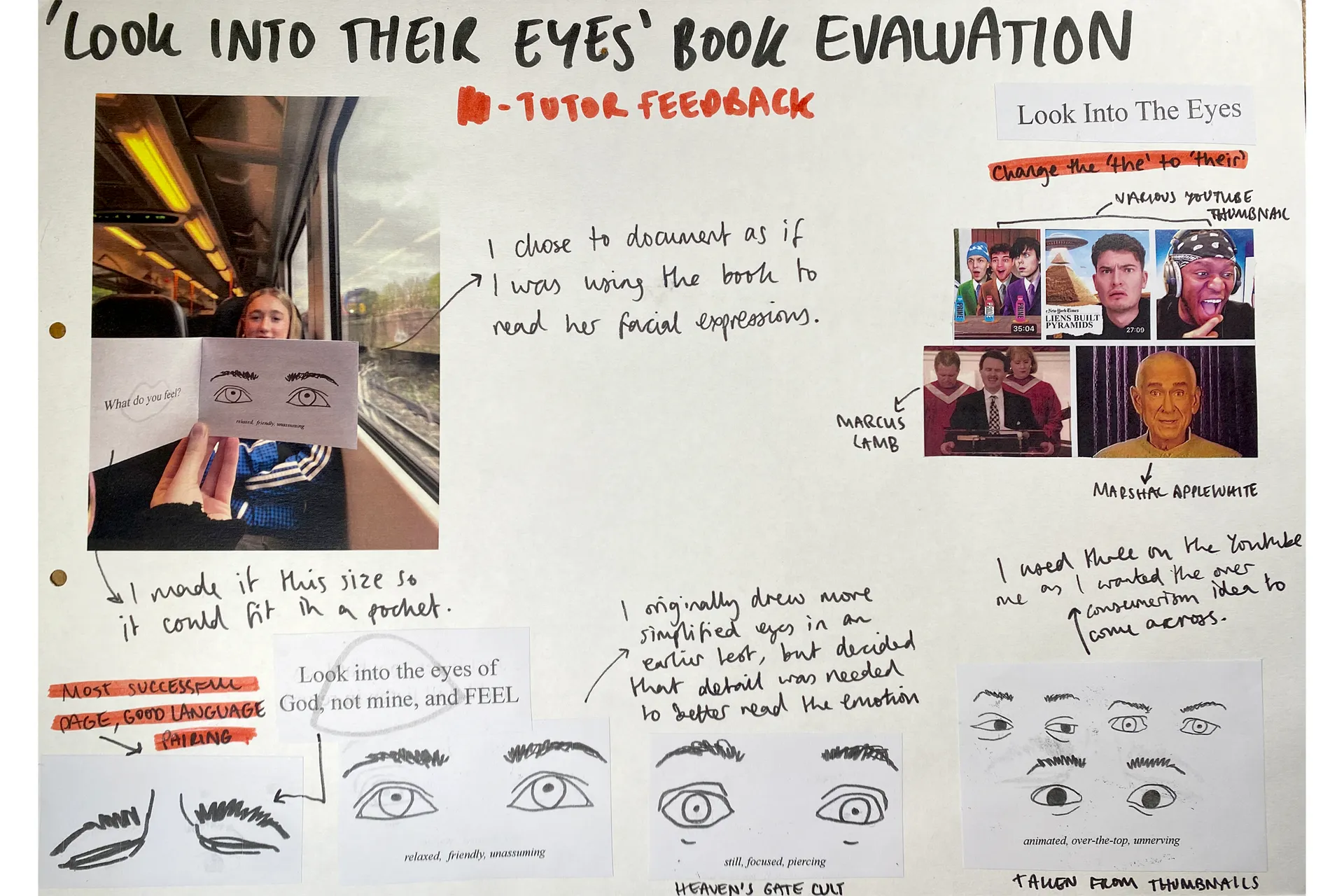 As well as looking at footage, I wanted to explore the mechanics of facial expression, particularly focusing on the eyes and the mouth. I tested a range of ideas, like drawing my own expressions in conversations, and then focusing on the footage I had gathered, so the book could work alongside the film. I made a couple of iterations to the book, before finalising it with pictures rather than drawings. This tied in better with the film.