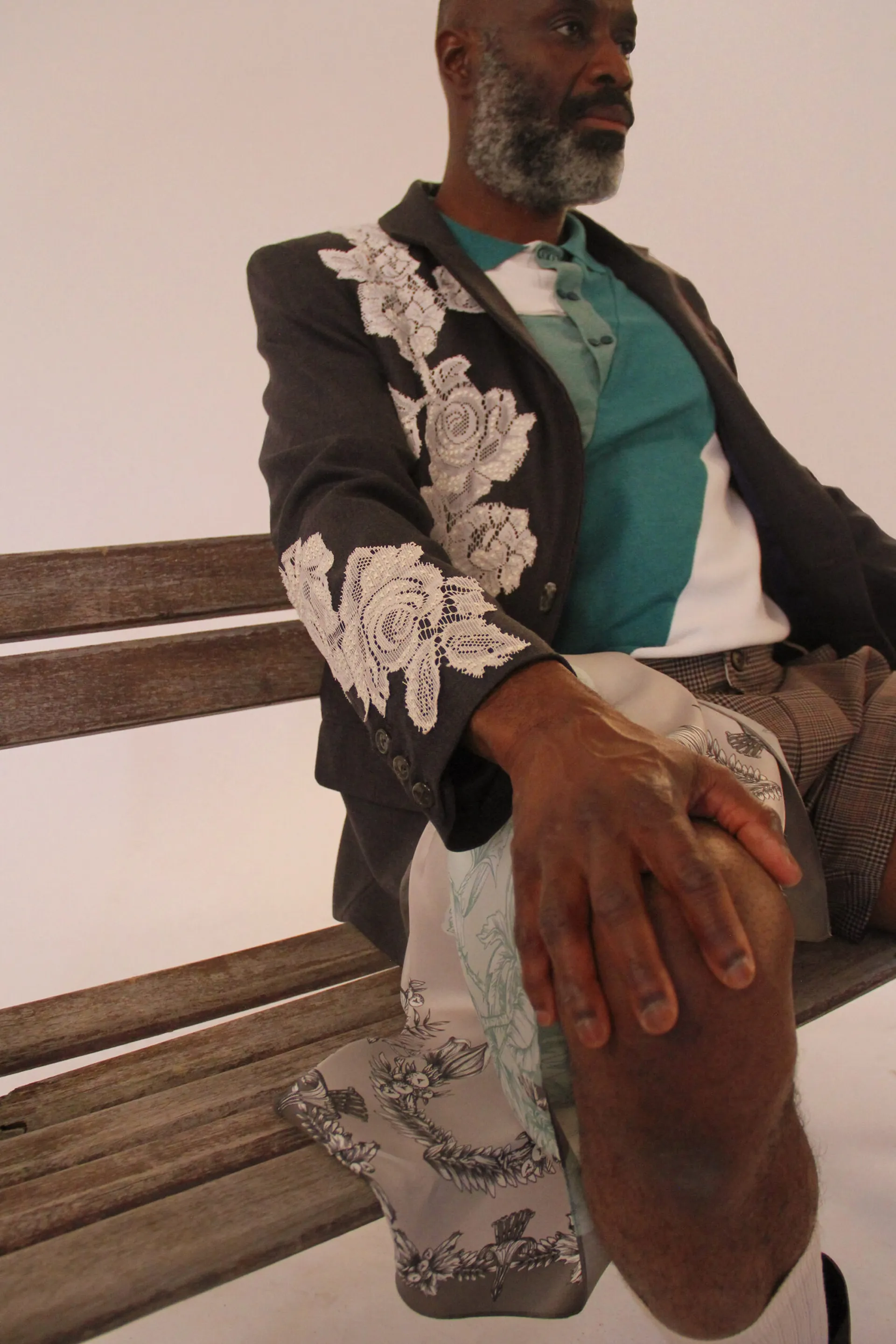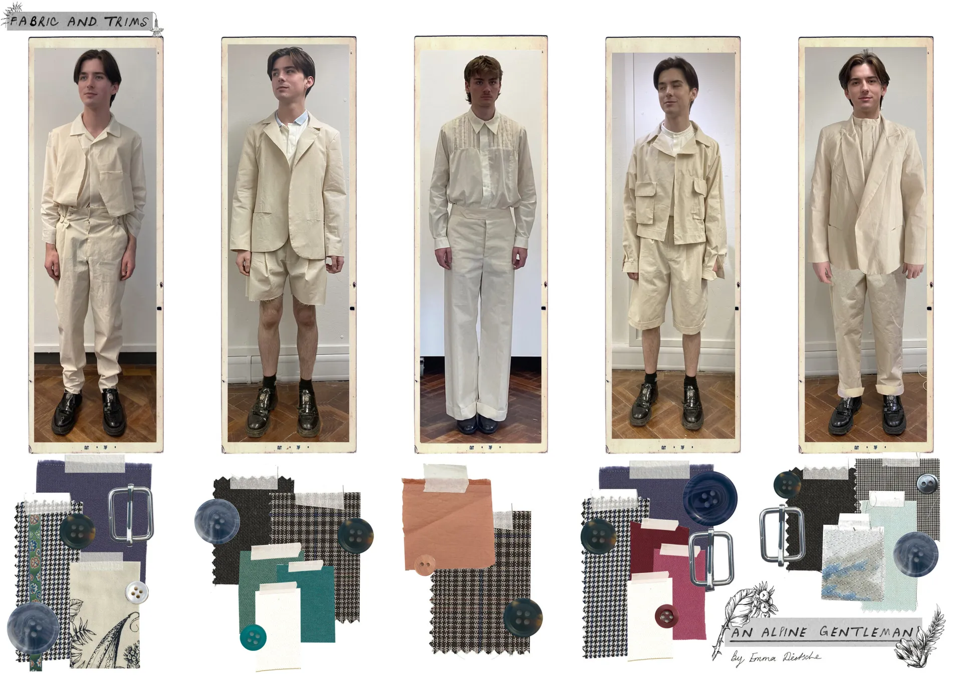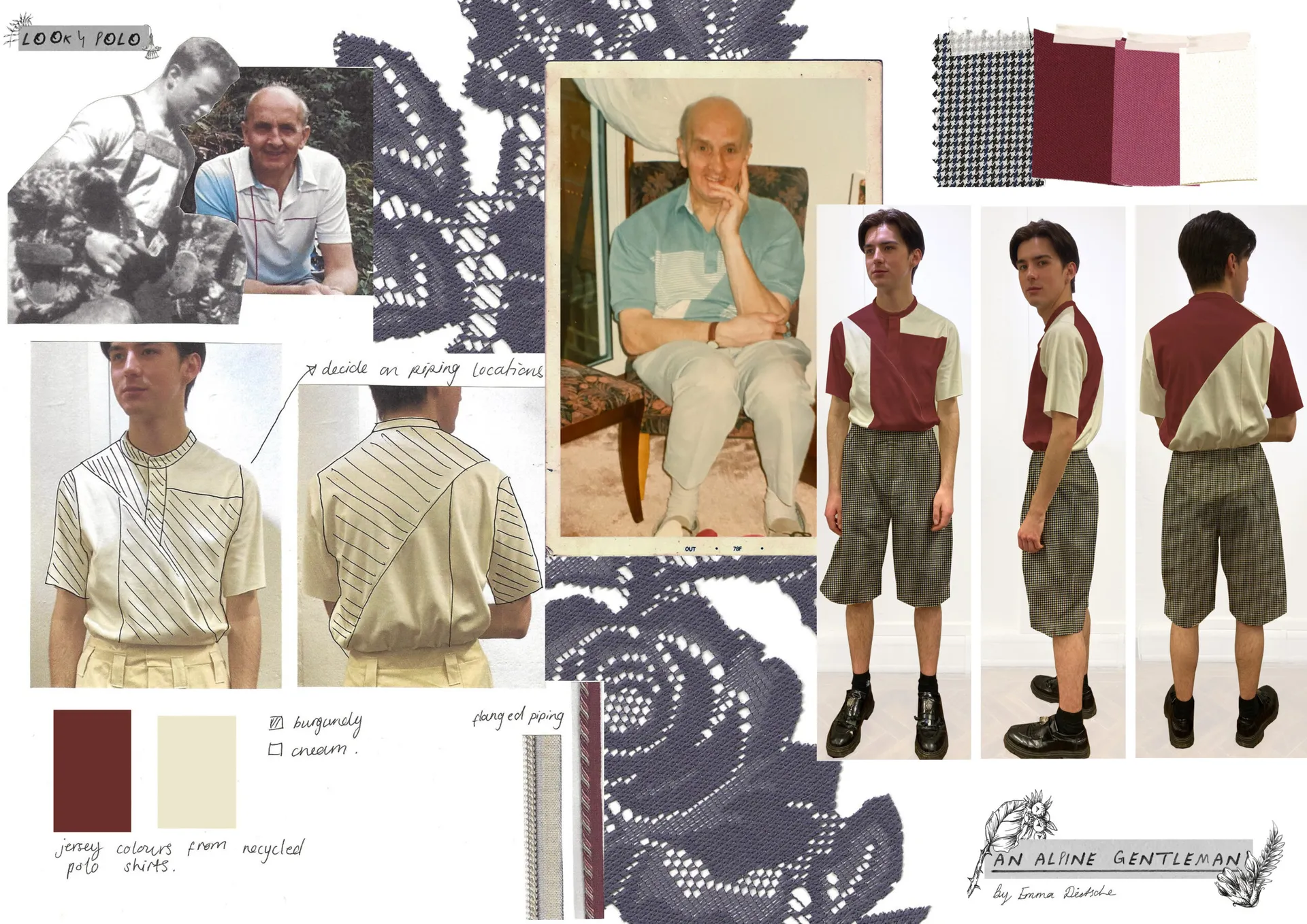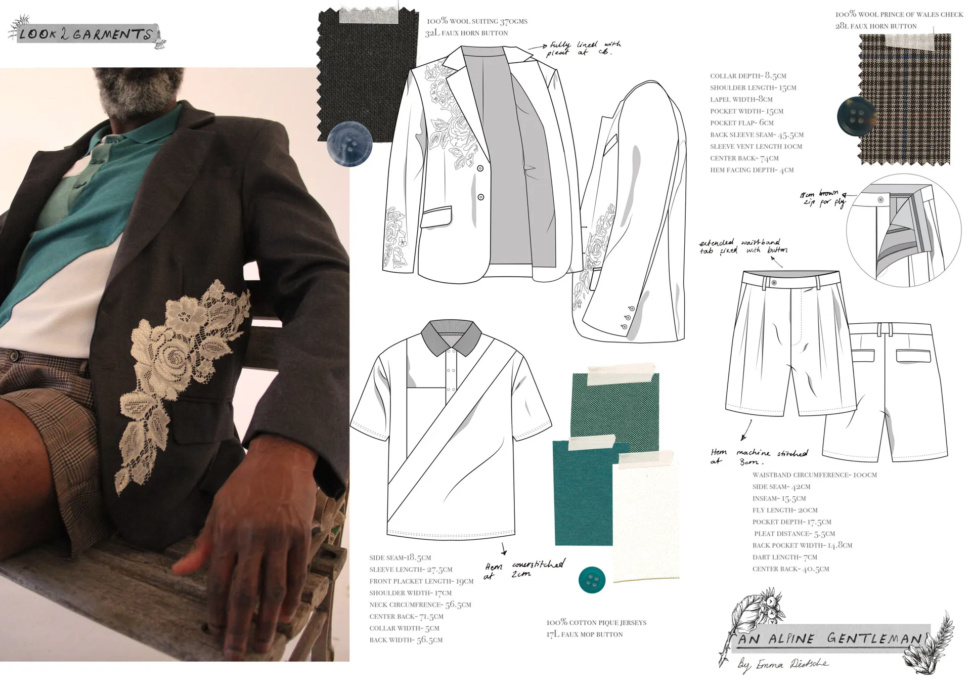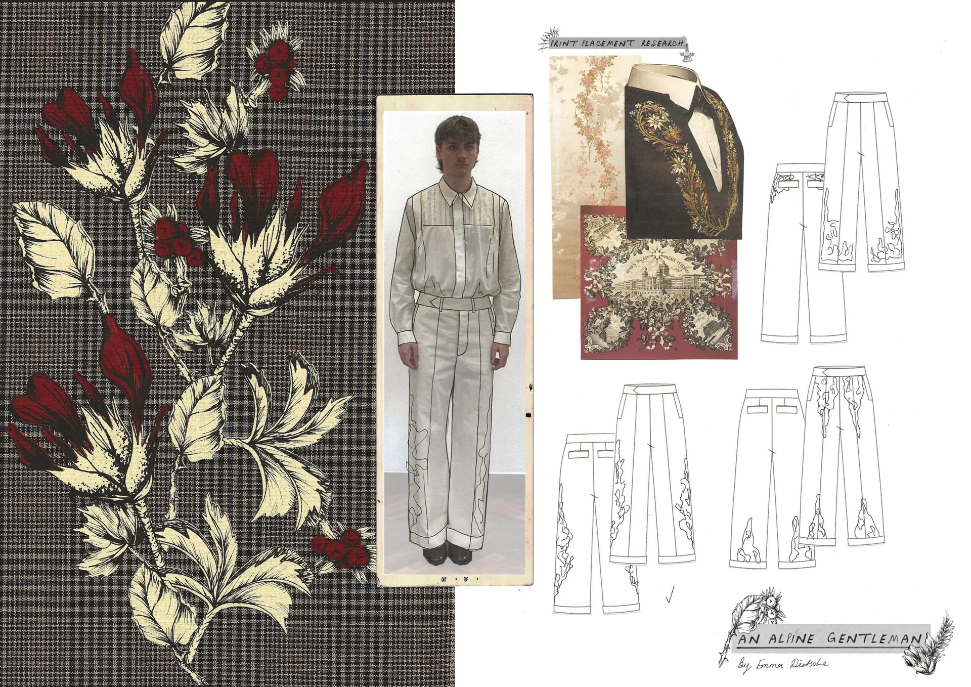 ‘An Alpine Gentleman’ is a dedication to my late grandfather, a story of his love for Switzerland and dressing like the British gentleman he was. Using his photo albums of his Swiss adventures with my grandmother as a visual diary, I was able to translate them into a collection of personal garments. Combining this with my own Swiss heritage resulted in an exploration of surface design influenced by the rich Swiss textile history. The hand drawn floral prints reference the vast array of Swiss alpine plants, serving to enhance the tailored silhouettes. I explored traditional tailoring techniques and used my grandfather’s clothes as source pieces. The collection was an aim to combine classic menswear characteristics with traditional Swiss fashion and textiles , and honouring my grandfather’s love that I was fortunate enough to receive.
