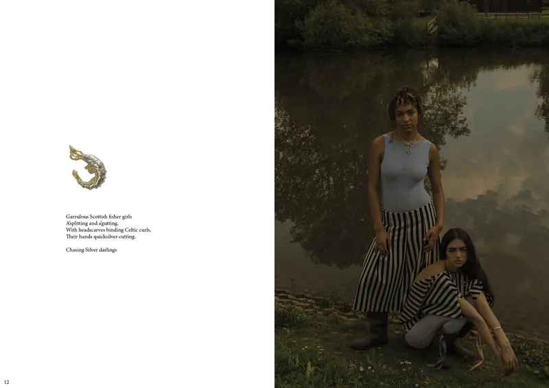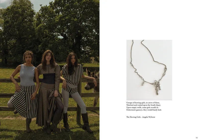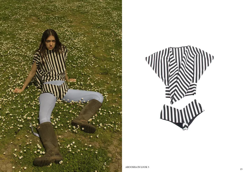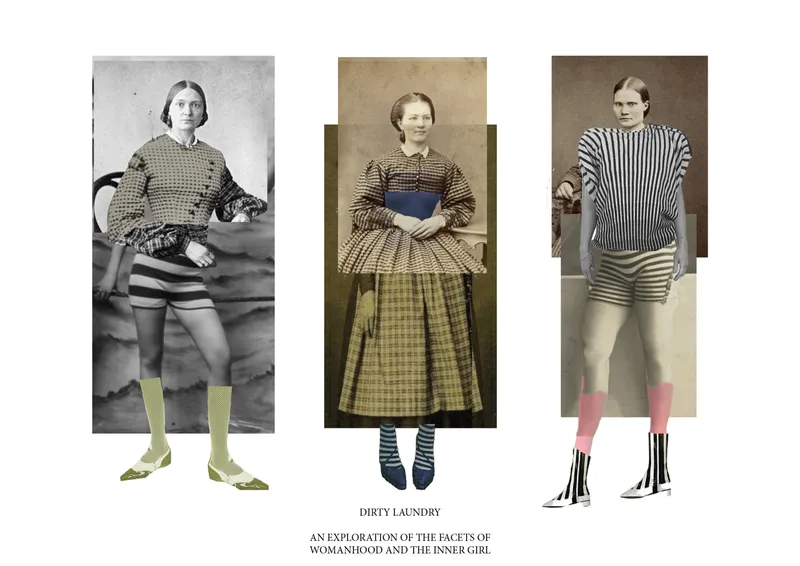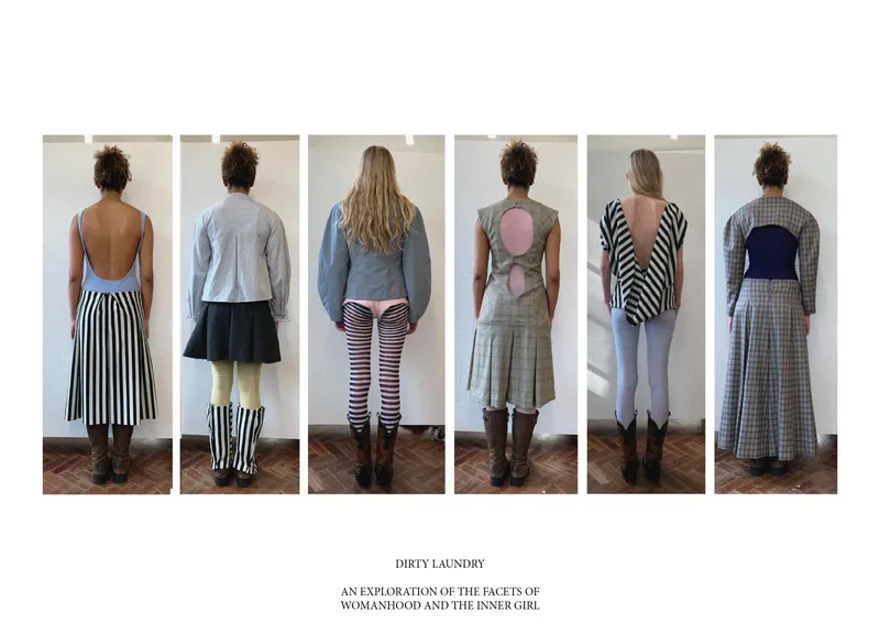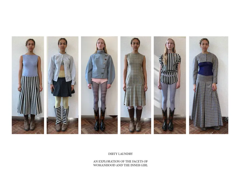 ‘Dirty Laundry’ is an exploration of the facets of womanhood and the inner girl, airing our secrets and the layers of femininity. It tells the story of a fight between softness and sternness, the playful child within and the facade of toughness that surrounds the modern-day girl. Taking inspiration from working women, stripes and tartan nod to the women’s land army and the Scottish Herring Lassies with their ‘sharp tongues and sharp knives’. This is paired with colourful mesh tights, bodysuits and the brooches styled throughout which belonged to my Grandmothers’. These are a random assortment of different colourful gems and shapes that gave the girl in me creative freedom and reminded me of the first joys of playing in mums forbidden jewellery boxes, hinting to the playful side that never leaves us despite the external pressures of life.
