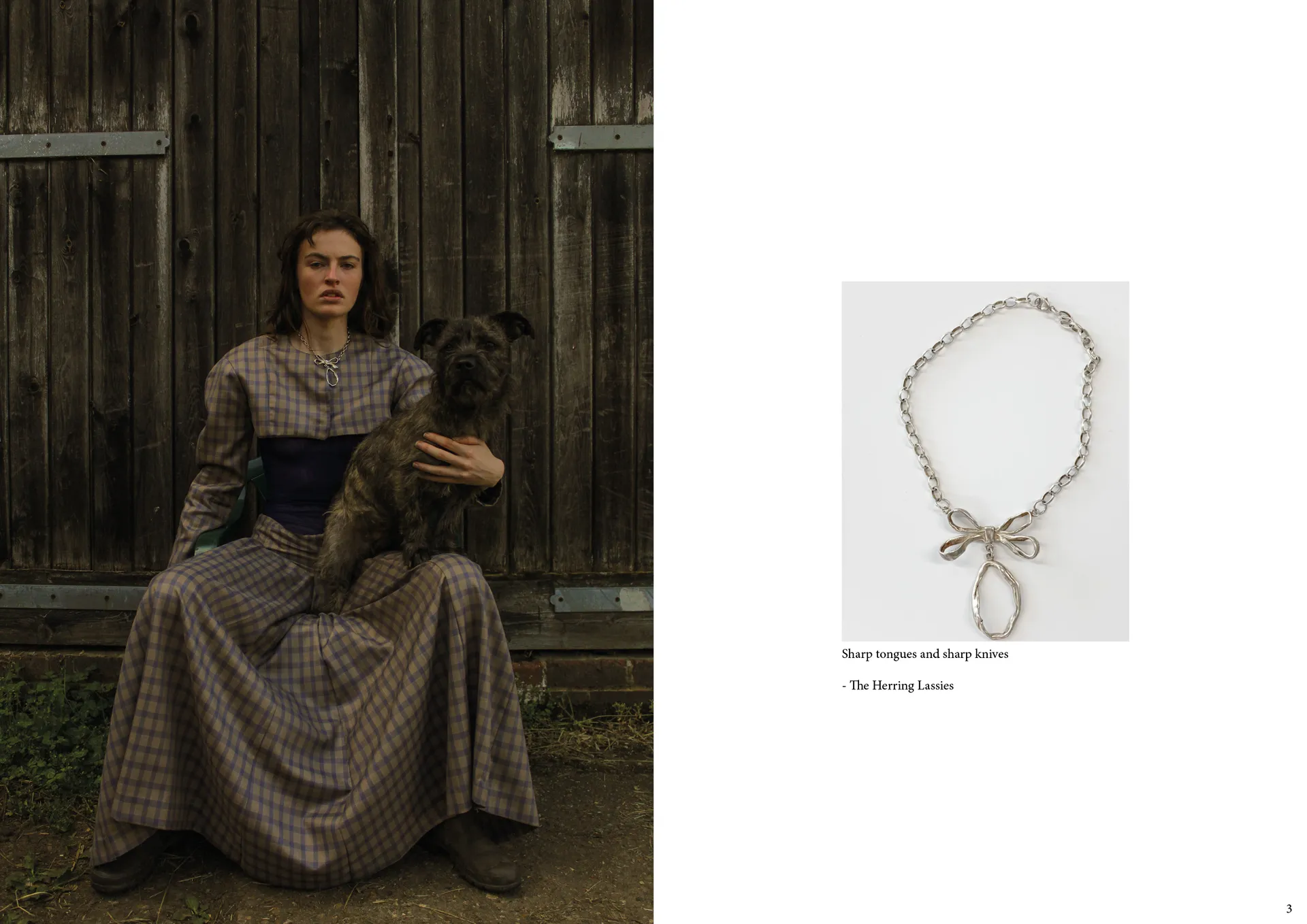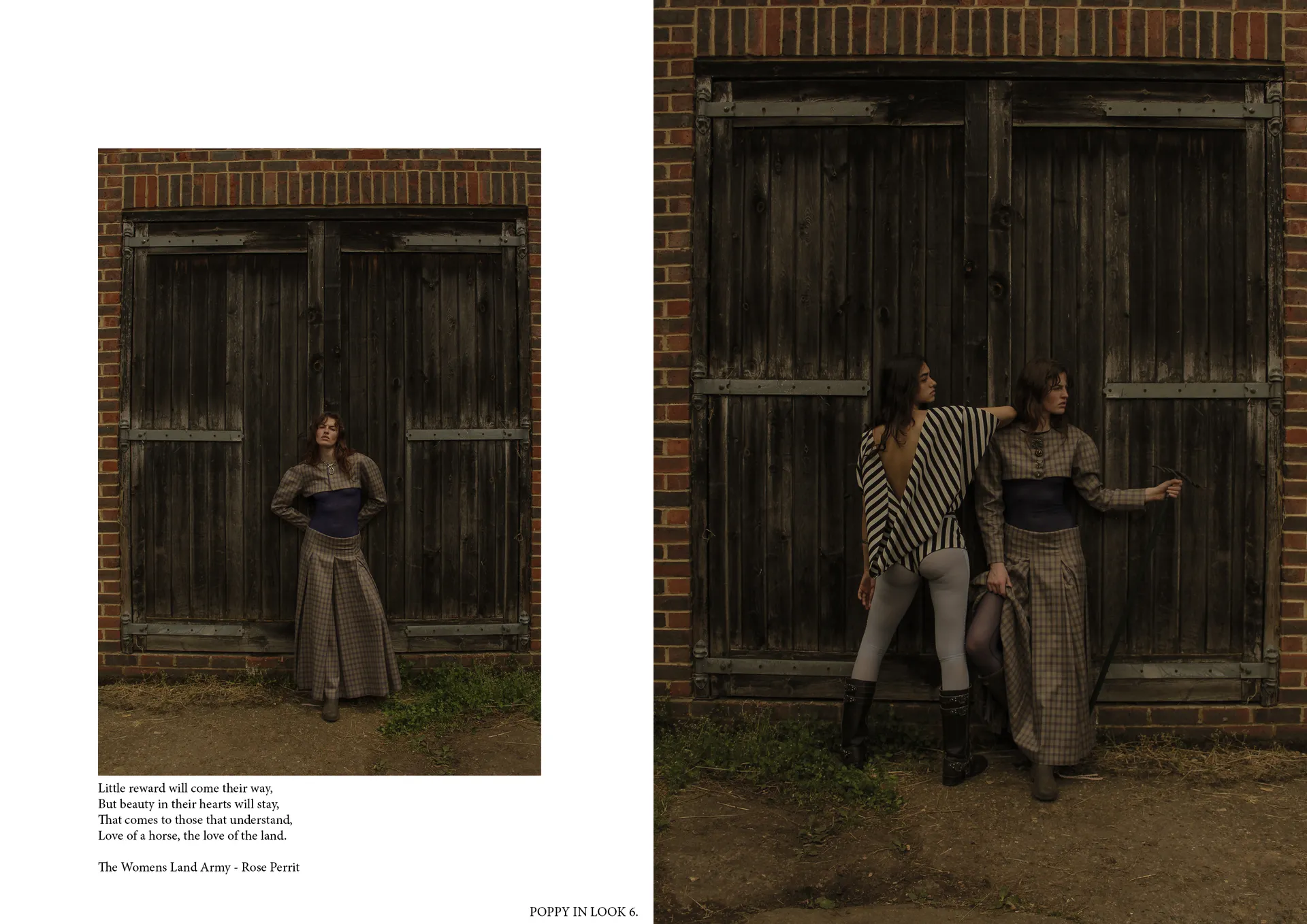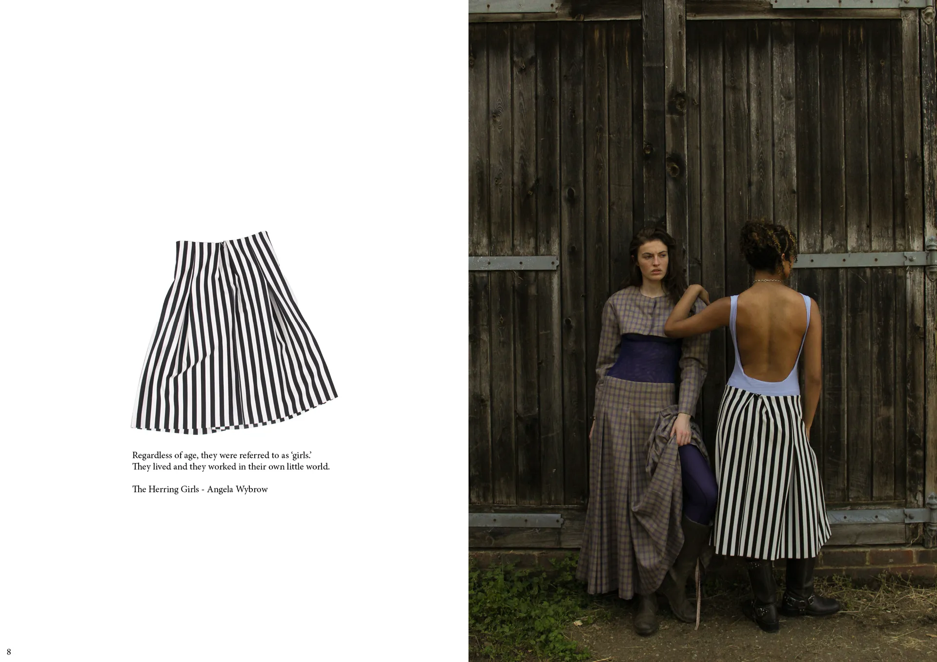 ‘Dirty Laundry’ is an exploration of the facets of womanhood and the inner girl, airing our secrets and the layers of femininity. It tells the story of a fight between softness and sternness, the playful child within and the facade of toughness that surrounds the modern-day girl. Taking inspiration from working women, stripes and tartan nod to the women’s land army and the Scottish Herring Lassies with their ‘sharp tongues and sharp knives’. This is paired with colourful mesh tights, bodysuits and the brooches styled throughout which belonged to my Grandmothers’. These are a random assortment of different colourful gems and shapes that gave the girl in me creative freedom and reminded me of the first joys of playing in mums forbidden jewellery boxes, hinting to the playful side that never leaves us despite the external pressures of life.