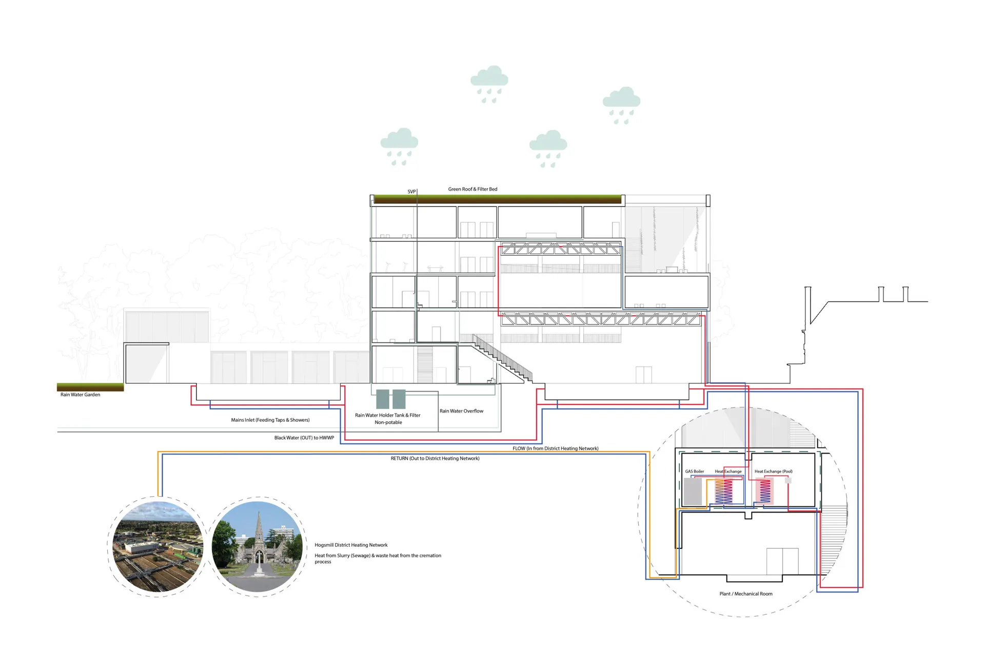 The new leisure centre will also aim to address the high energy consumption of traditional leisure centres by exploring more sustainable heating and cooling alternatives. One proposal is to connect the building to a District Heating network, which would use excess heat from the Hogsmill sewage treatment works and Kingston crematorium to heat the building and pool water. Additionally, the pool itself could be used as a thermal store outside of operational hours, capturing and redistributing heat to other buildings around Kingston.