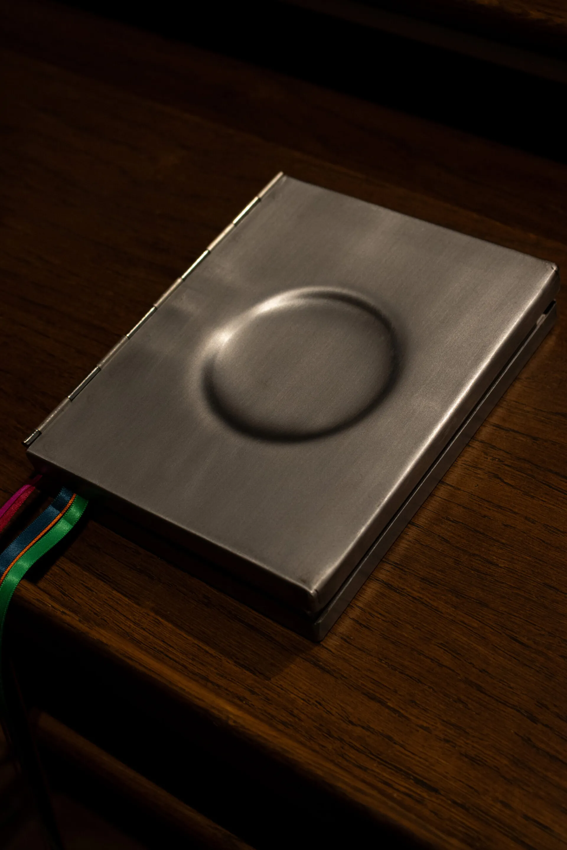 These topics influenced the design of the final output. The layout of the text replicated a classic bible style emphasising the tradition and familiarity of the way many people approach religion. But this delicate, debossed book was then placed into a welded metal case, emphasising the contrast between the fragility of the message and its context and how interpretation can have implications on religious belief and practice. I also wanted the viewer to have an appreciation of the scale of the paintings. To do this, ribbons the length of the paintings hung from the book and framed pages demonstrated the width of the paintings.