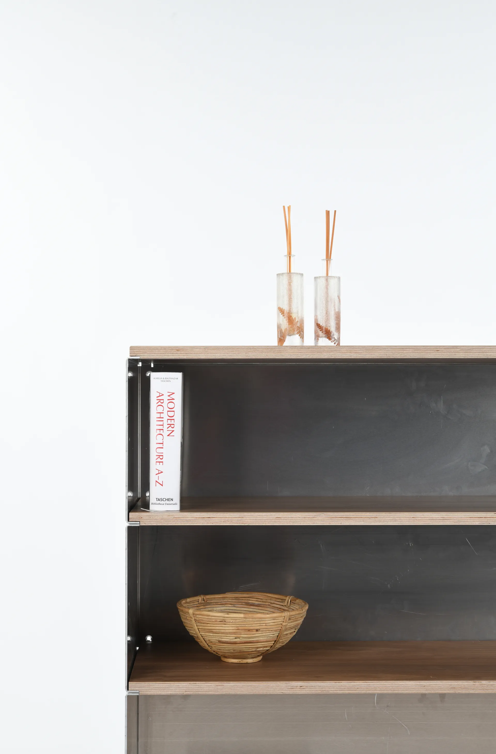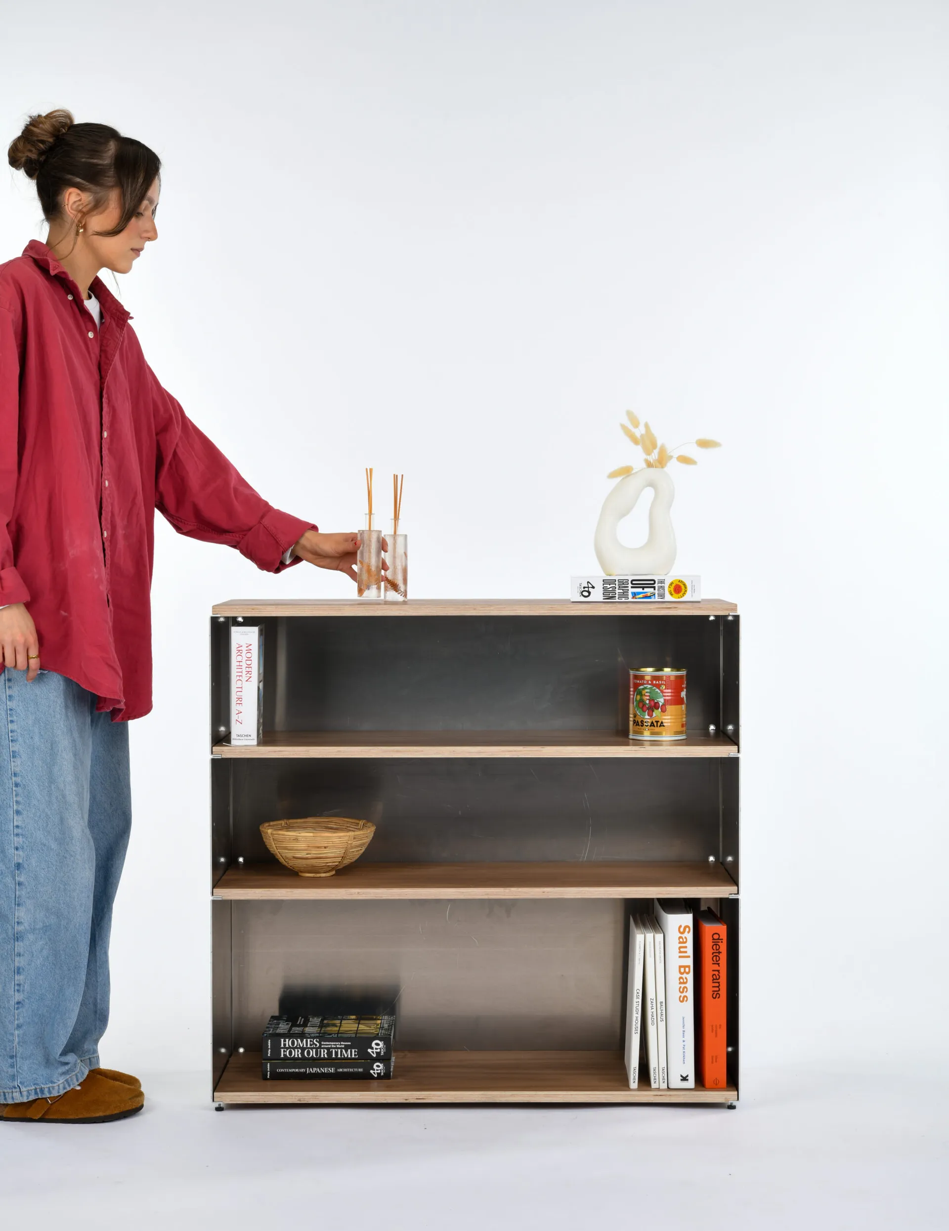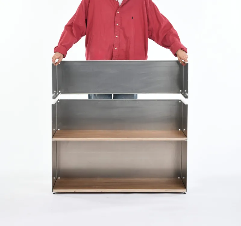 An investigation into the use of a mass manufacturing method, sheet metal folding, to bring form and function to a flat, sheet material. Developing a component part constructed from aluminium to produce a series of domestic storage solutions that are modular, and system based. The system stems around the design of a pair of bracket components that can be stacked to produce a range of archetypal furniture, transforming into shelving, sideboards and bookcases in a range of sizes, and mounting possibilities.