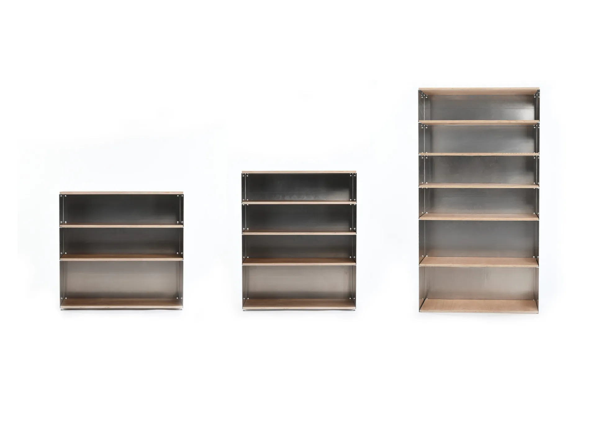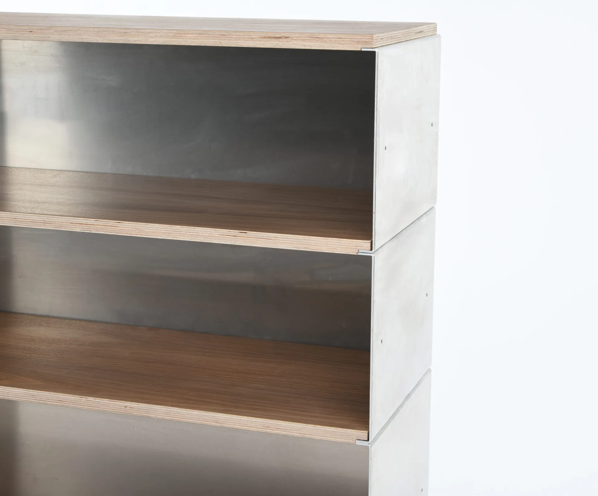 An investigation into the use of a mass manufacturing method, sheet metal folding, to bring form and function to a flat, sheet material. Developing a component part constructed from aluminium to produce a series of domestic storage solutions that are modular, and system based. The system stems around the design of a pair of bracket components that can be stacked to produce a range of archetypal furniture, transforming into shelving, sideboards and bookcases in a range of sizes, and mounting possibilities.