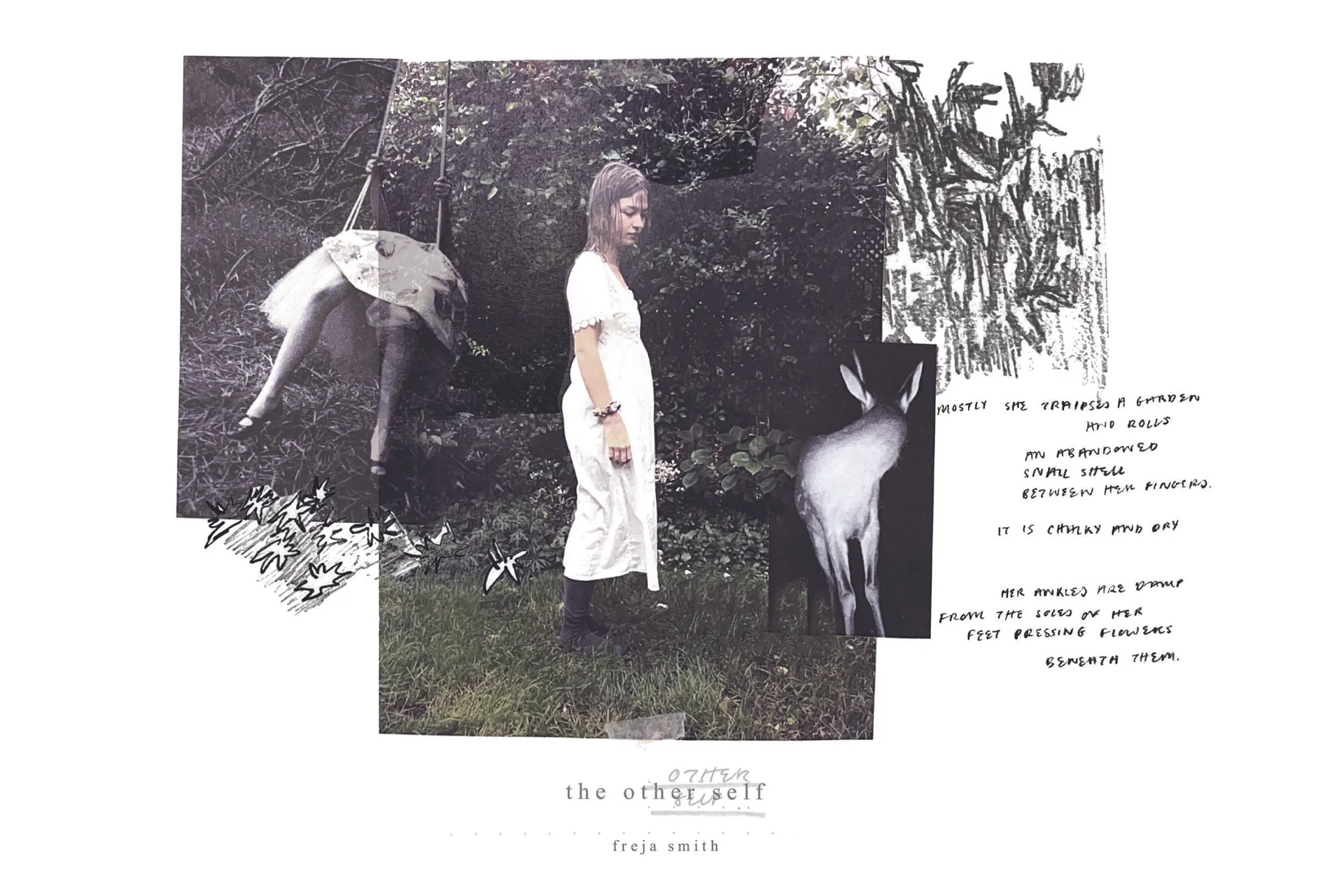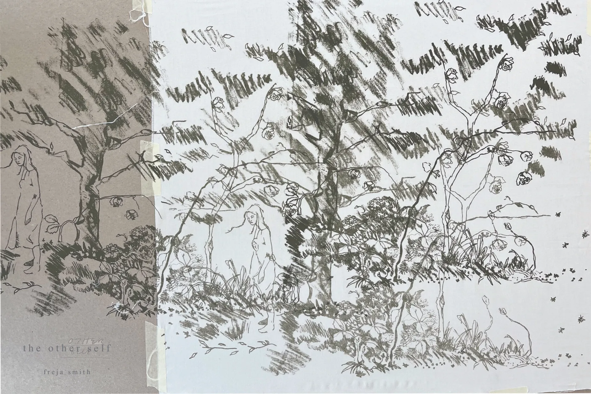 ‘The Other Self’ is inspired by illustrations from my diary that imagine a world for our internal (or ‘other’) selves which is more ethereal than our own, centring a fairy character who is traipsing a garden.
