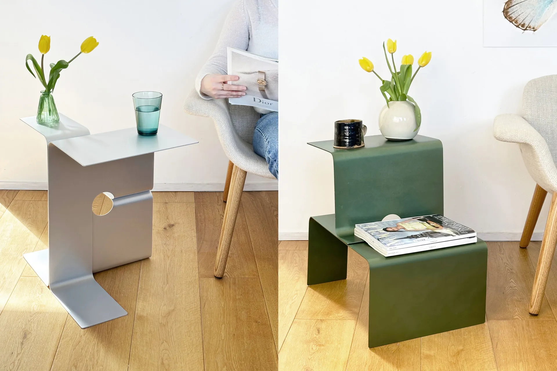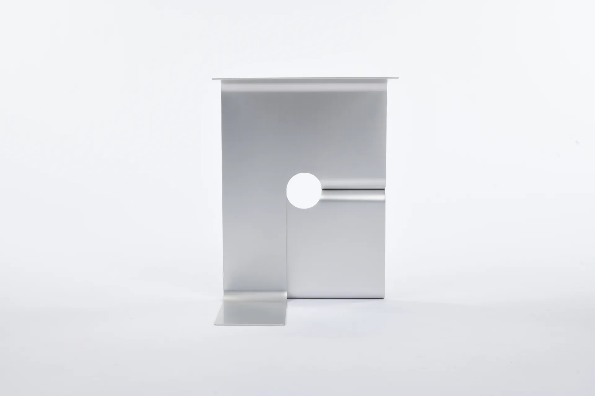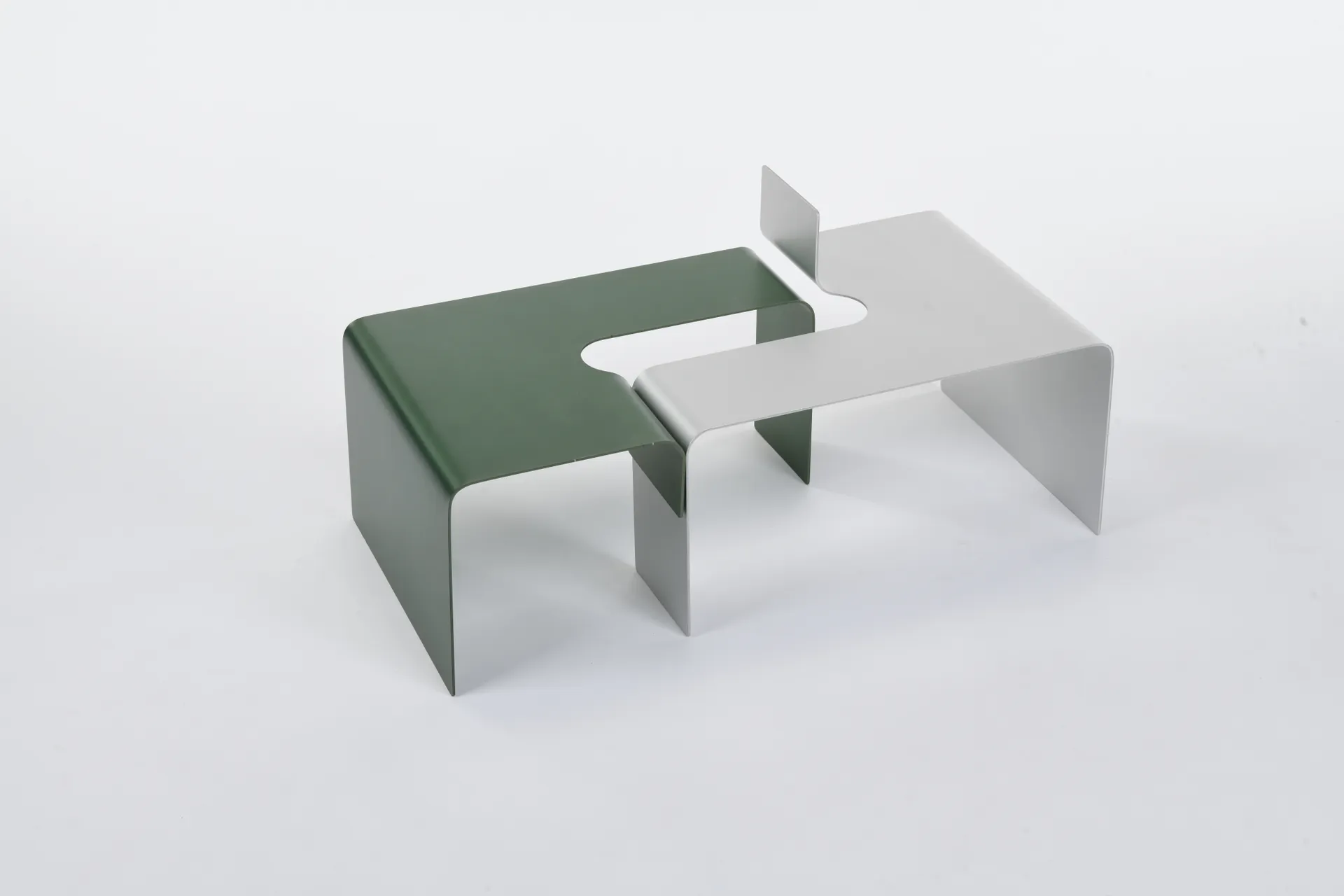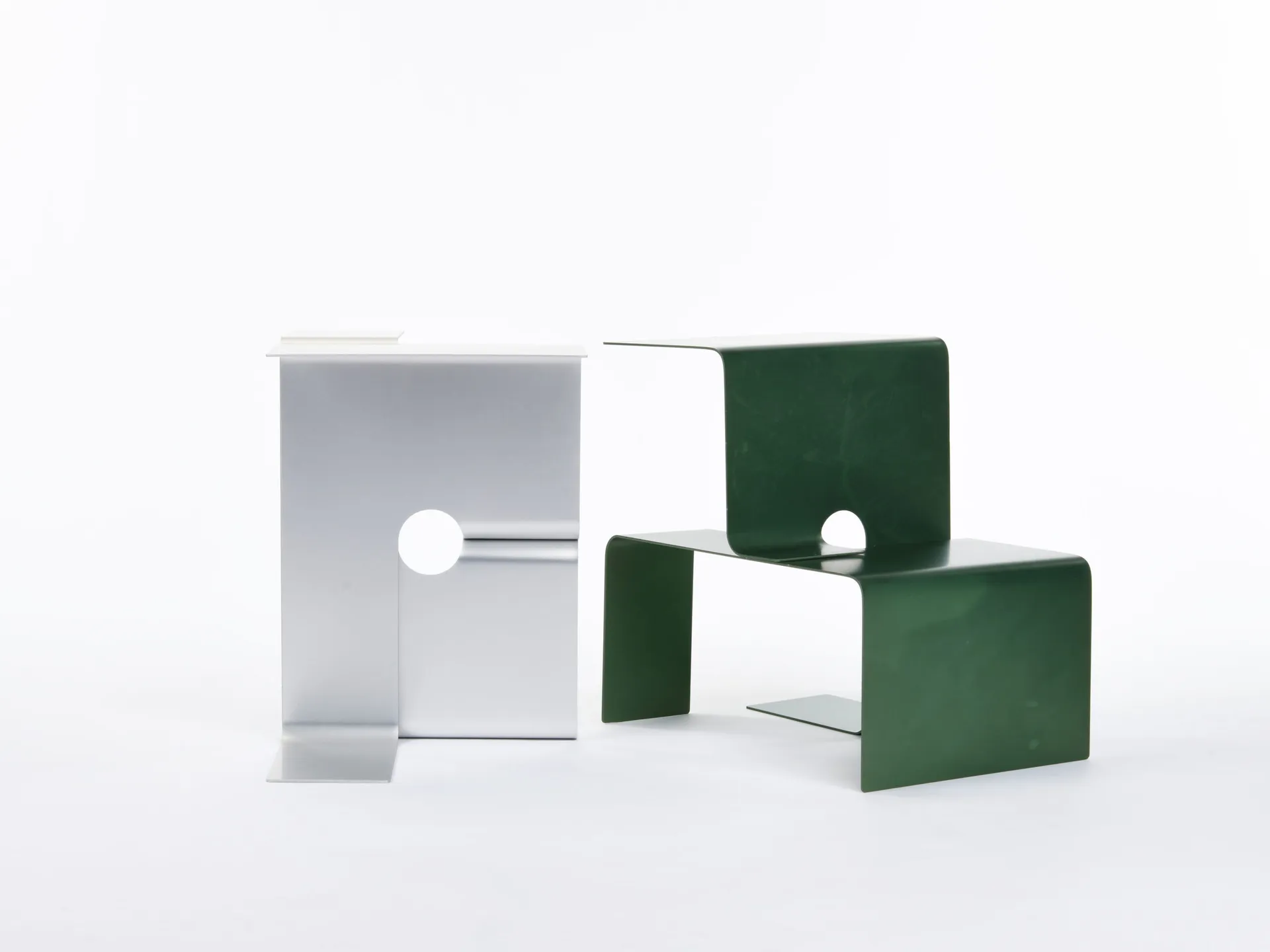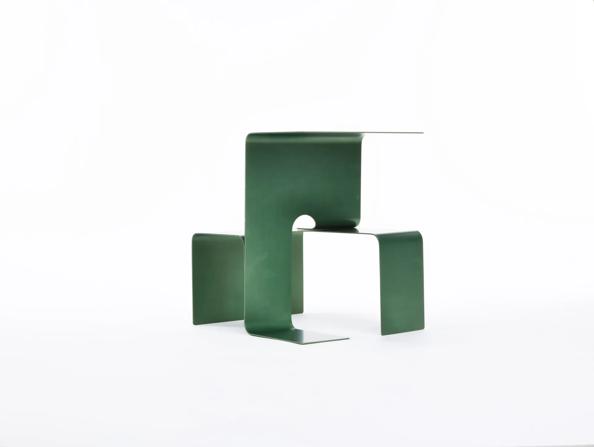 The ‘Twinned Table’ is a furniture range for the domestic environment, which is assembled from two interlocking forms made from 3mm bent aluminium sheet. Both pieces are formed from identical cut out shapes, which are then bent at 90 degree angles with 24mm radius’ to create the desired sculptural forms.