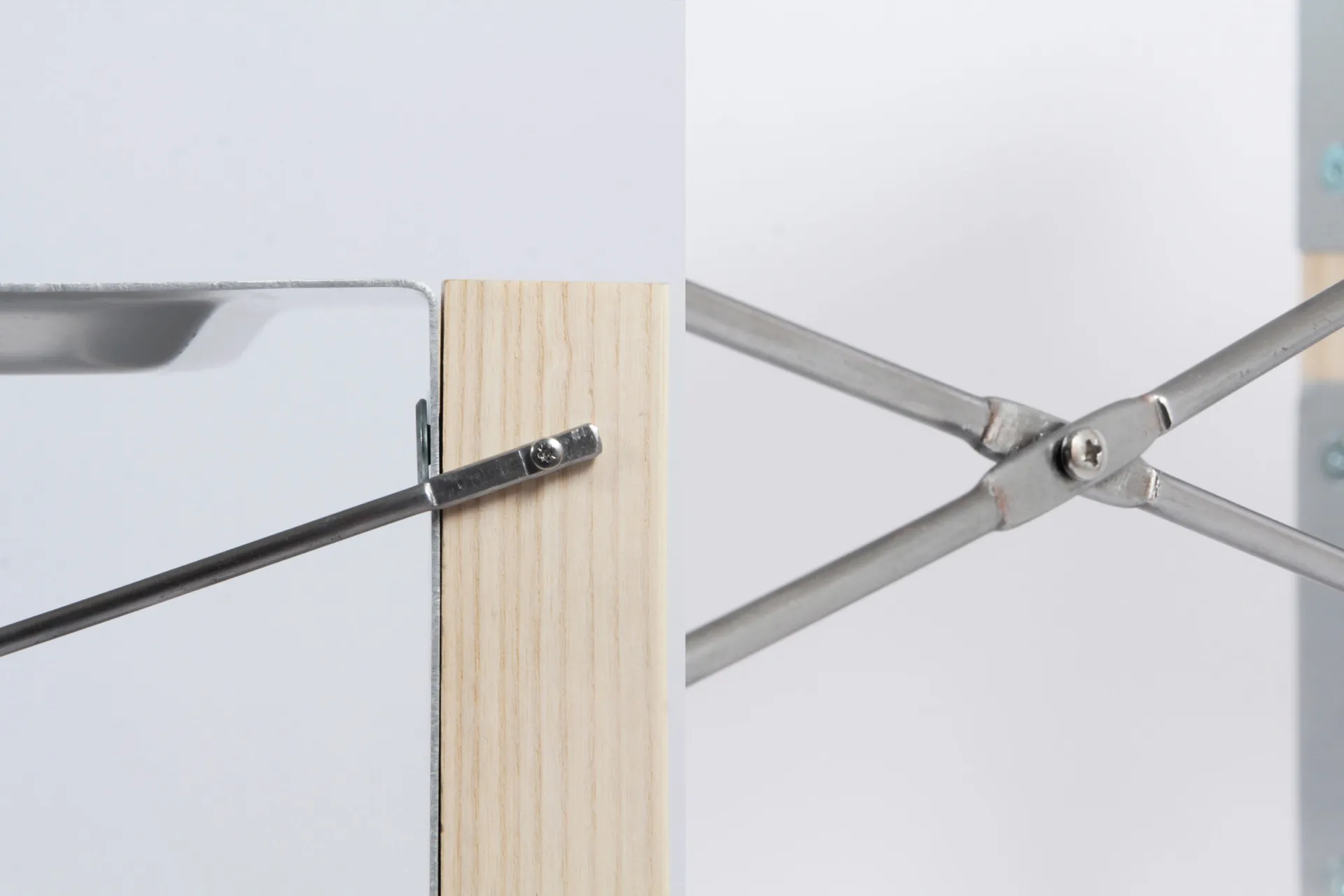 The pressed aluminium element is used to form the top for the Sideboard as well as for a lower shelf. Bending both ends of the sheet at a 90 degree angle gives additional stability to the furniture. The formed and anodised aluminium is fixed on either side to ash, legs. The ash is closely grained with vertical lines which compliment the fine 1.5mm profile of the leading edge to the horizontal elements. A metal rod cross brace prevents the piece from wracking.