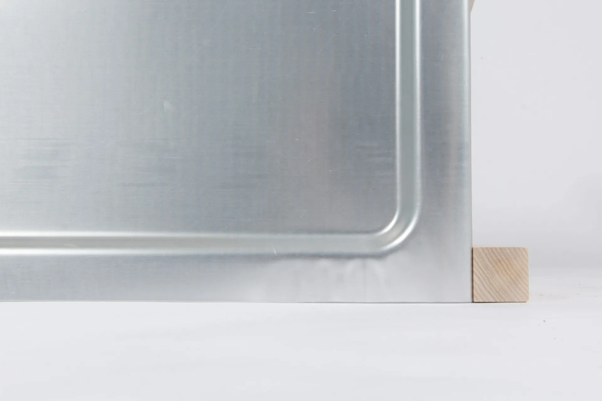 The most applicable technique was for one large indent across a whole sheet. A 1.5mm sheet, 400mm x 1000 mm, with an indent of 320mm x 920mm and 15mm deep, provides impressive horizontal rigidity. It spans 1m with a heavy applied load without bending. The aluminium is from recycled sources and can be itself be recycled after use. The use of a single rectangular sheet is very efficient in its use of material.