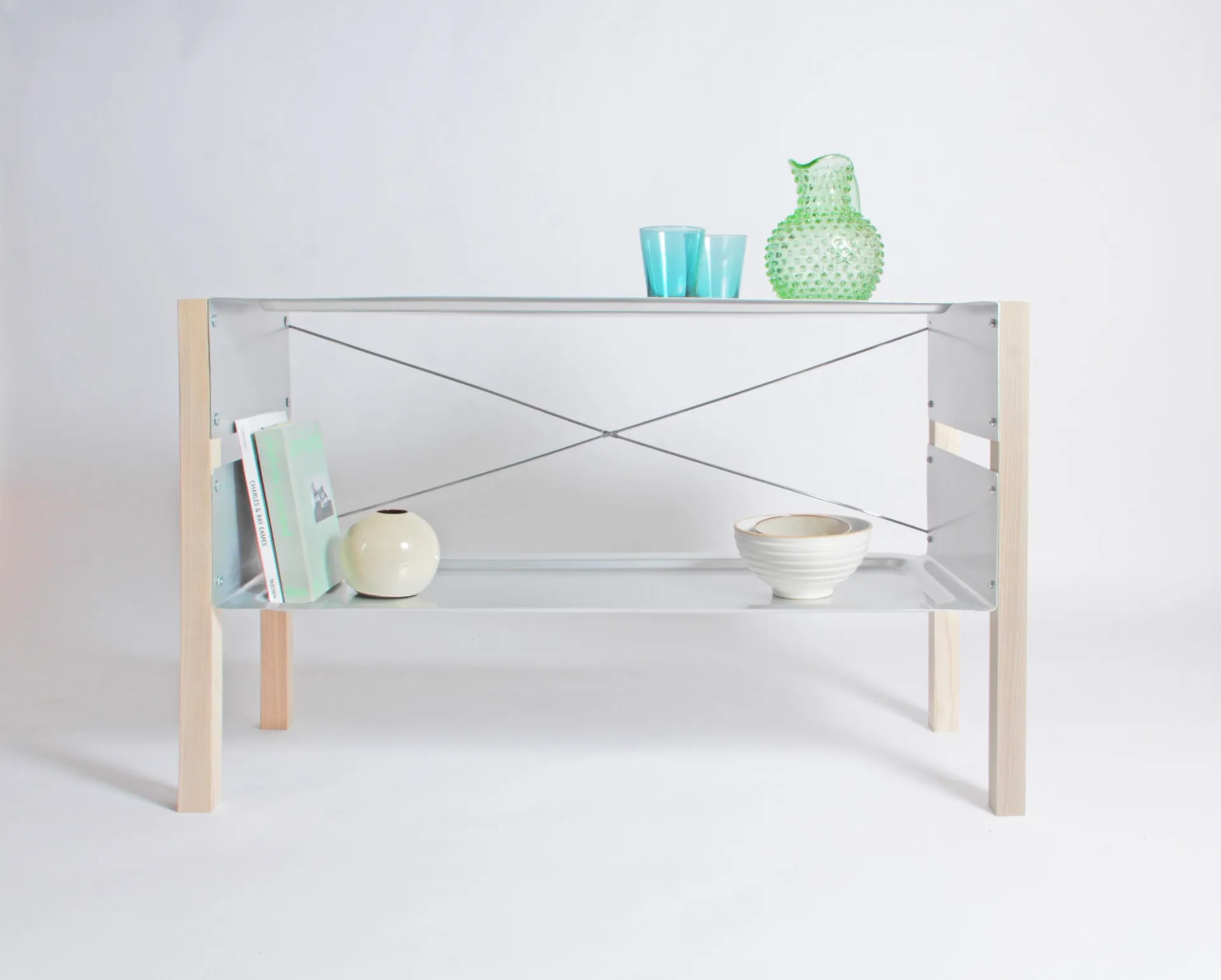 The component parts of the Sideboard can also be used to form a ridged shelving unit of various heights, by replicating the use of the pressed aluminium element, extending the length of the wooden legs and employing the bracing rods. Designed for the domestic environment, this piece would also lend itself well to other settings.
