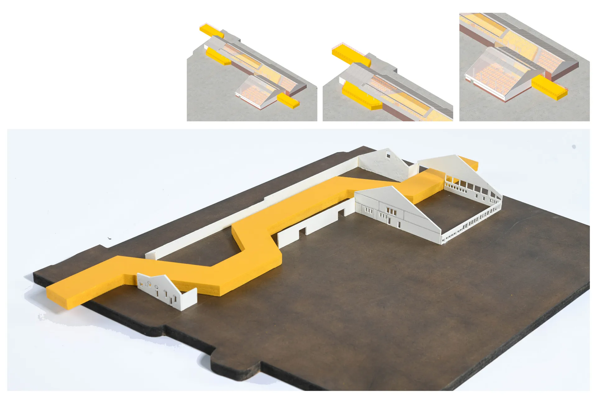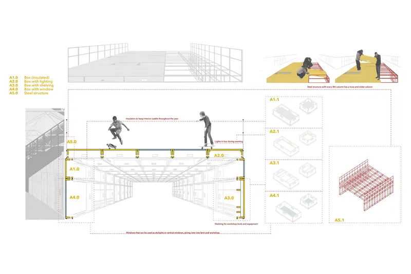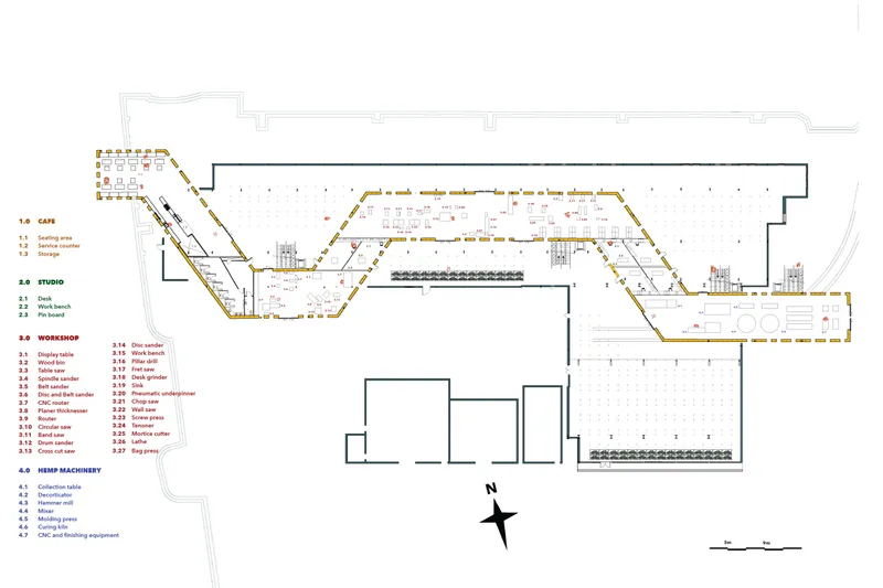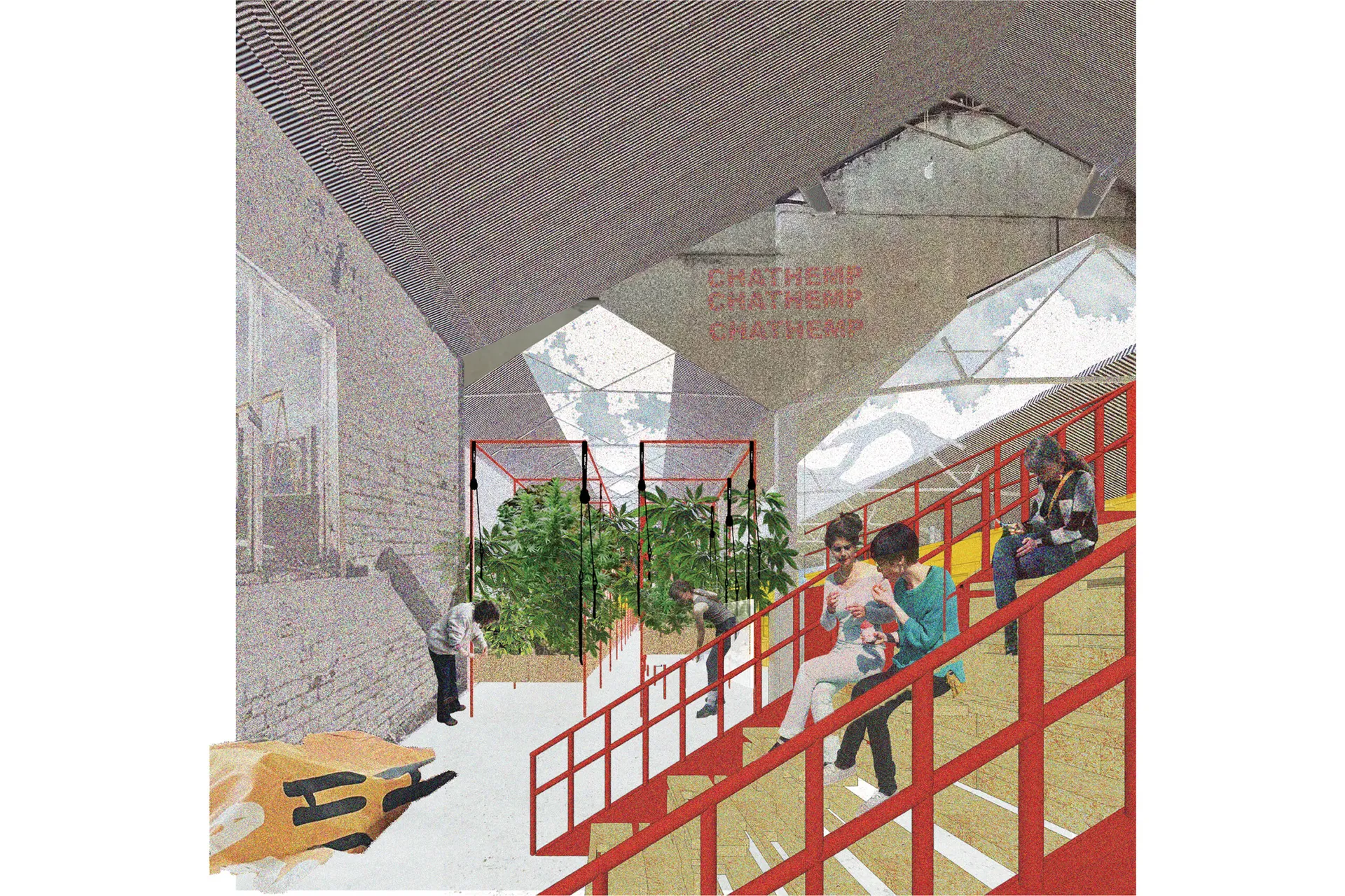 The Chatham hemp workshop introduces the community to hemp through farming the material on site. The building is open to the public, allowing for free socialising, exercise and activities, in hopes to provide the Chatham community with an accessible public space. The hemp plant farm and workshop will show the possibilities of the plant and the process of harvesting the plant into wood – seeing the product from start to finish. Courses will be taught in the workshop that focus on creating modular systems including tables, seating, plant containers and storage using hemp shiv sheets, creating employable skills for the youth community. The modular systems created could be used to fit out empty lets in Chatham, provide seating in public spaces and greenery for the city centre, with access to repairs at the workshop. The whole space is built using the modular system, showing public how accessible and usable the material is. The space will profit through selling the hemp wood systems at an affordable price, as well as through renting out studio spaces to young creatives.