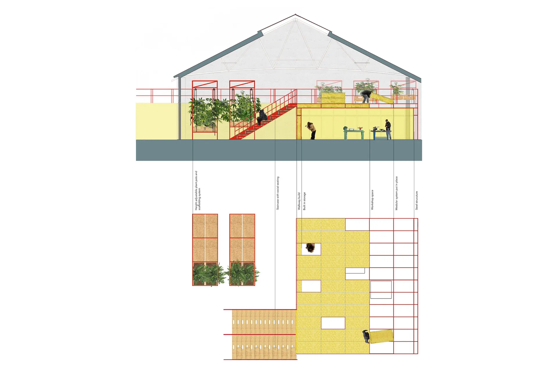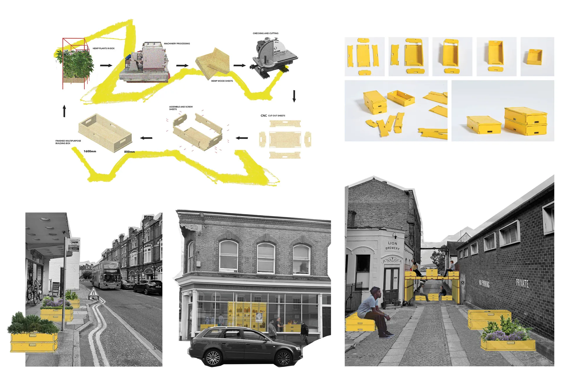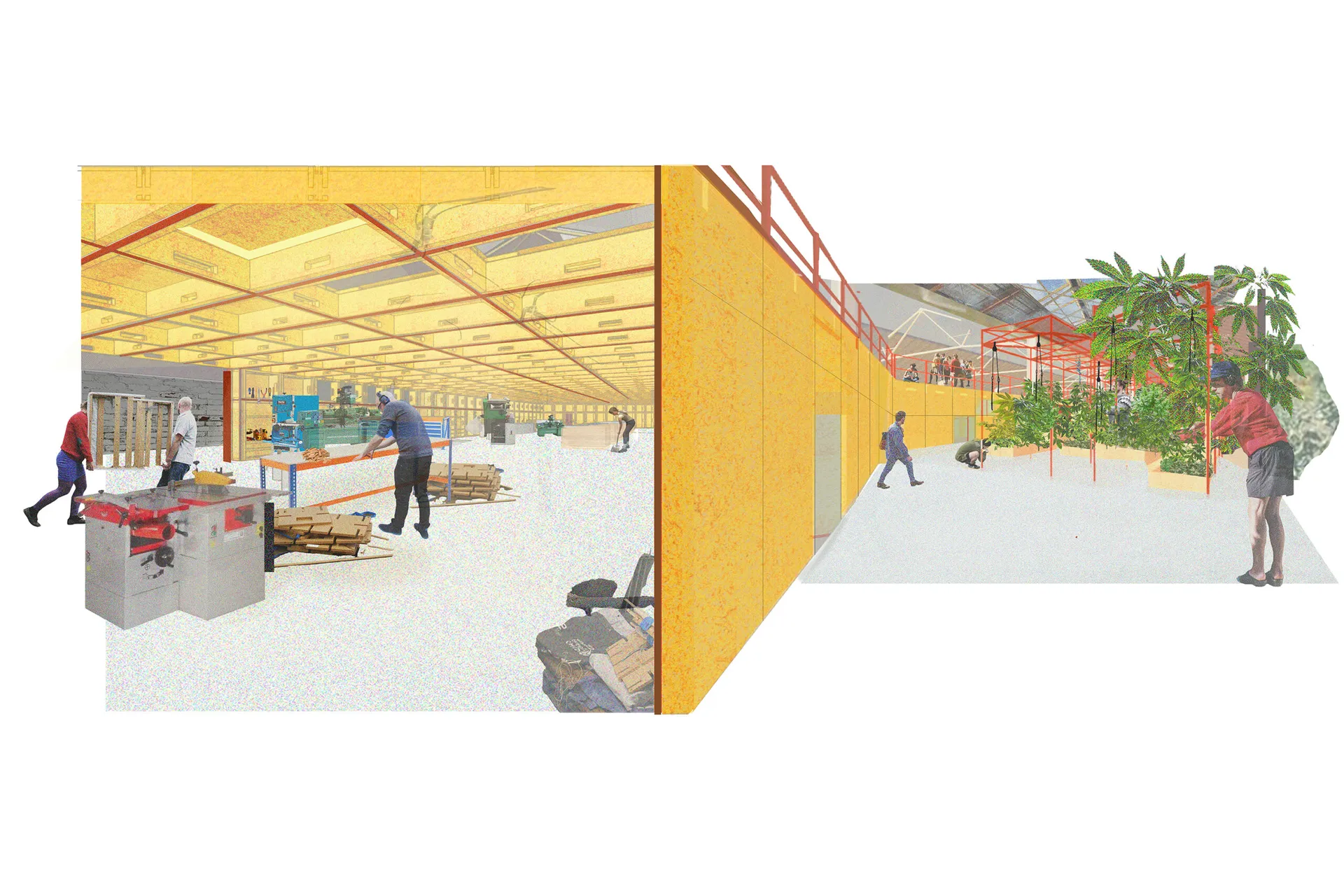 The Chatham hemp workshop introduces the community to hemp through farming the material on site. The building is open to the public, allowing for free socialising, exercise and activities, in hopes to provide the Chatham community with an accessible public space. The hemp plant farm and workshop will show the possibilities of the plant and the process of harvesting the plant into wood – seeing the product from start to finish. Courses will be taught in the workshop that focus on creating modular systems including tables, seating, plant containers and storage using hemp shiv sheets, creating employable skills for the youth community. The modular systems created could be used to fit out empty lets in Chatham, provide seating in public spaces and greenery for the city centre, with access to repairs at the workshop. The whole space is built using the modular system, showing public how accessible and usable the material is. The space will profit through selling the hemp wood systems at an affordable price, as well as through renting out studio spaces to young creatives.