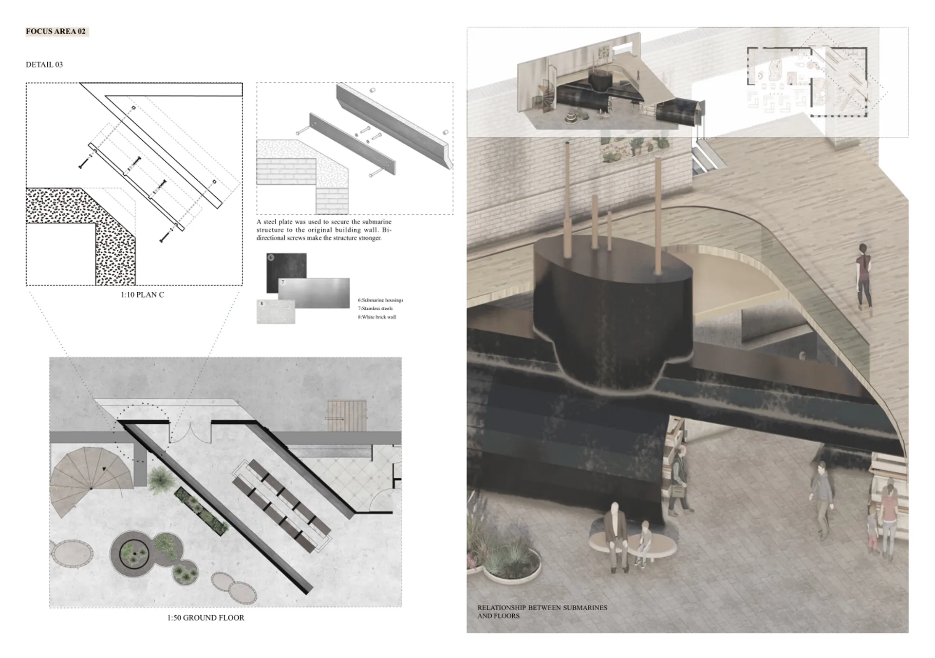 that the environment was very polluted due to long term heavy industry, so I used a lot of planting and recycling of submarine hulls and missile compartments in the design to