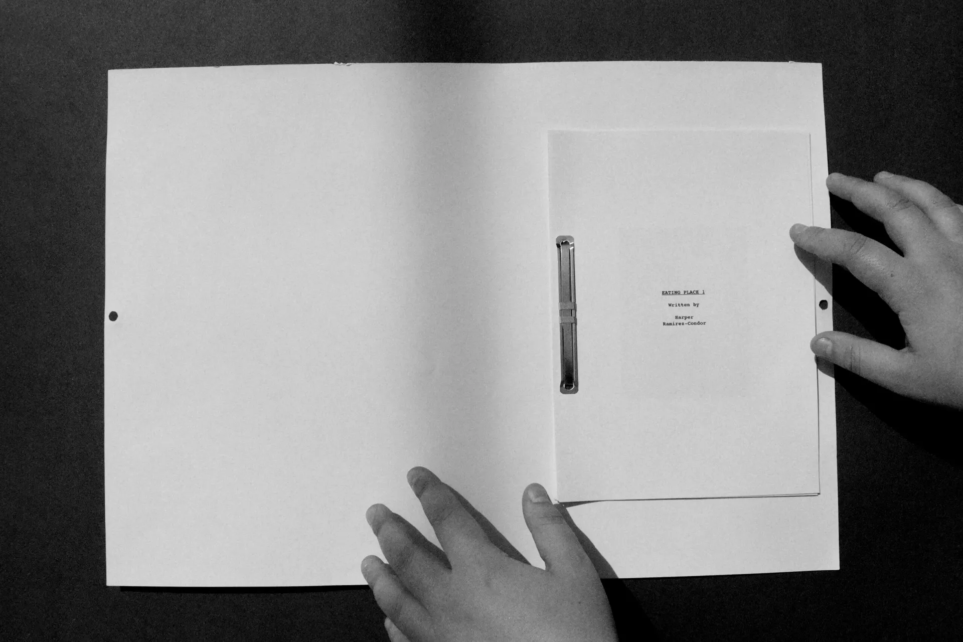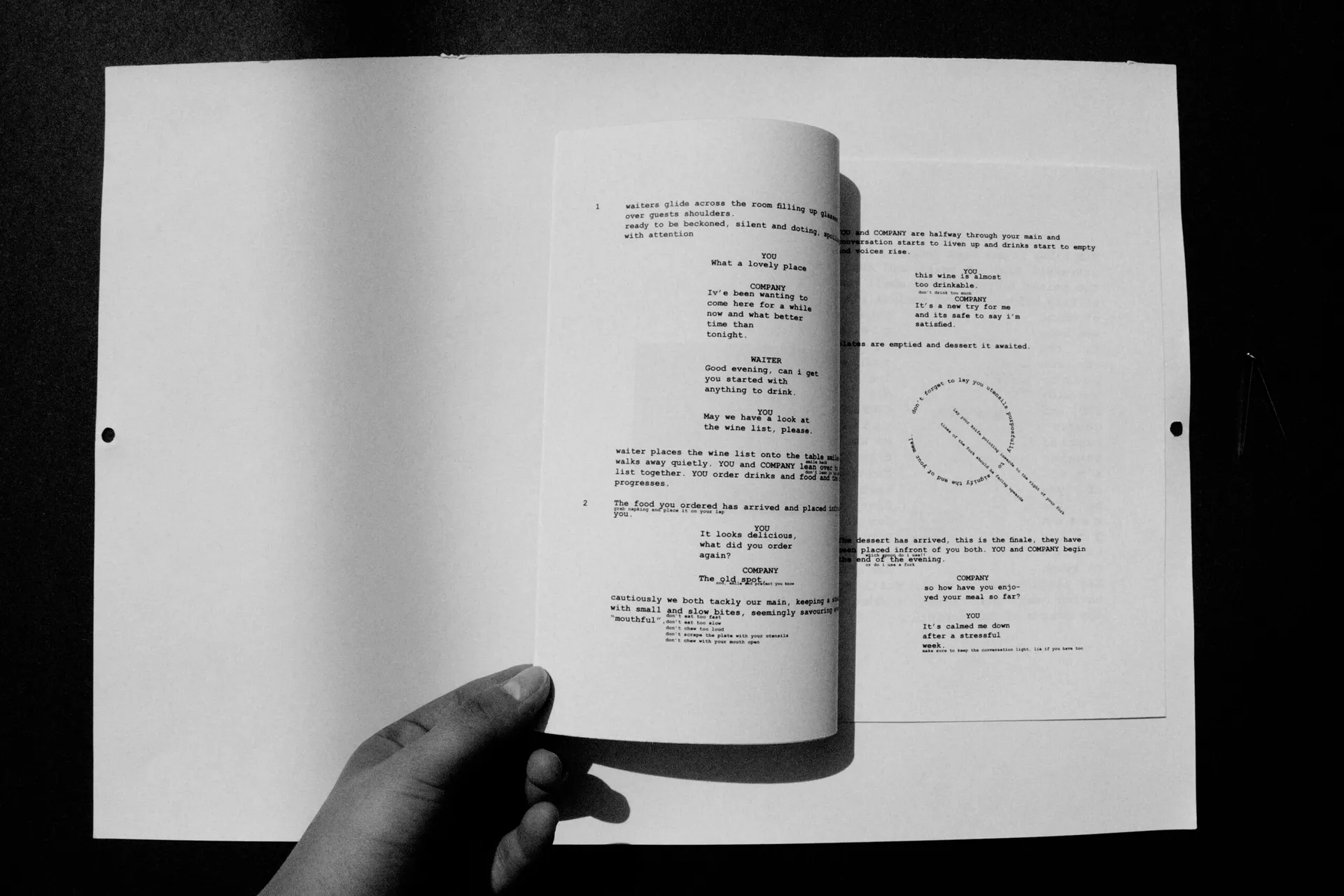 A publication commenting on the act of eating as a performance that changes depending on different environments. The printed matter employs a diagrammatic approach to typesetting with inspiration from concrete poetry to introduce movement. The internal dialogue of ‘the performer’ has been intertwined into the script format through small footnotes that hint at how to act in these differing situations. I want people to consider why they change their behaviour and the reasons for this. The form of the publication’s cover is reminiscent of a napkin and becomes a place mat to take you into these specific locations.