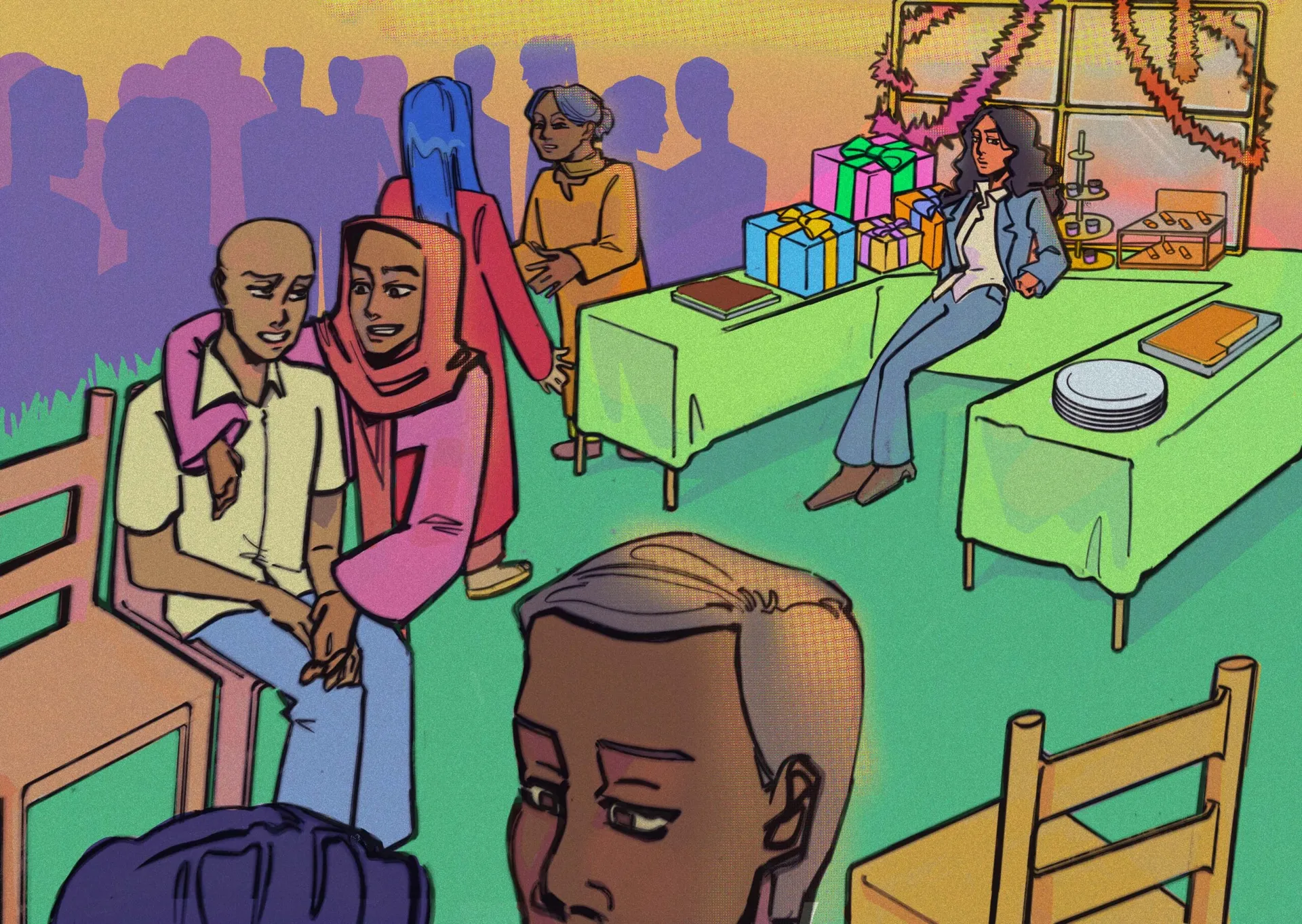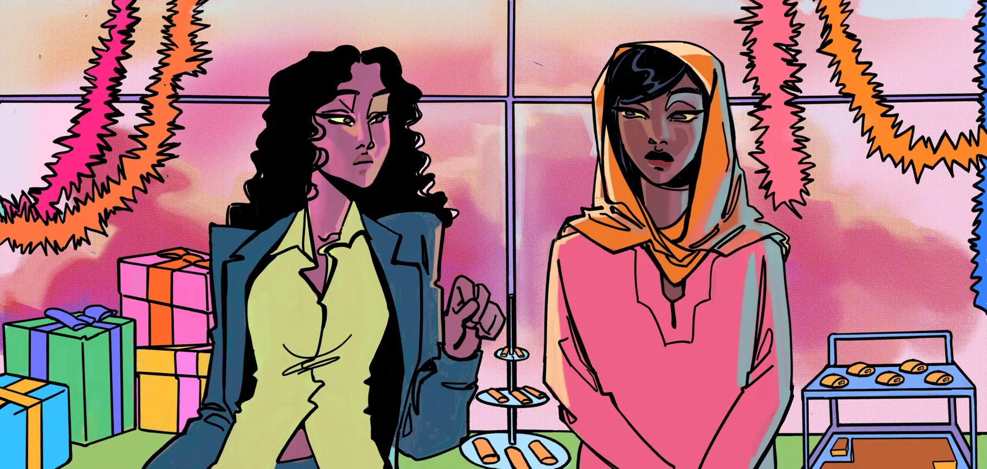 ‘Borderline Girls’ is an animated short inspired by sentiments of navigating through the discomfort of occupying an Abstract space within a tight-knit community . The kind of Collectivist community that is susceptible to stones from Glass houses. What happens when you divest from what is Desirable ? This short is about the awkward atmosphere of being in-between in a hyper traditional space – a wedding, while being at crossroads with yourself and where you want to go.
