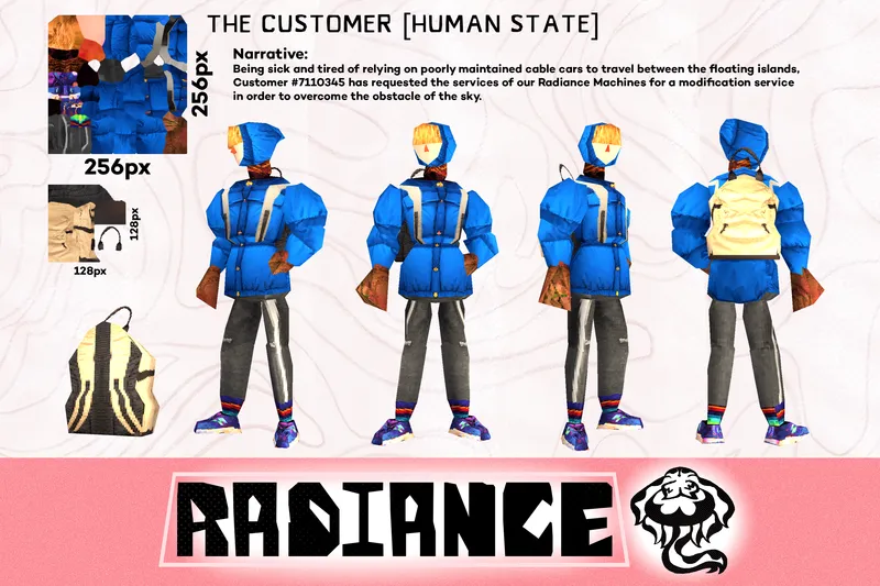Radiance is a short 3D animation where a customer requests the services of a Radiance vending machine to modify their body to overcome the challenges posed by the urban landscape and the sky.