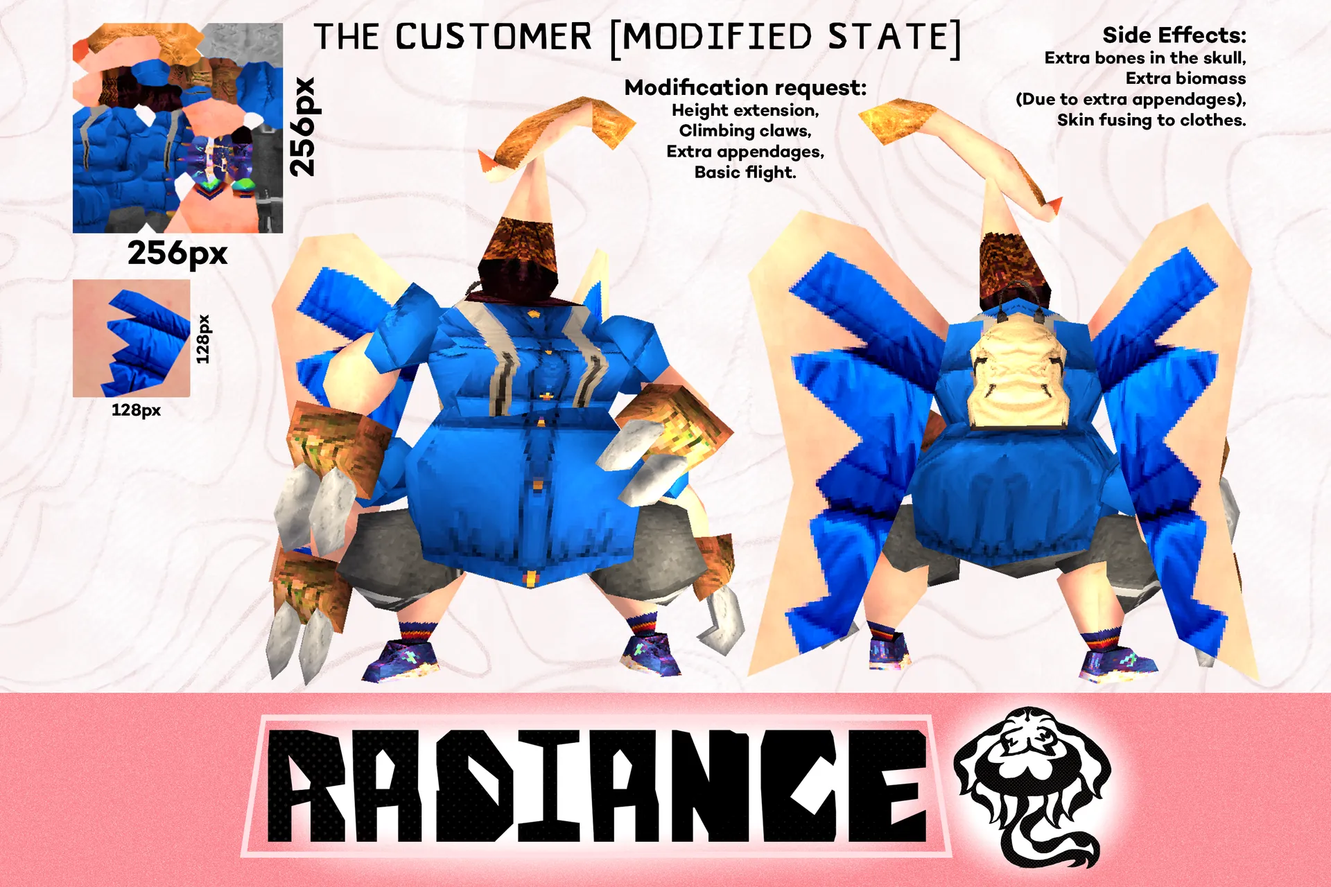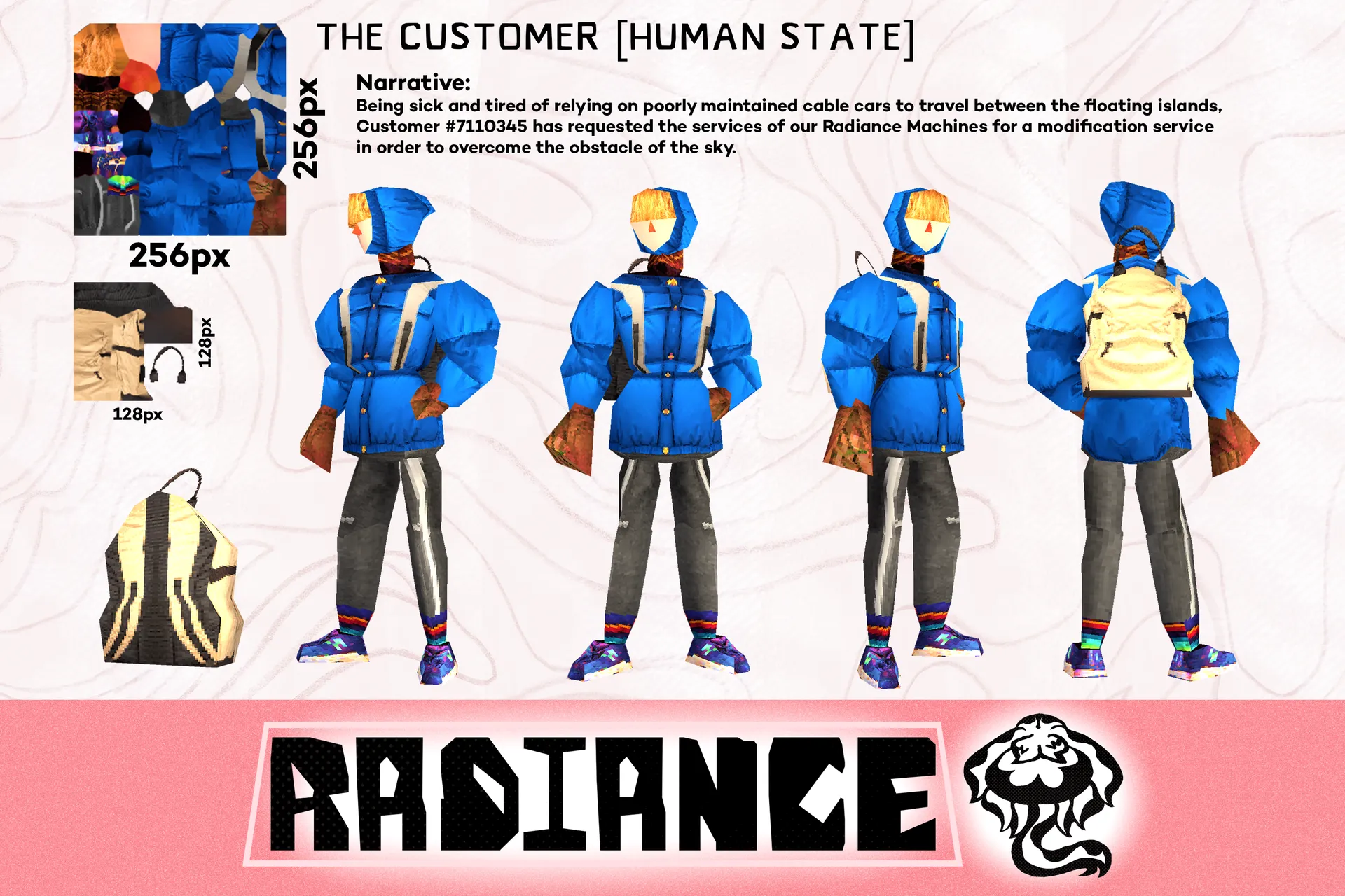 Radiance is a short 3D animation where a customer requests the services of a Radiance vending machine to modify their body to overcome the challenges posed by the urban landscape and the sky.