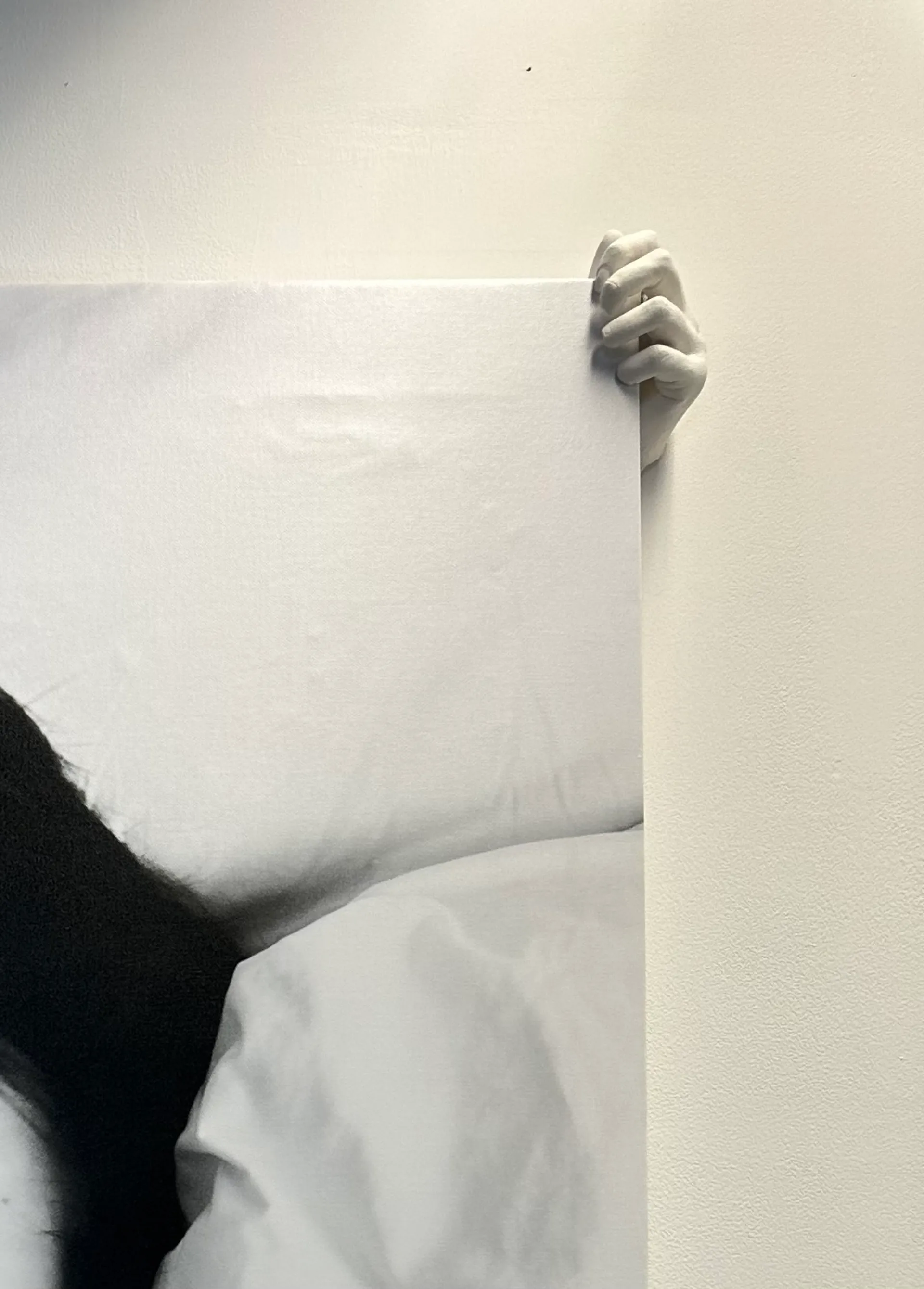 ‘I’m every sparkling woman’ depicts the sleeping and vulnerable figure of the artist while being propped up