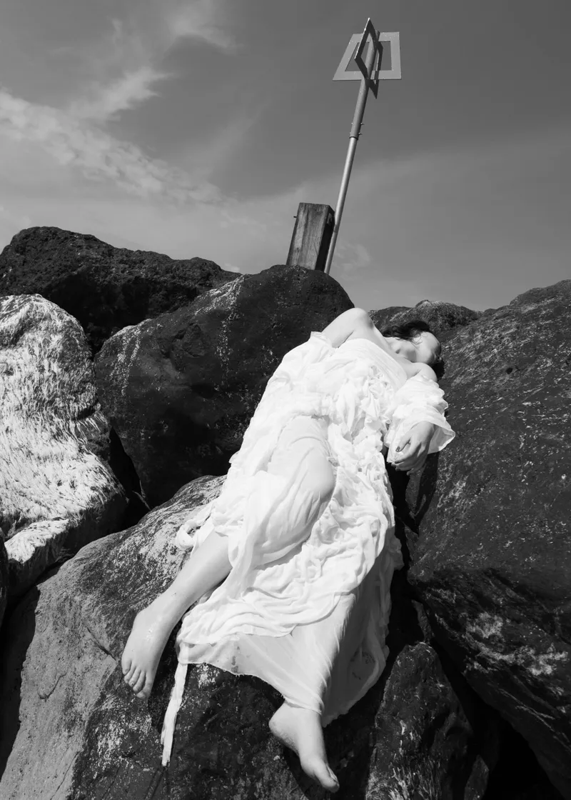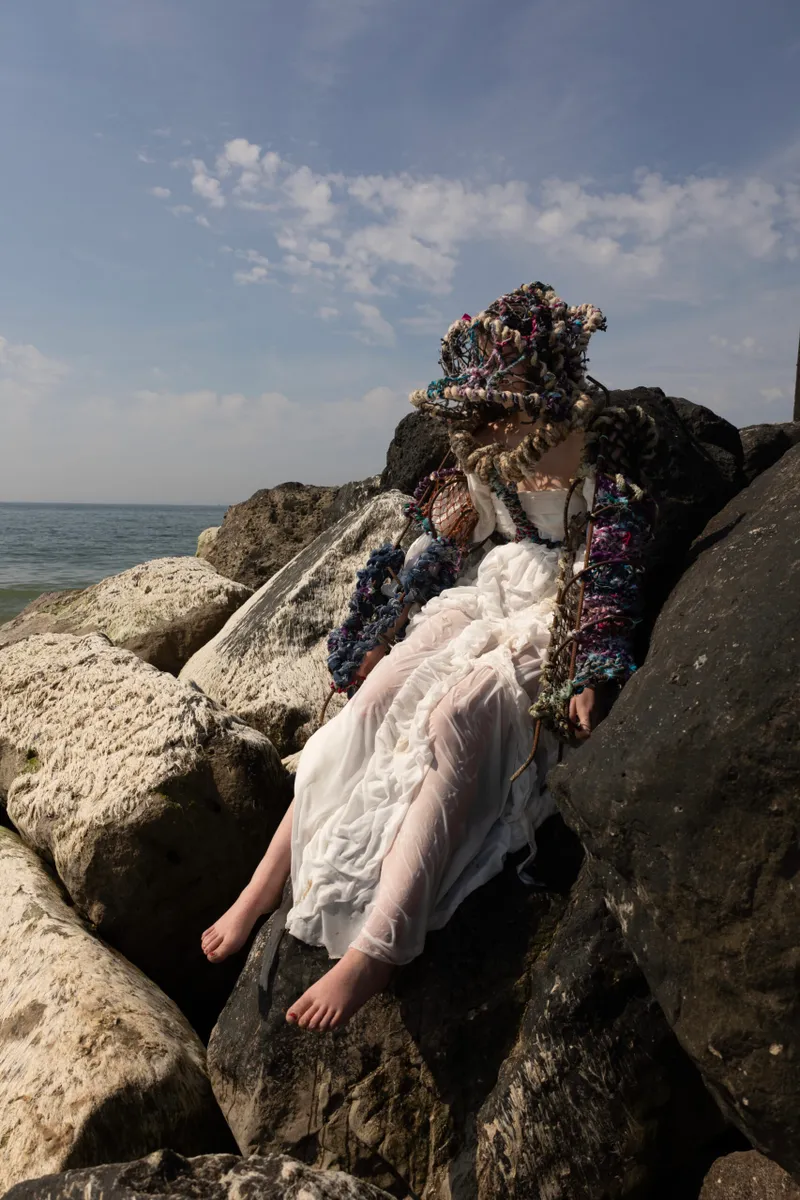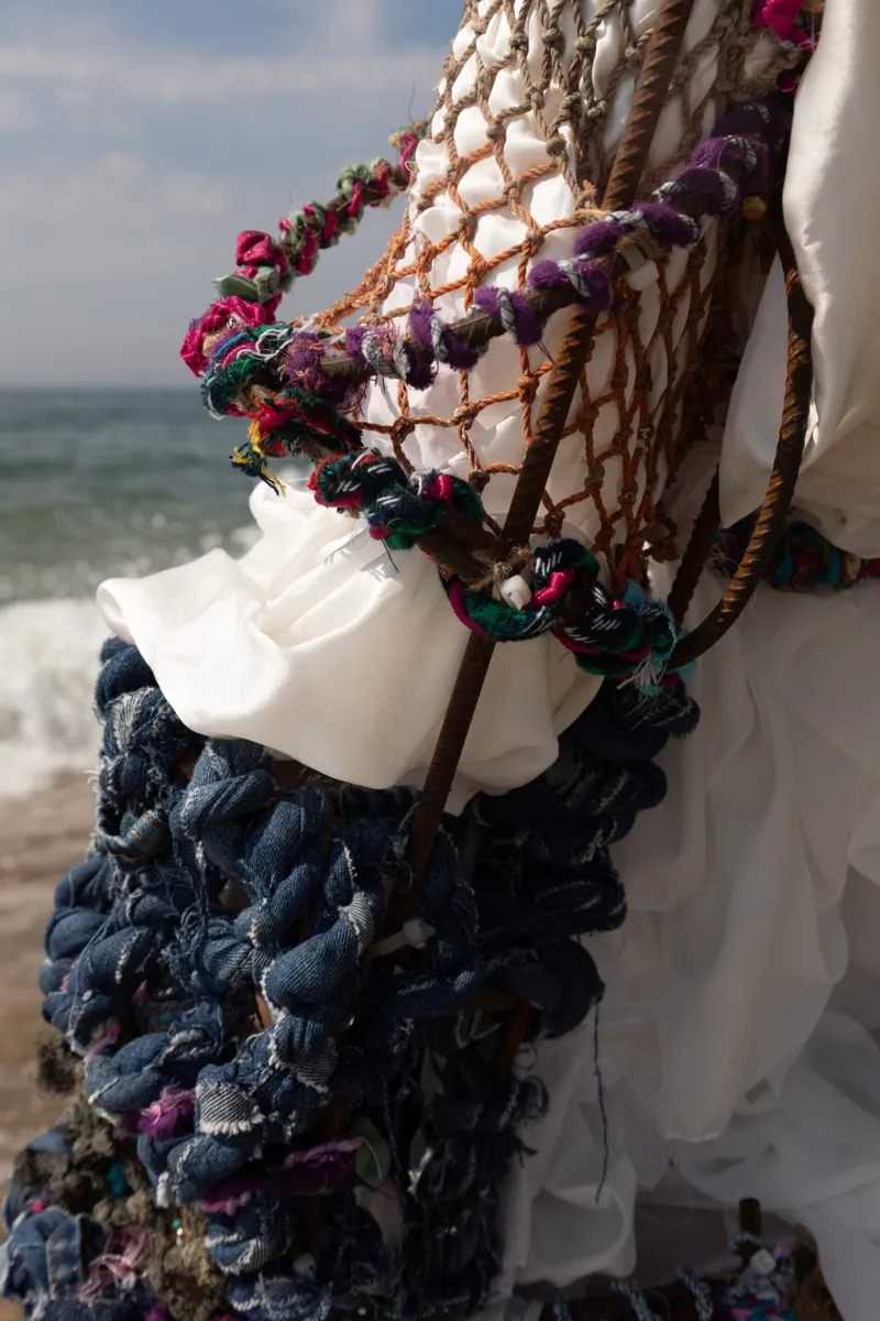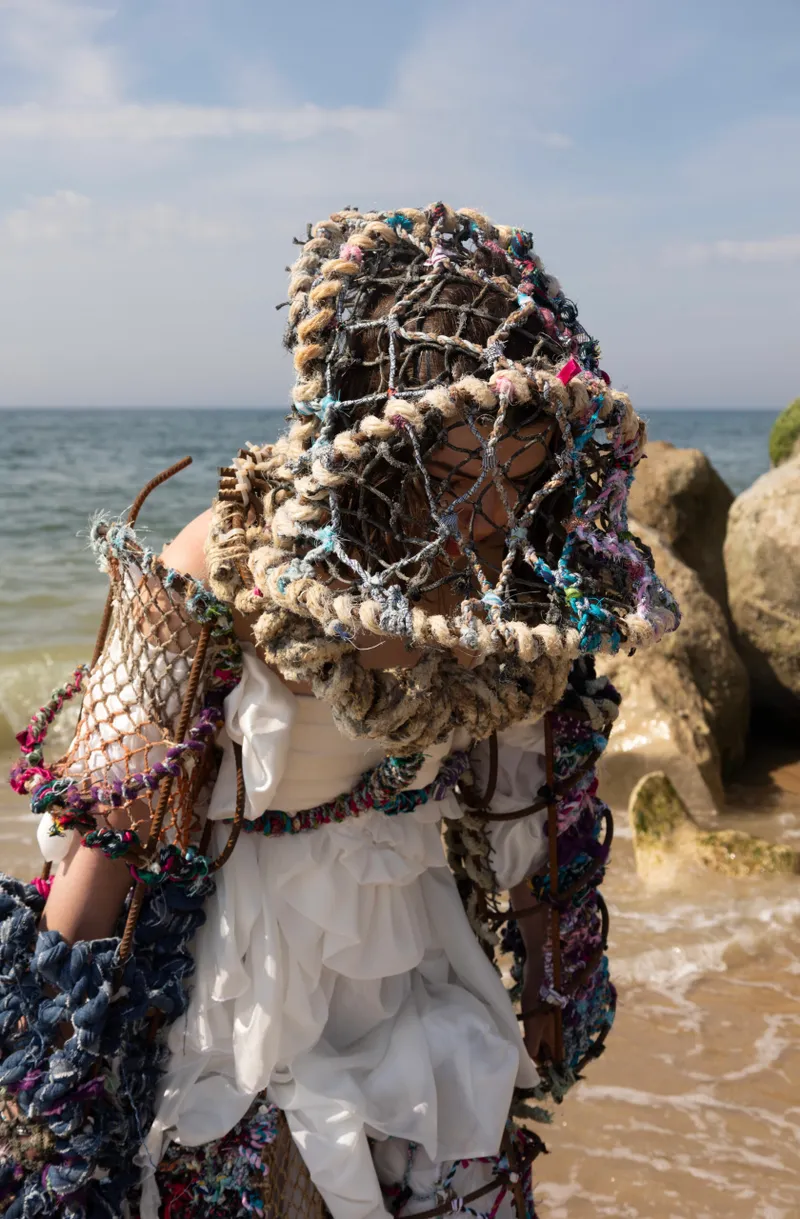 The concept for this garment is to provoke a reaction of shock, realisation, empathy and identification in those who exploit the oceans or eat fish. I have done this by showing an innocent human in a state of discomfort similar to what marine life may experience when caught in ghost fishing gear. This identification with the suffering of marine life hopes to encourage a reduction in consumption and an improvement in the sustainability of fishing practices. Ghost gear is discarded or lost fishing equipment which remains in the sea and continues fishing for hundreds of years, catching many thousands of marine creatures needlessly and causing huge environmental damage and suffering.
