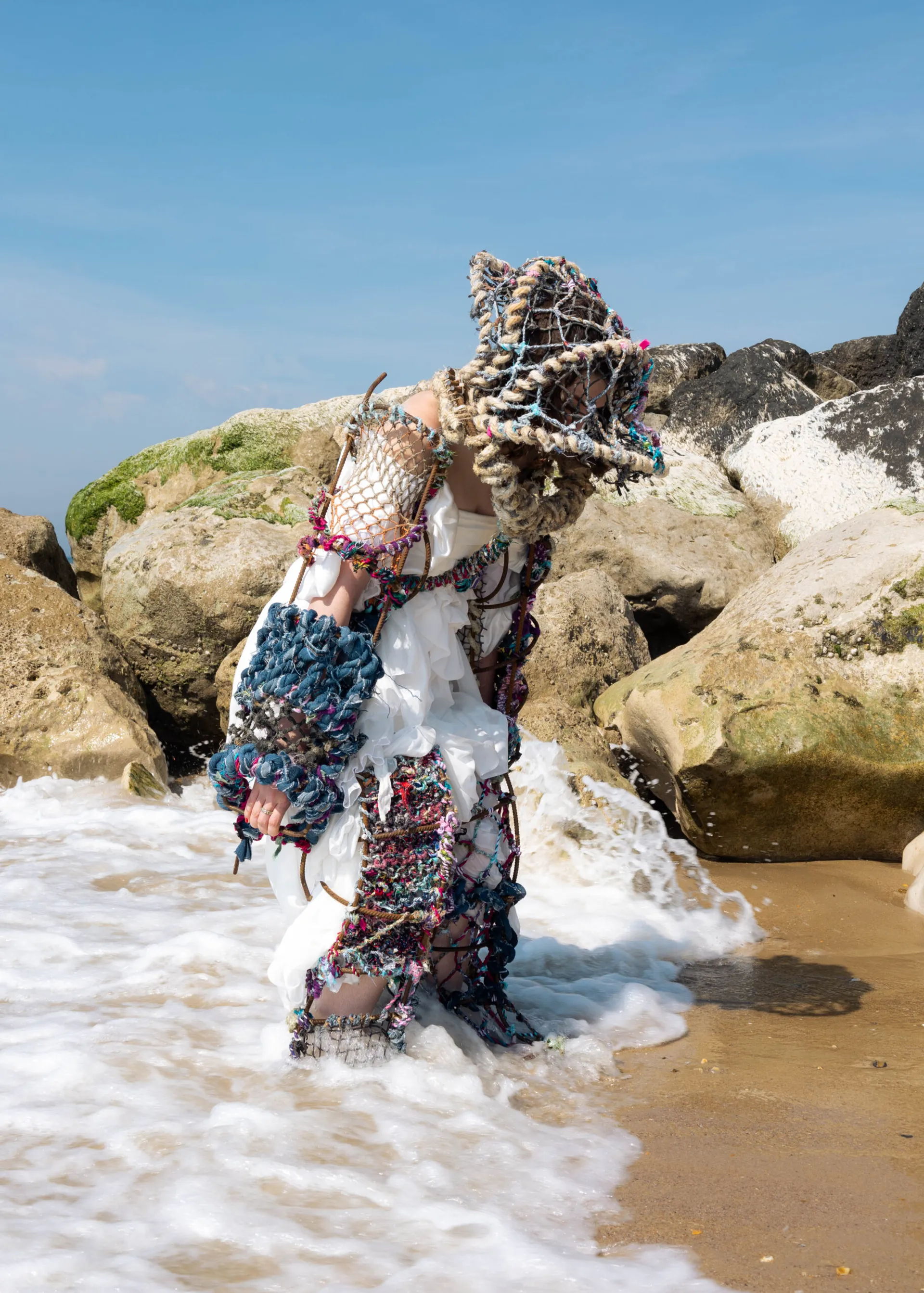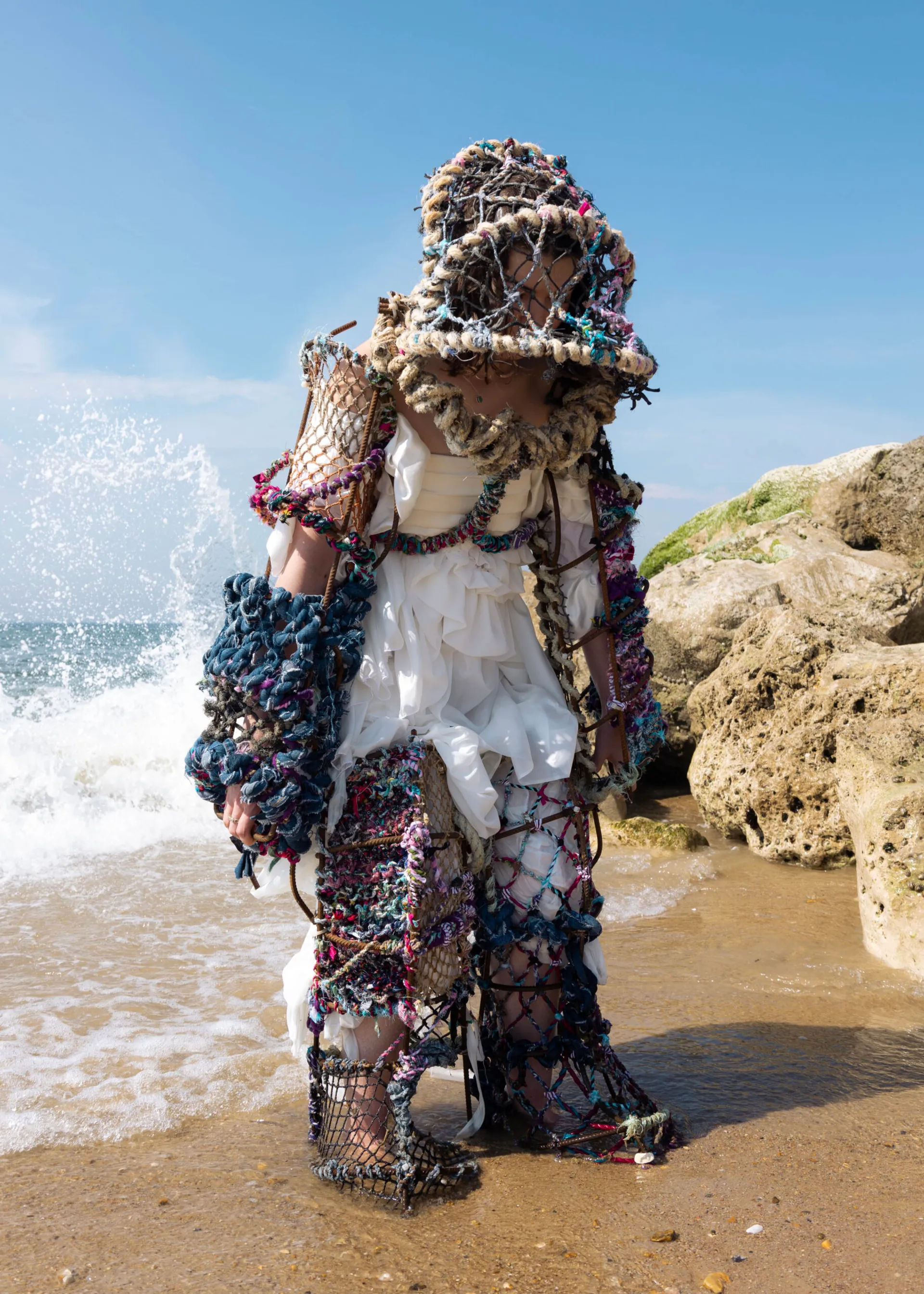 The concept for this garment is to provoke a reaction of shock, realisation, empathy and identification in those who exploit the oceans or eat fish. I have done this by showing an innocent human in a state of discomfort similar to what marine life may experience when caught in ghost fishing gear. This identification with the suffering of marine life hopes to encourage a reduction in consumption and an improvement in the sustainability of fishing practices. Ghost gear is discarded or lost fishing equipment which remains in the sea and continues fishing for hundreds of years, catching many thousands of marine creatures needlessly and causing huge environmental damage and suffering.
