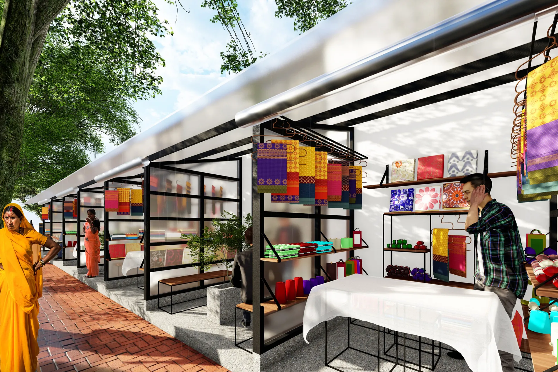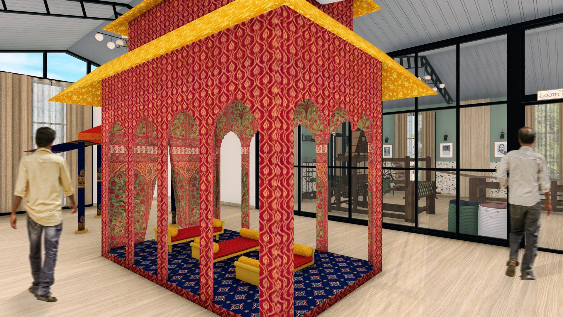 For centuries, handloom weaving has been used to weave traditional outfits in India. Handwoven fabric serves as a powerful tool for storytelling and expression. The decline of traditional handloom weaving is due to low wages from middlemen and competition from mass-produced goods. Weavers tend to push their children to seek higher-paying jobs, further contributing to the decline of the art. This project aims to preserve this legacy by incorporating handwoven fabrics into modern interiors. The first element is a training and workshop facility that transfers knowledge through live project engagement under the guidance of a master weaver. The second element is an Interactive public installation that explores weaving as an architectural element, extending beyond its traditional role as a textile craft. Traditional weaving is combined with modern technology to revive and expand the practice into multidisciplinary fields, exemplified by the third element which is a fabric wall hanging used for wall paneling.