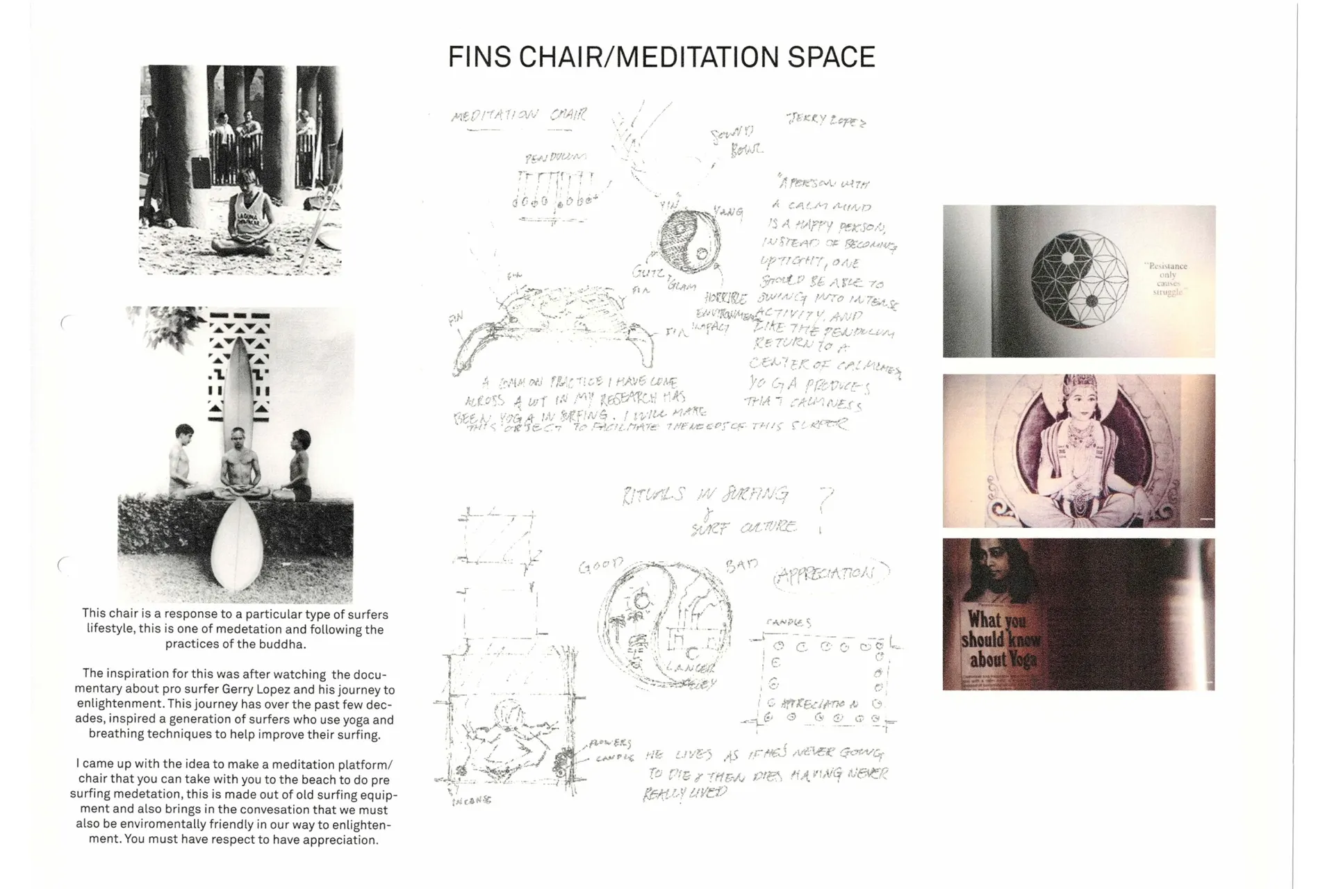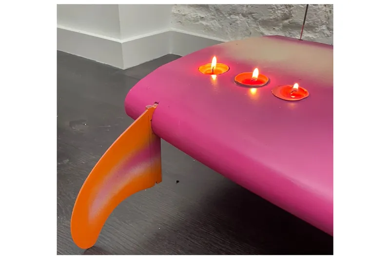 As a surfer I cherish the experience of sitting in the ocean, harnessing the power of the waves and feeling the raw motion of gliding along an unbroken peeling, glassy wall. The equipment we use for the sport of surfing is readily available and mostly an affordable package – board, fins, leash, wetsuit, and wax etc. Big companies market the beach lifestyle in a seductive way, with sun kissed images of sandy beaches and tropical blue waters. But behind this facade is a sinister untold story. Many of the materials are damaging to the environment and not easily recycled. For example, the foam that is used in surfboards is a chemical material that is hard to reuse. My project is designed to bring attention to this issue and offer a small but potential solution, by reusing and recycling unwanted and discarded surf equipment, giving the materials a second life. My journey to research, observe and design a new surf-related product has uncovered two distinct and opposing beach and ocean worlds: The tranquil and spiritual surfer’s lifestyle vs landfill sites, microplastics and rubbish laden beaches. This is the yin and yang of the surf industry today.