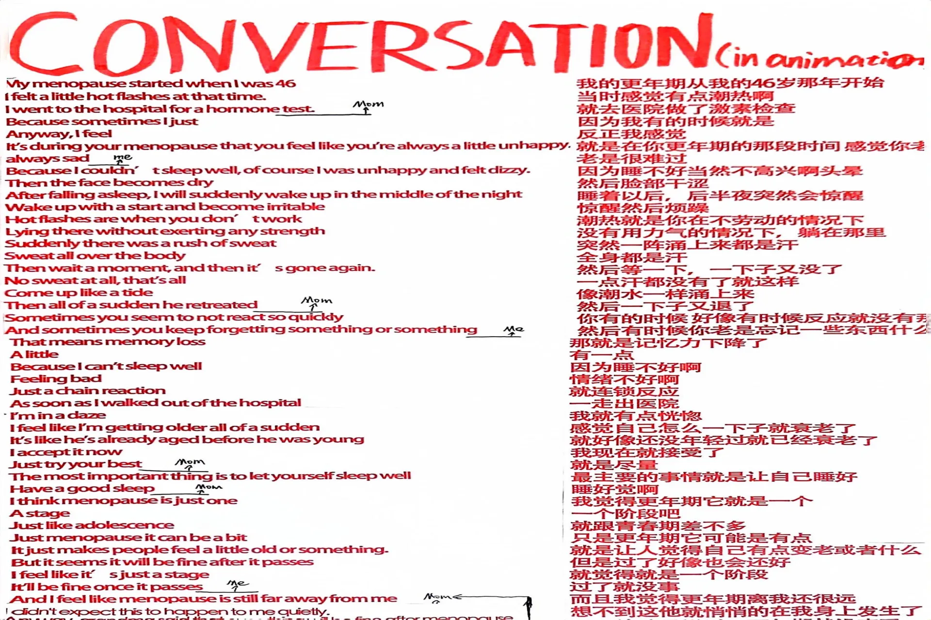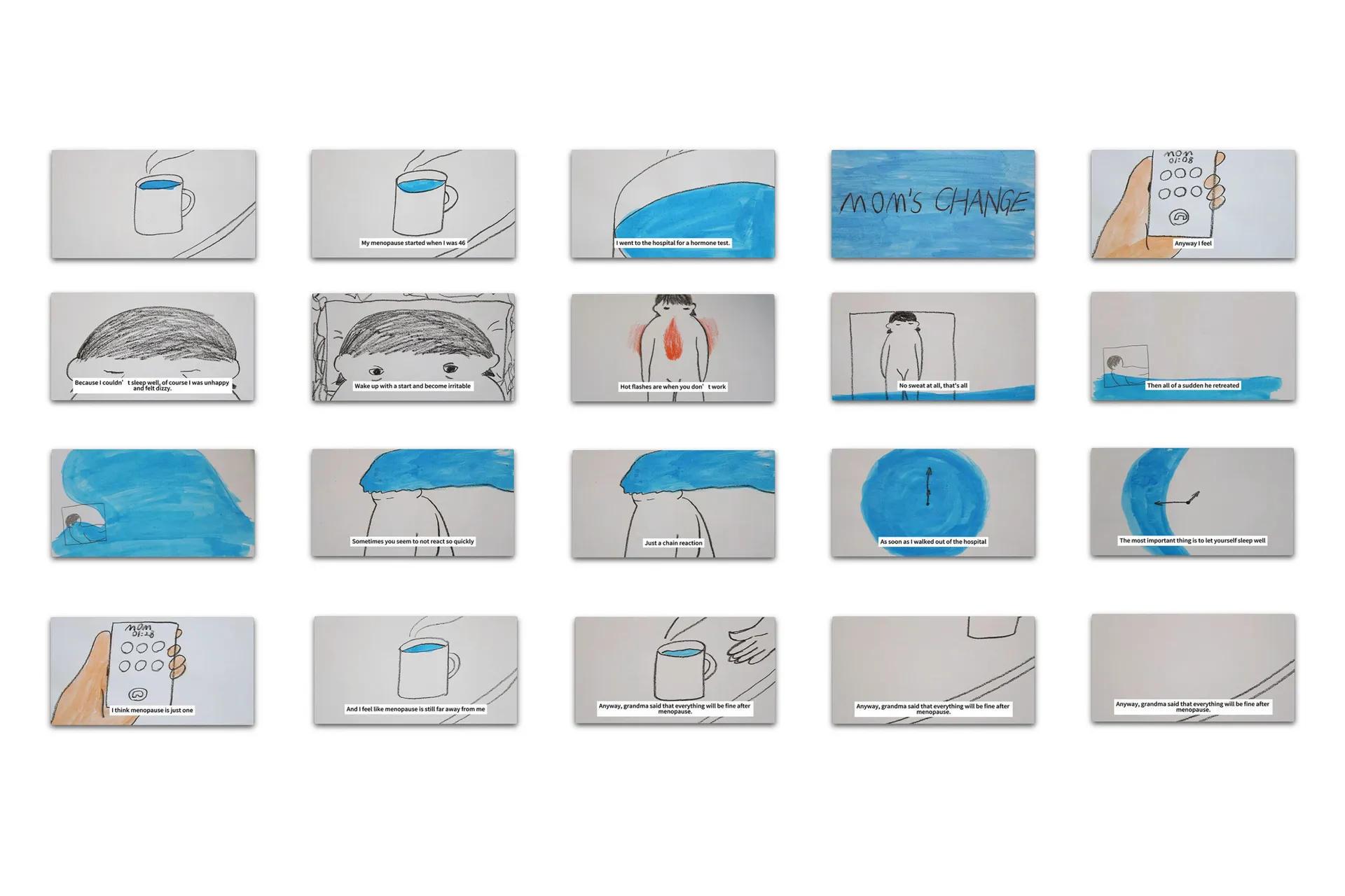 The project revolves around women’s menopause, which is a natural life cycle, but public misunderstandings about menopause make women more anxious and nervous during menopause. I wanted to use my conversations with my mom about menopause to illustrate the symptoms and psychological changes that women face during menopause. My mother and I represent women at two different stages. I represent people who have not yet gone through menopause, and my mother represents people who are going through menopause. I want to use these two perspectives to express how different people feel about menopause. And I want to use this animation to show the changes in menopausal women’s mentality when facing menopause, from anxiety to acceptance to relief. I want to use the changes in the characters in the animation and my visualization of menopausal symptoms to allow people to more intuitively feel the feelings that menopause brings to women. I also hope that women who are going through menopause can empathize with them. Let’s learn more about what menopause is really like. I hope more people can understand menopause and pay attention to and understand menopausal women. I hope to encourage more women who have experienced menopause to boldly share their experiences, express their worries, and reduce anxiety about menopause.