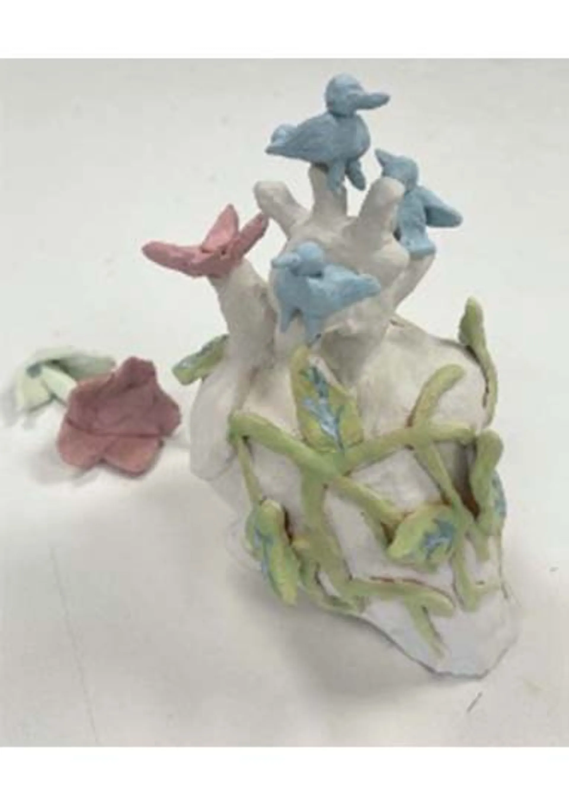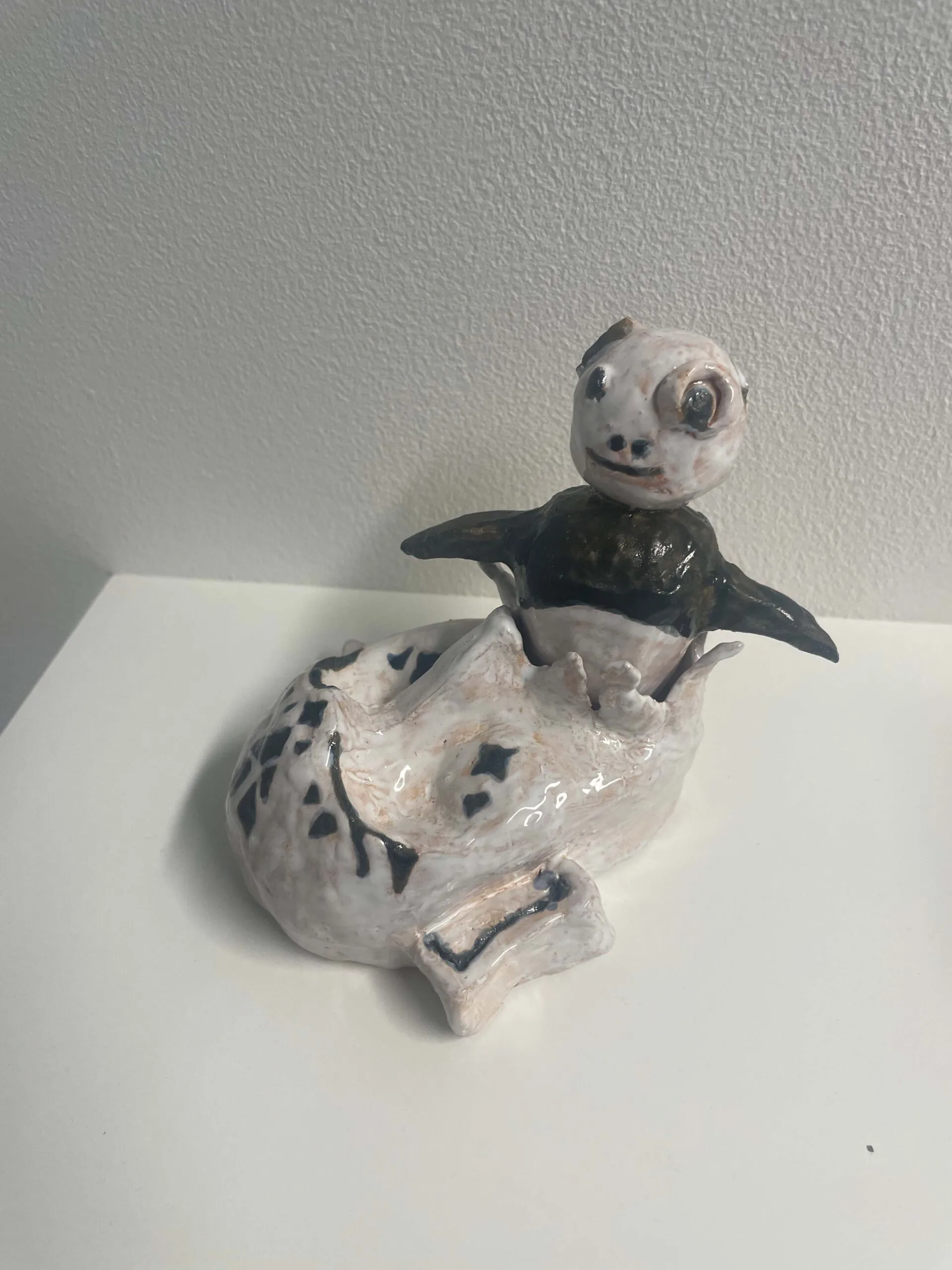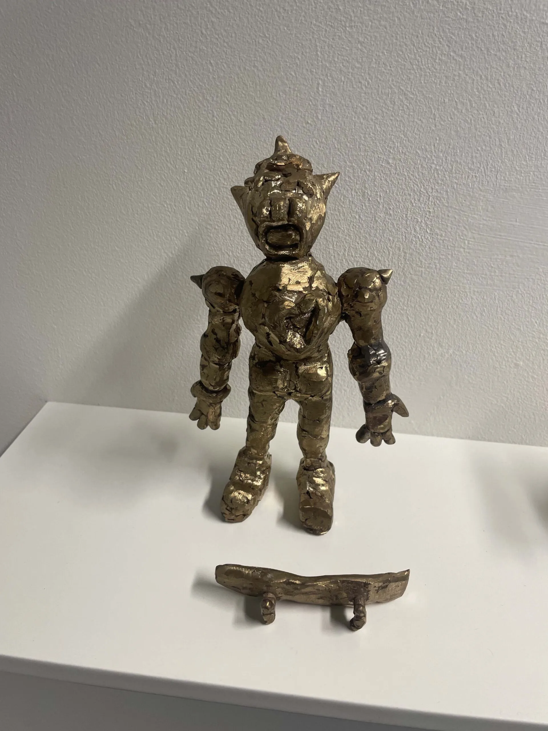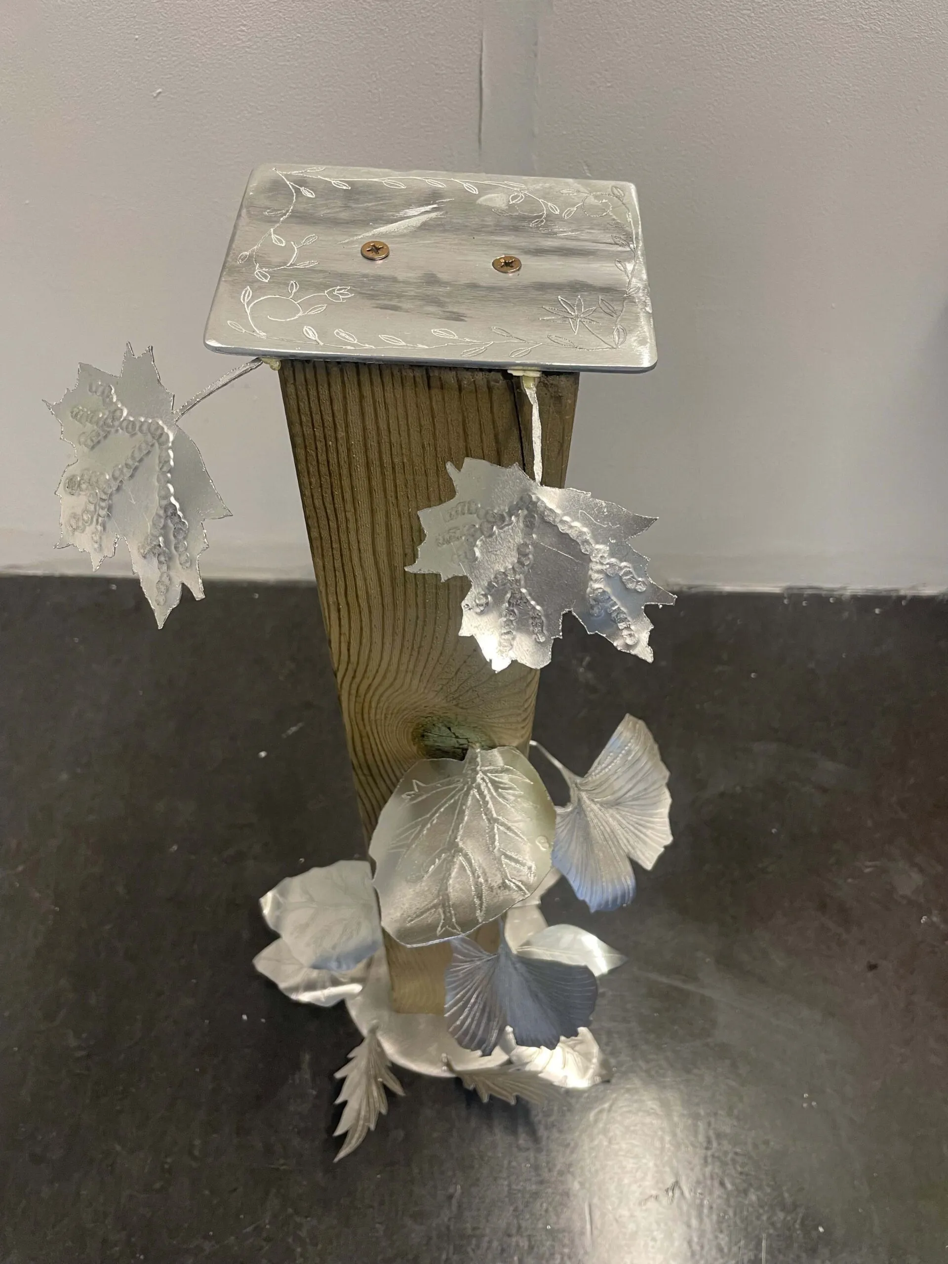 I experimented on different mediums such as bronze, a ceramic and aluminium. Tangible nature’s shape is transformed into aluminium leaves that have shine surface. These materials can represent how nature’s pattern is dynamically undulating with tactile surface quality. I made bronze sculpture that looks like mischievous mouse that rides skateboard. I depicted joyful moment of playing sports and naughty children who behaves in slightly bad way through mouse character. I made two ceramic sculpture: panda popping out of human’s mouth and heart organ enveloped by leaves. First ceramic represents animal’s kinship to humans as if panda kiss and hug with humans. Second ceramic represents that organisms in nature symbioses with humans.