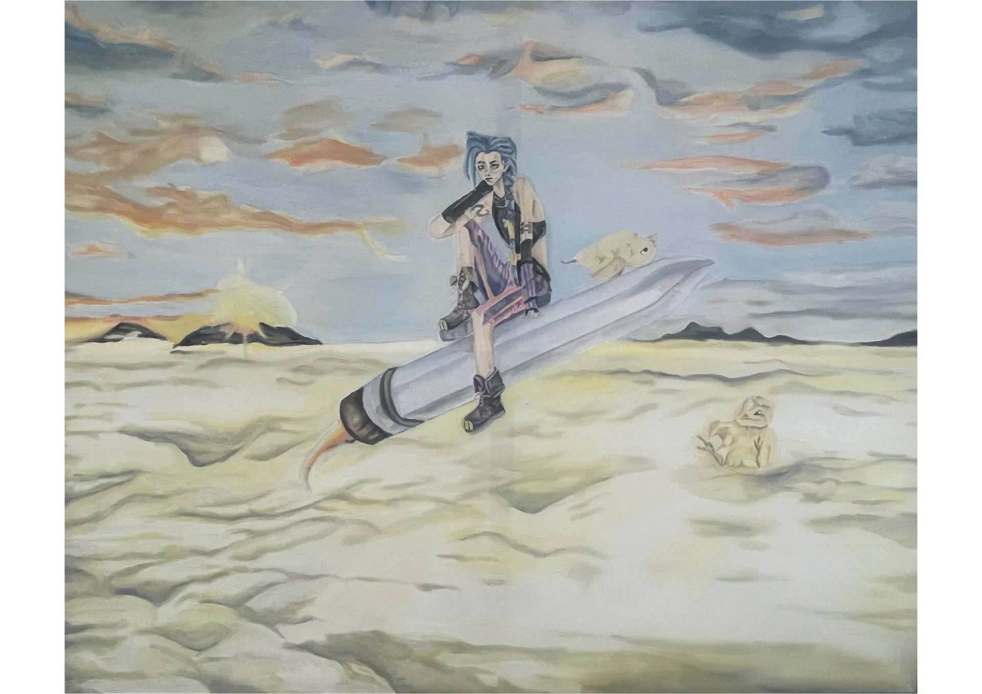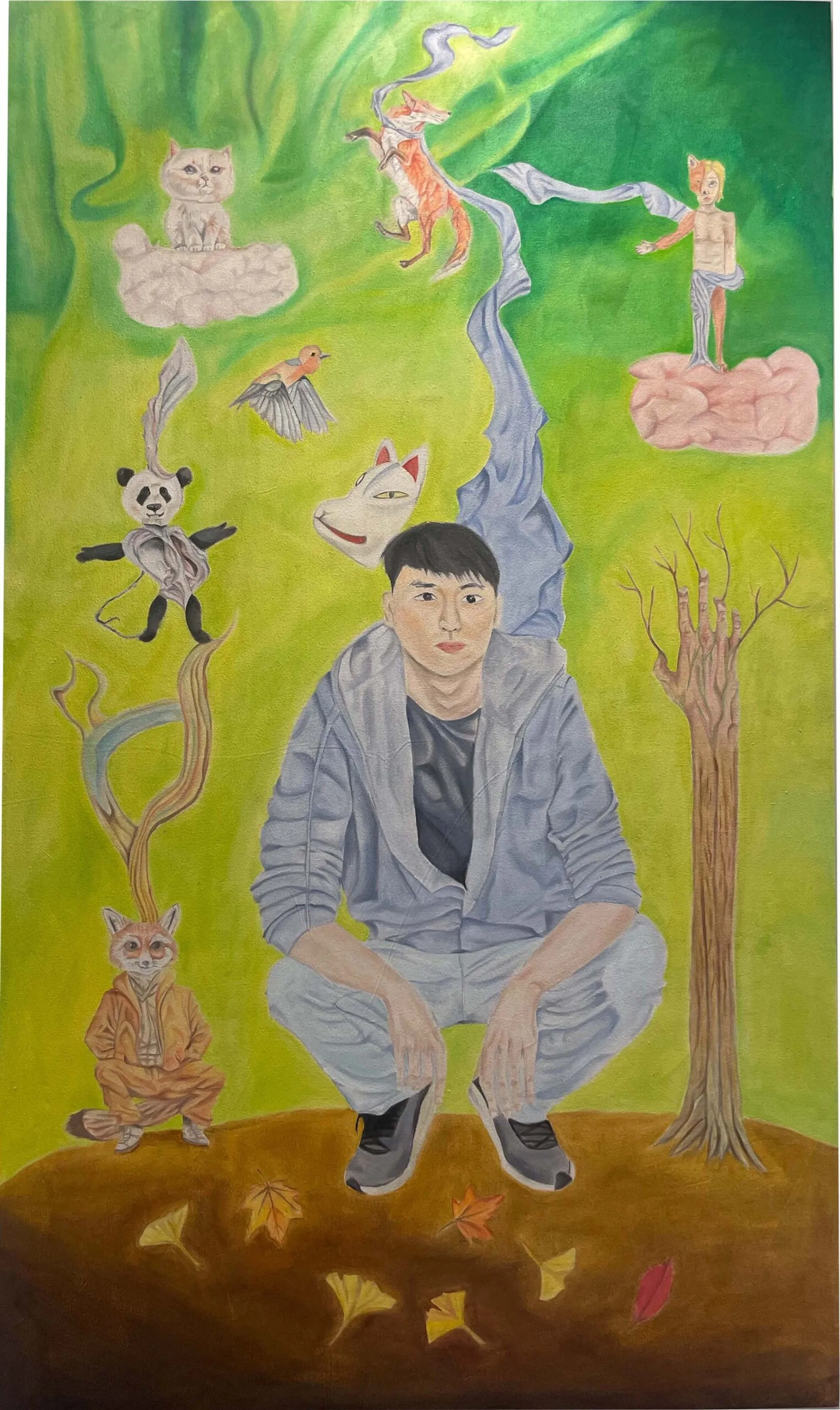 My theme is to explore anthropomorphic surrealist world. I used symbol of objects and animals that interact with humans in painting. I was inspired by Shamanic culture that respects spirits of nature and animals. Ancient people believe spiritual world where humans and animals live at peace. I depicted fantasy world where humans are metamorphosed to animals as if humans imitate animal’s behaviour and understand animal’s language. I drew animal characters that feature cute appearance, evoking heartwarming emotion. I painted self-portrait surrounded by mythical characters that imply human-animal hybrid. Each animal has different symbols in the painting to create narrative such as adaptation to different culture. Another painting is criticizing social issues such as desensitization to violence by juxtaposing a chick, a a girl, rocket, each of which represent opposite symbol: vulnerability and powerfulness.