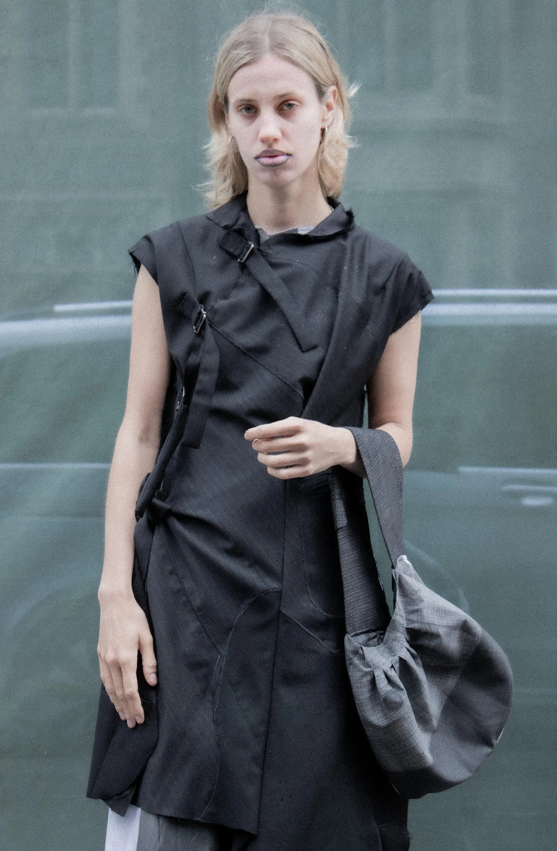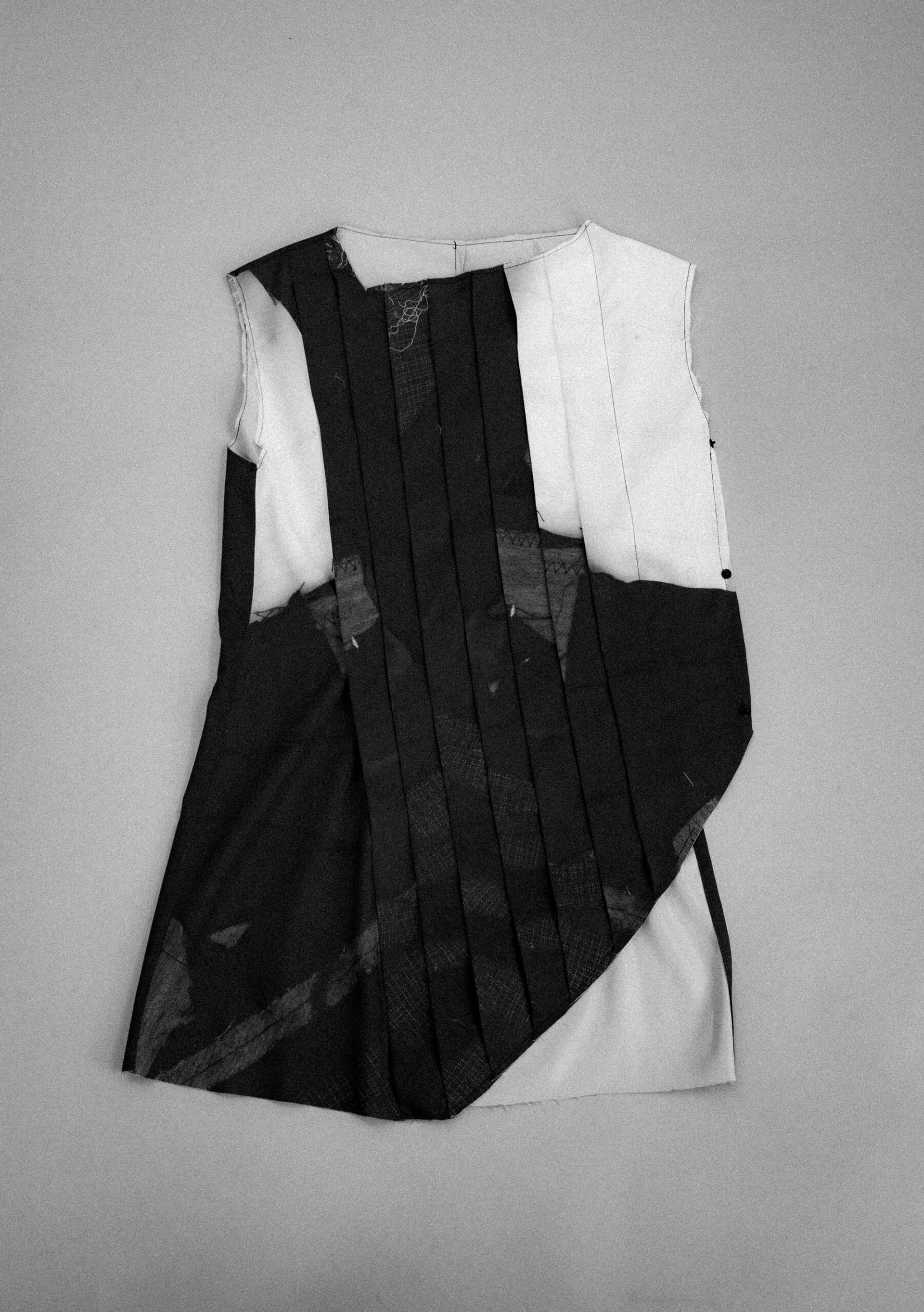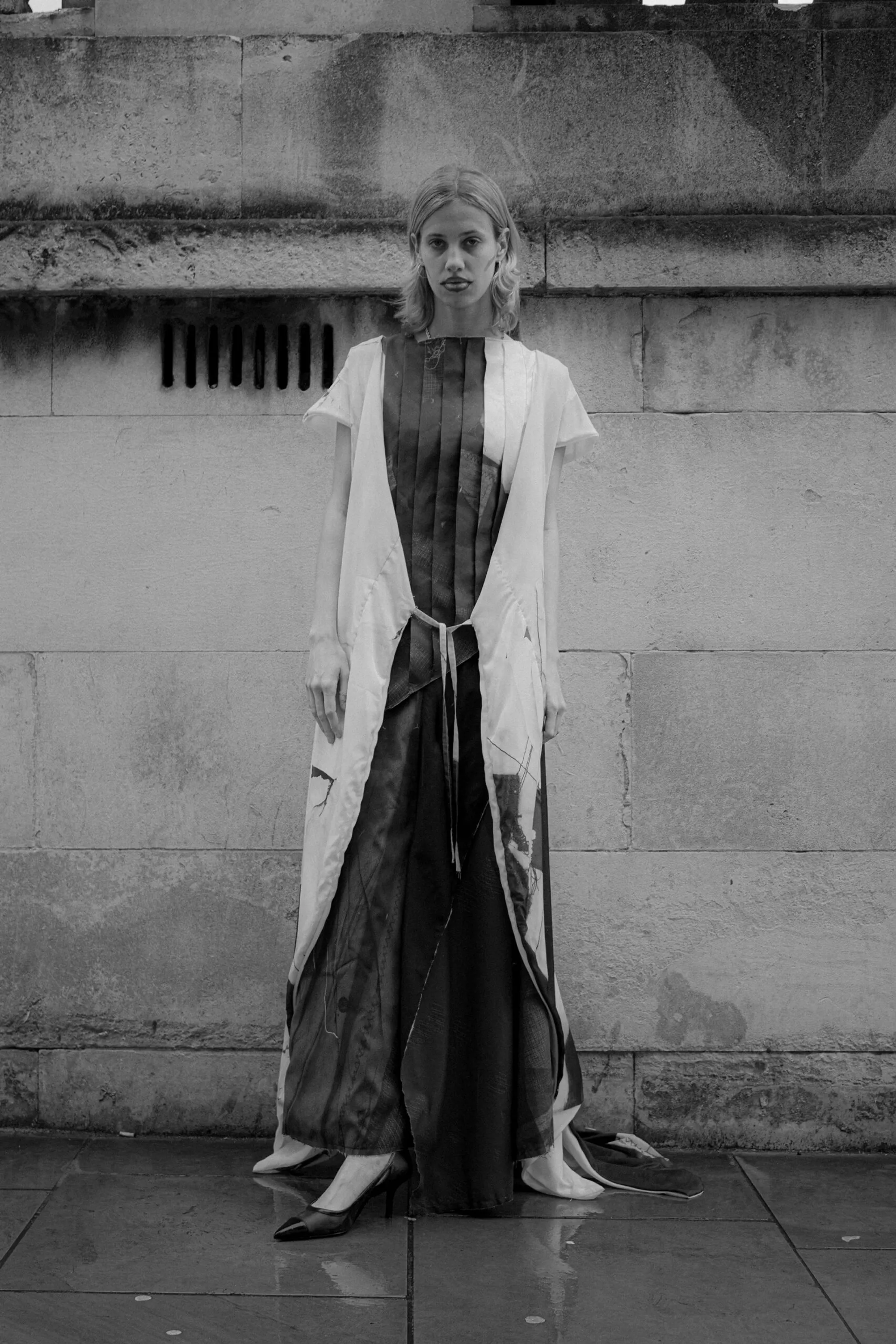 Infused with digital material scanning, the print development acts to compress the traditional material, in a bid to reject the lack of comfort found within classic office tailoring, and its masculine connotations. Finishing techniques across the wool materials were developed to further enhance this rejection material remnants and loose garment panels were converted into bags to ensure no wasted material, while catering the collection to a woman’s functional needs.