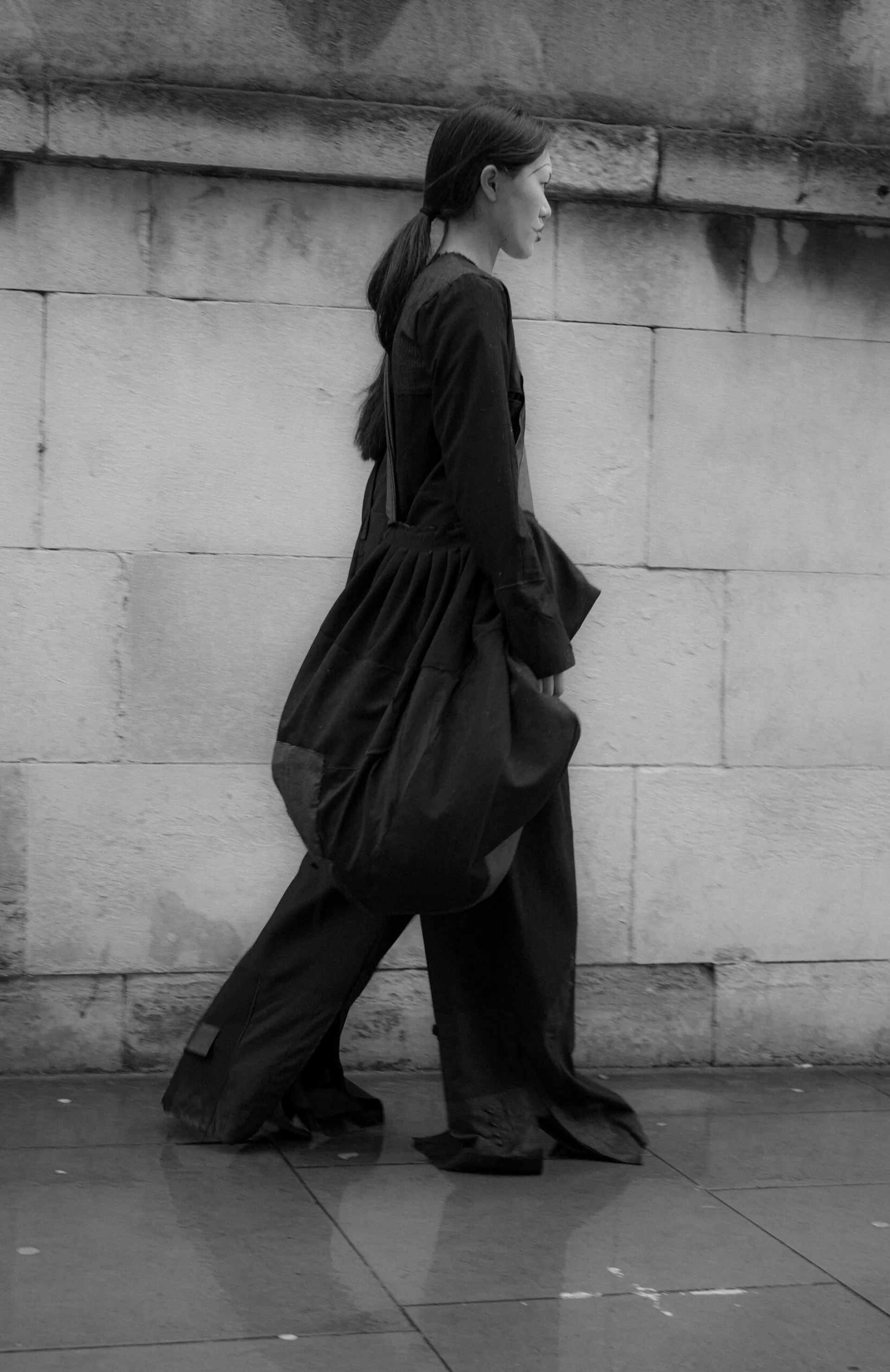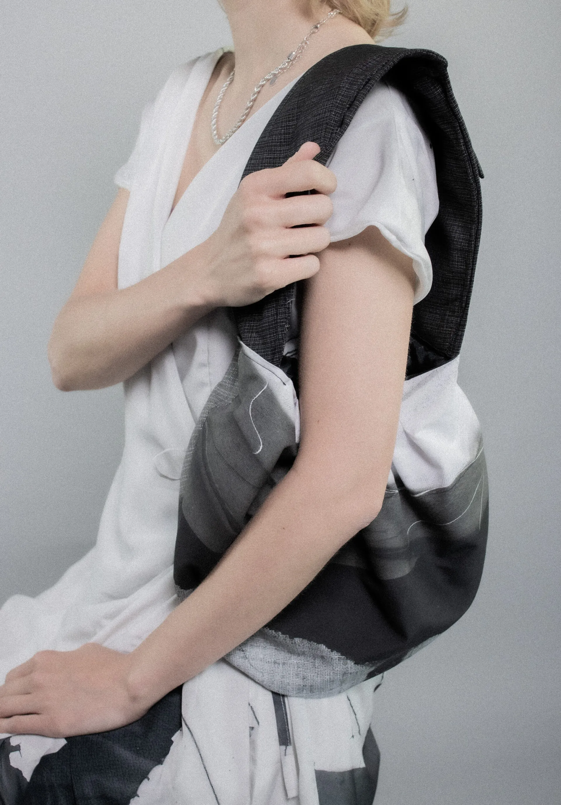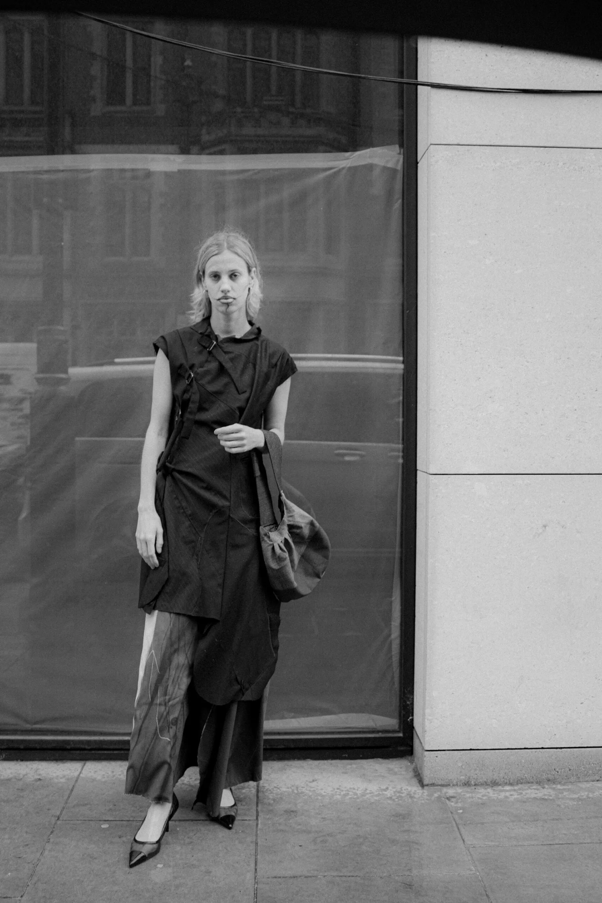 Infused with digital material scanning, the print development acts to compress the traditional material, in a bid to reject the lack of comfort found within classic office tailoring, and its masculine connotations. Finishing techniques across the wool materials were developed to further enhance this rejection material remnants and loose garment panels were converted into bags to ensure no wasted material, while catering the collection to a woman’s functional needs.