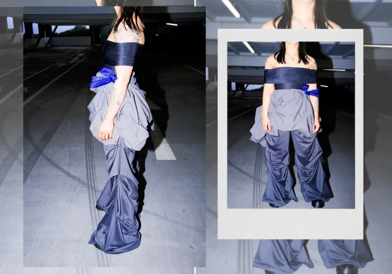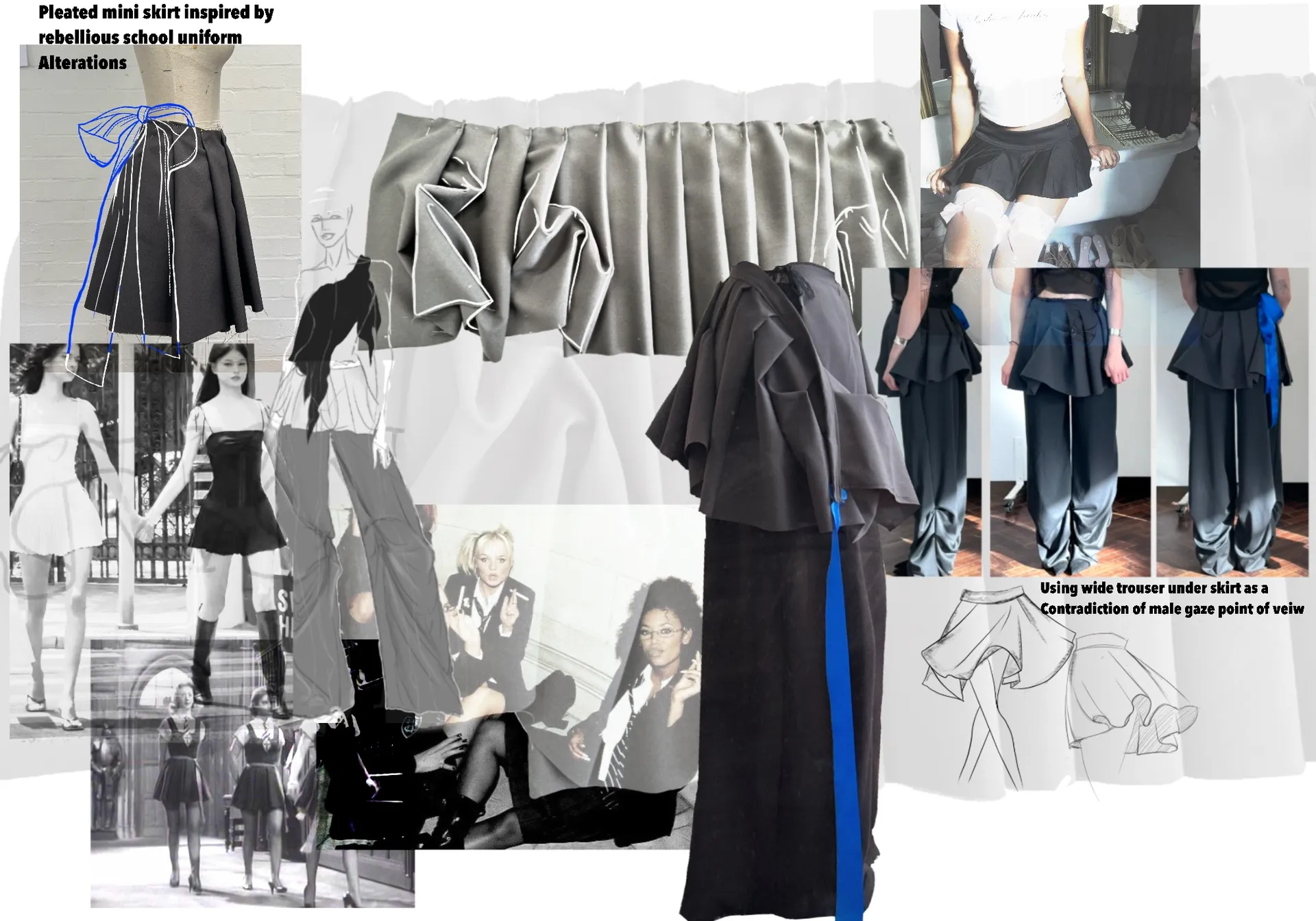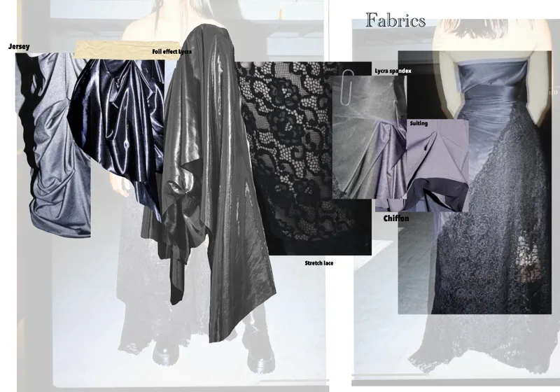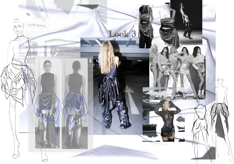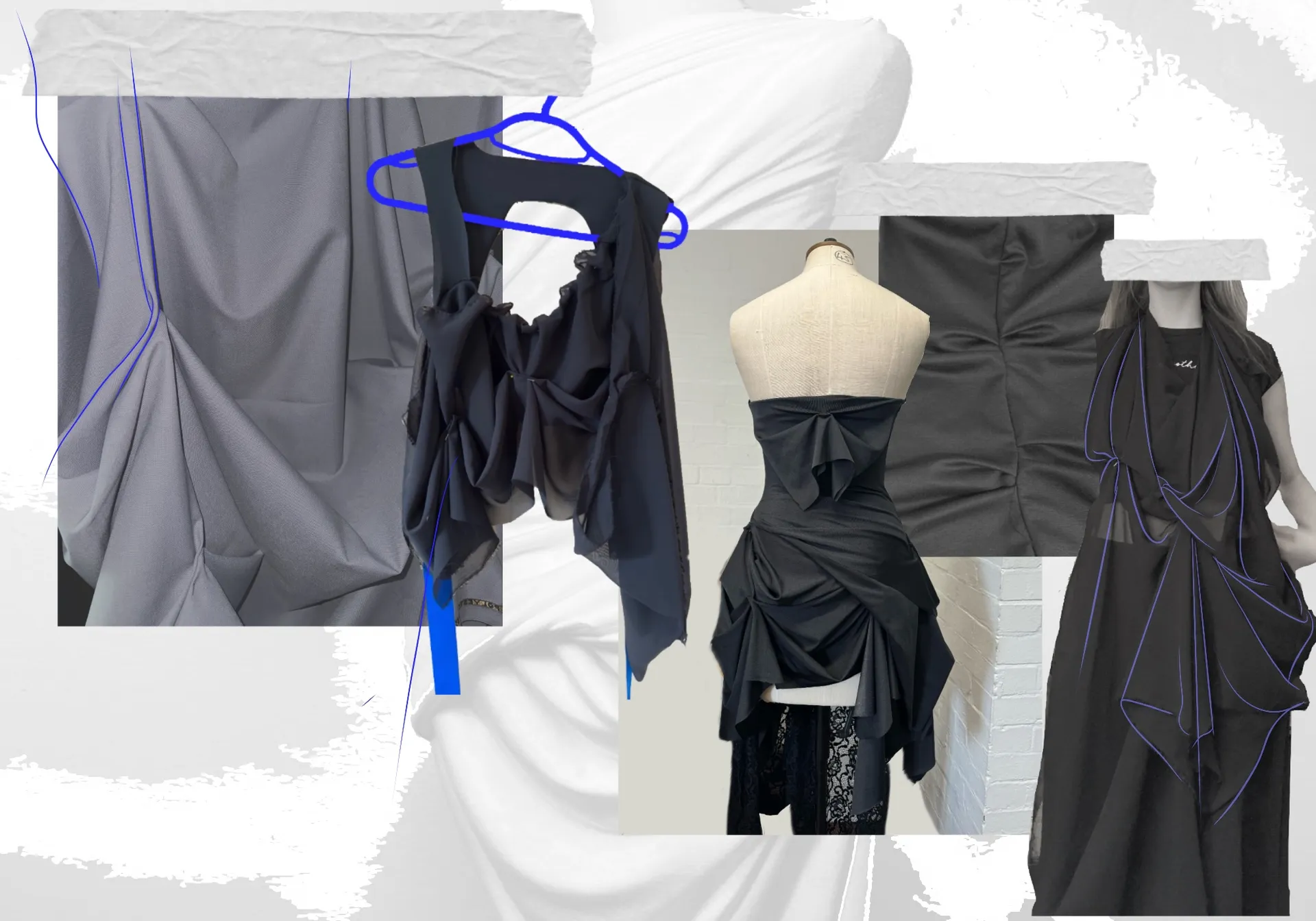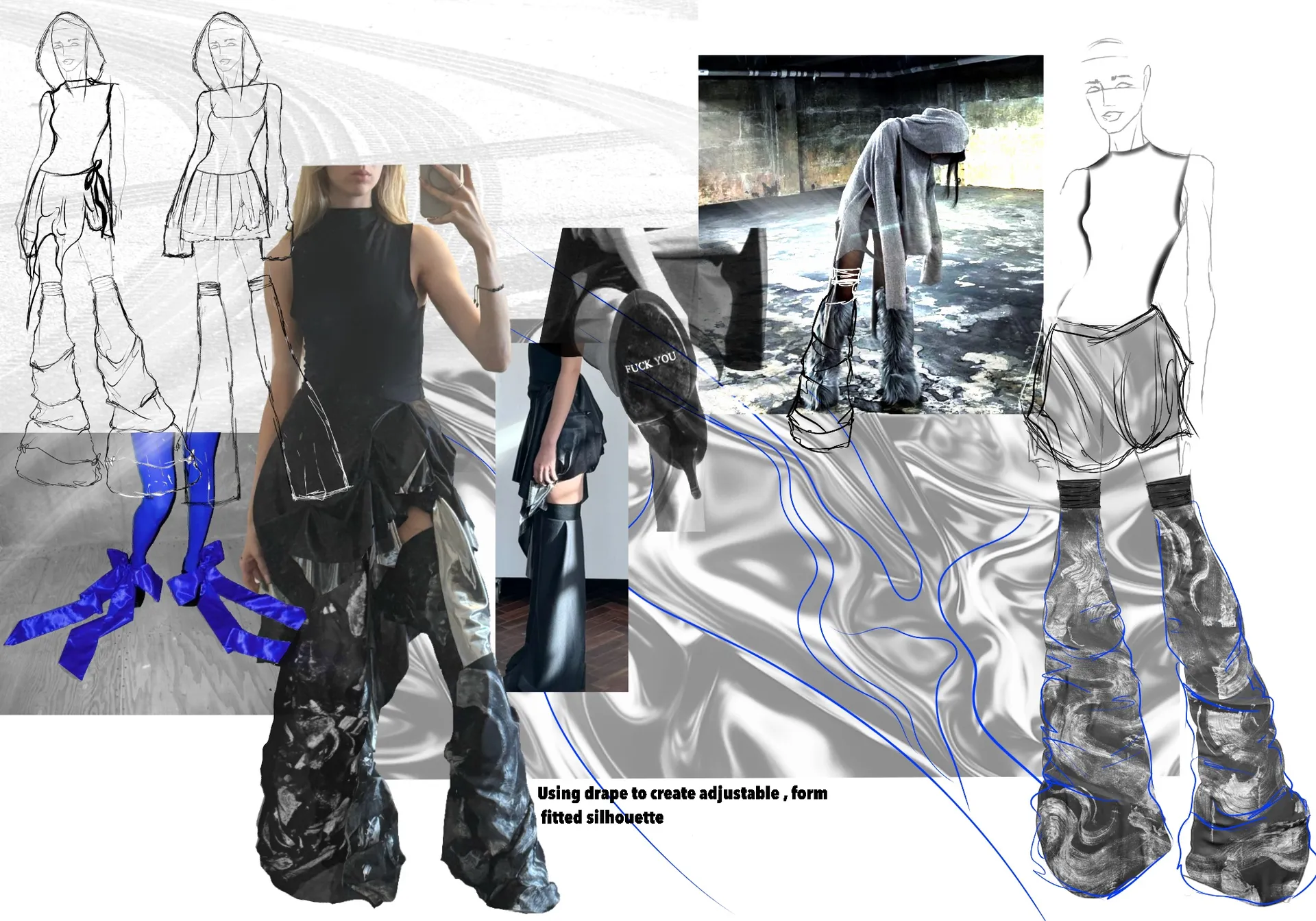 My work is inspired by women in male dominated spaces , conveying the desire not to be moulded in these spaces but to challenge the idea of what a successful woman can look like . Using drape and drape experiments to form the base of the collection where the female silhouette is key . The collection takes from the culture of being a woman in the motoring world. It uses colours, textures and 3D experiments inspired by this and other personal research throughout boards and is intended to show a slight irony to women’s representation in this niche whilst creating a collection that works with women’s bodies.