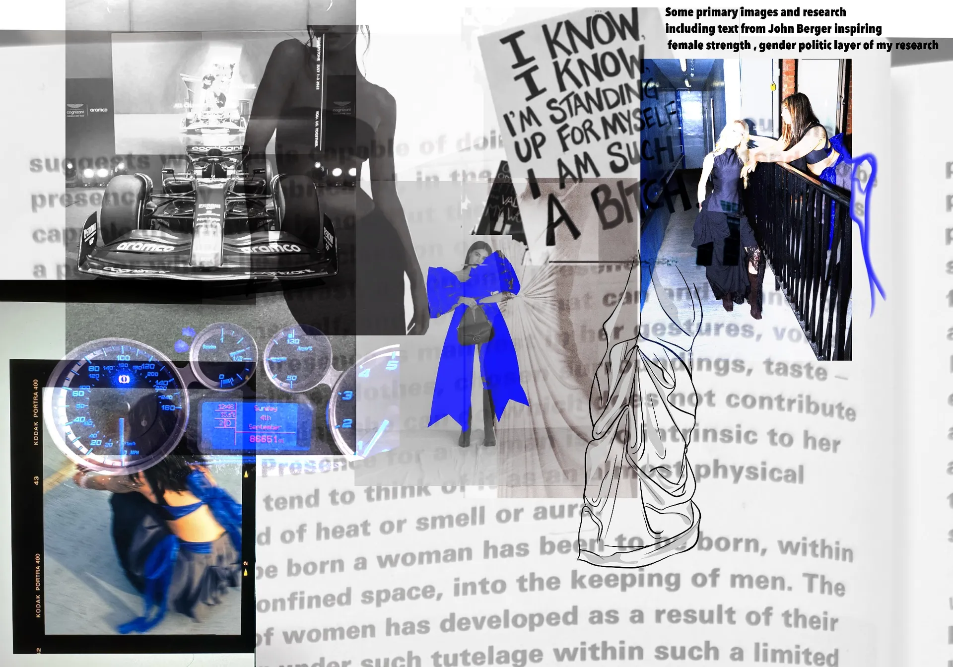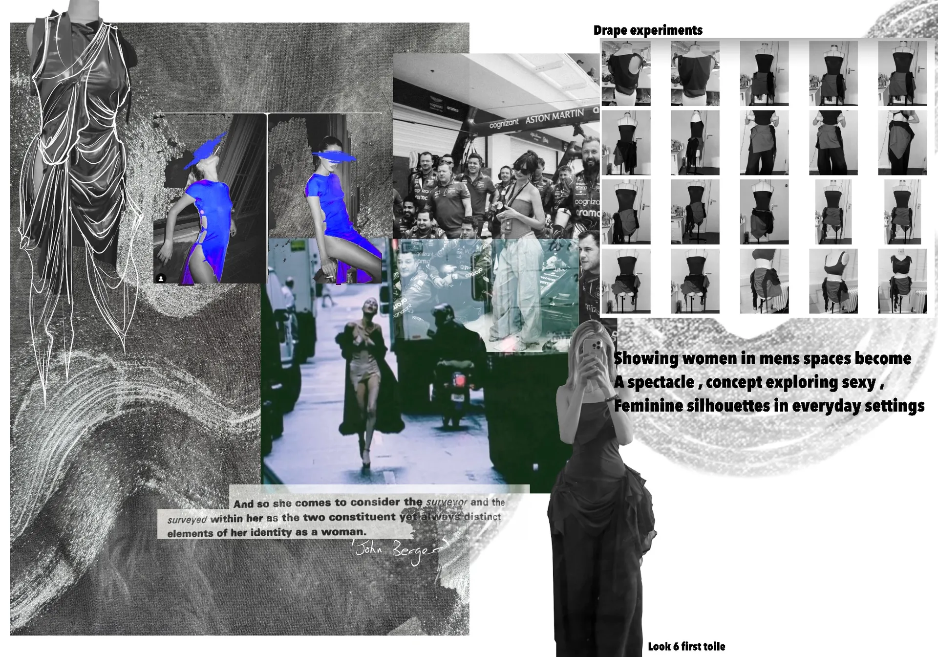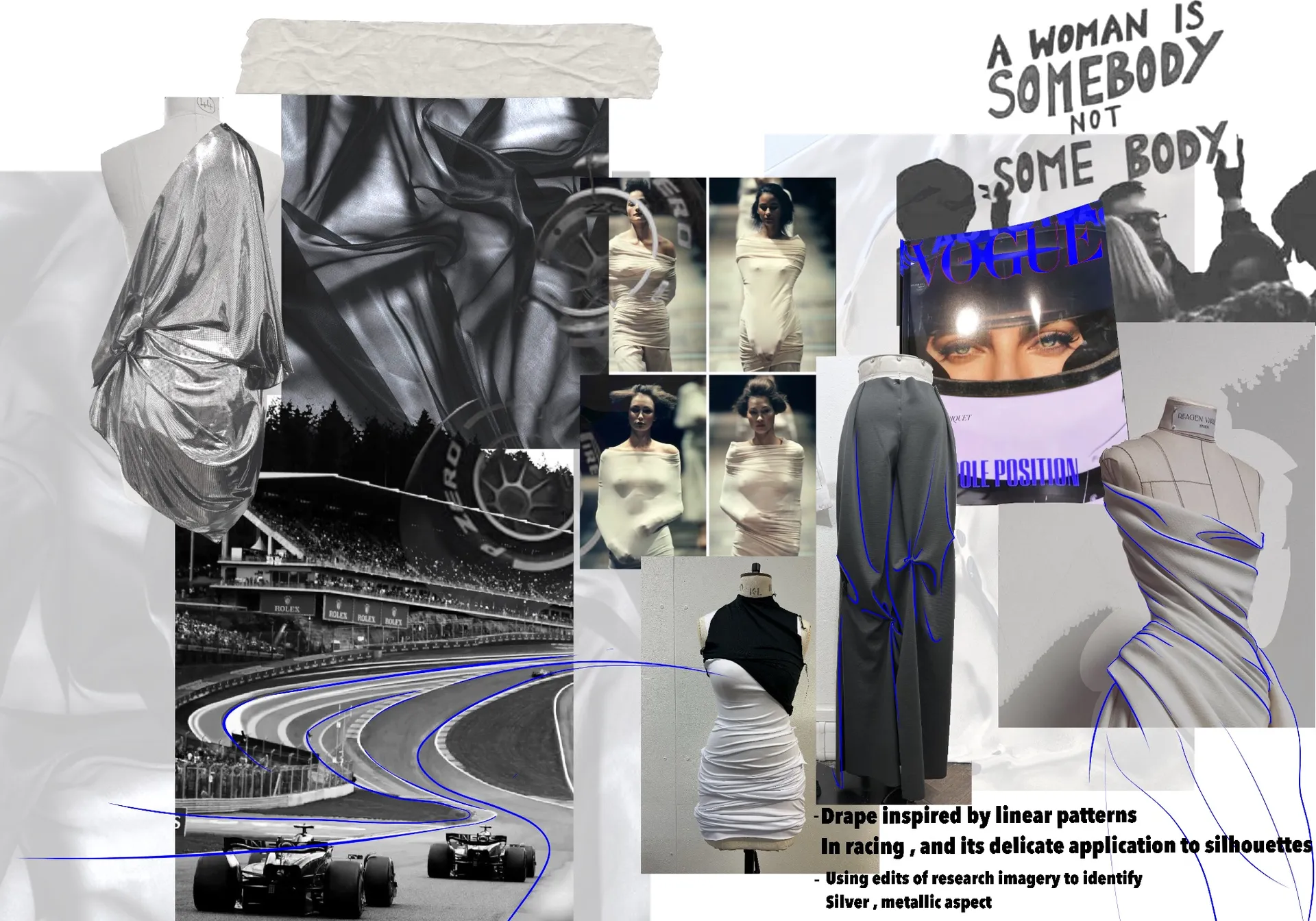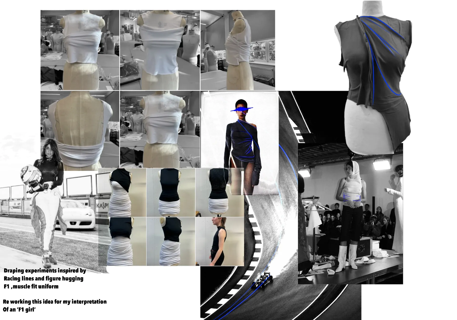 My work is inspired by women in male dominated spaces , conveying the desire not to be moulded in these spaces but to challenge the idea of what a successful woman can look like . Using drape and drape experiments to form the base of the collection where the female silhouette is key . The collection takes from the culture of being a woman in the motoring world. It uses colours, textures and 3D experiments inspired by this and other personal research throughout boards and is intended to show a slight irony to women’s representation in this niche whilst creating a collection that works with women’s bodies.