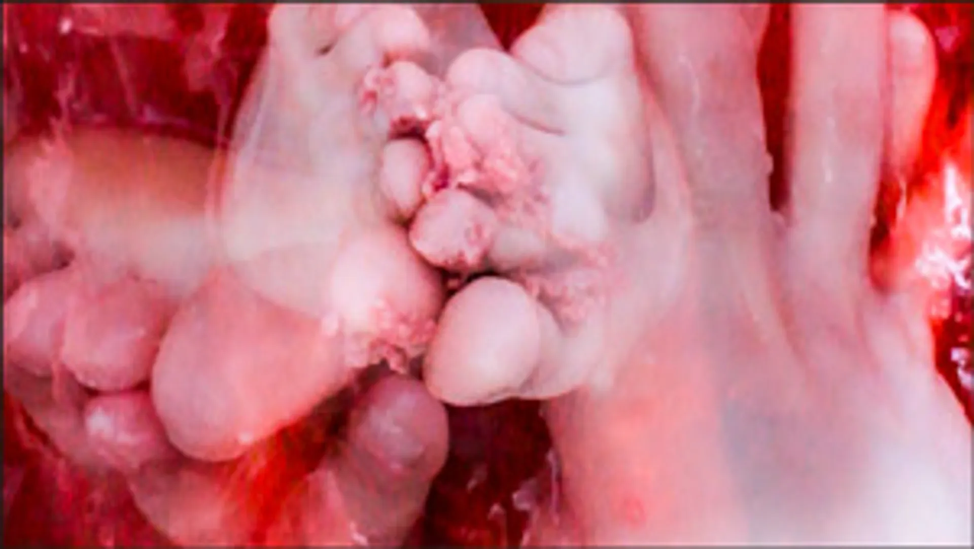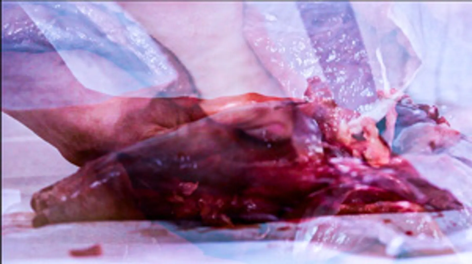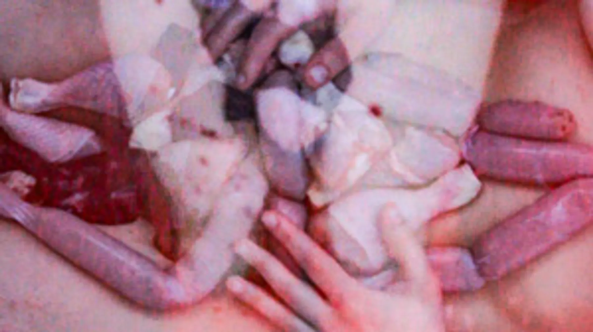 In the film, Gerrard wears a latex, rabbit mask to transform herself into a being she refers to as “The Creature”. The film follows “The Creature” as it undergoes the transition from girlhood into womanhood. The narrative tackles society and the media’s interference with female adolescence, encouraging young girls to grow up too fast. Meat, slaughter, and consumption are used in Gerrard’s reflection of her own adolescence, specifically the way others took advantage of her body.