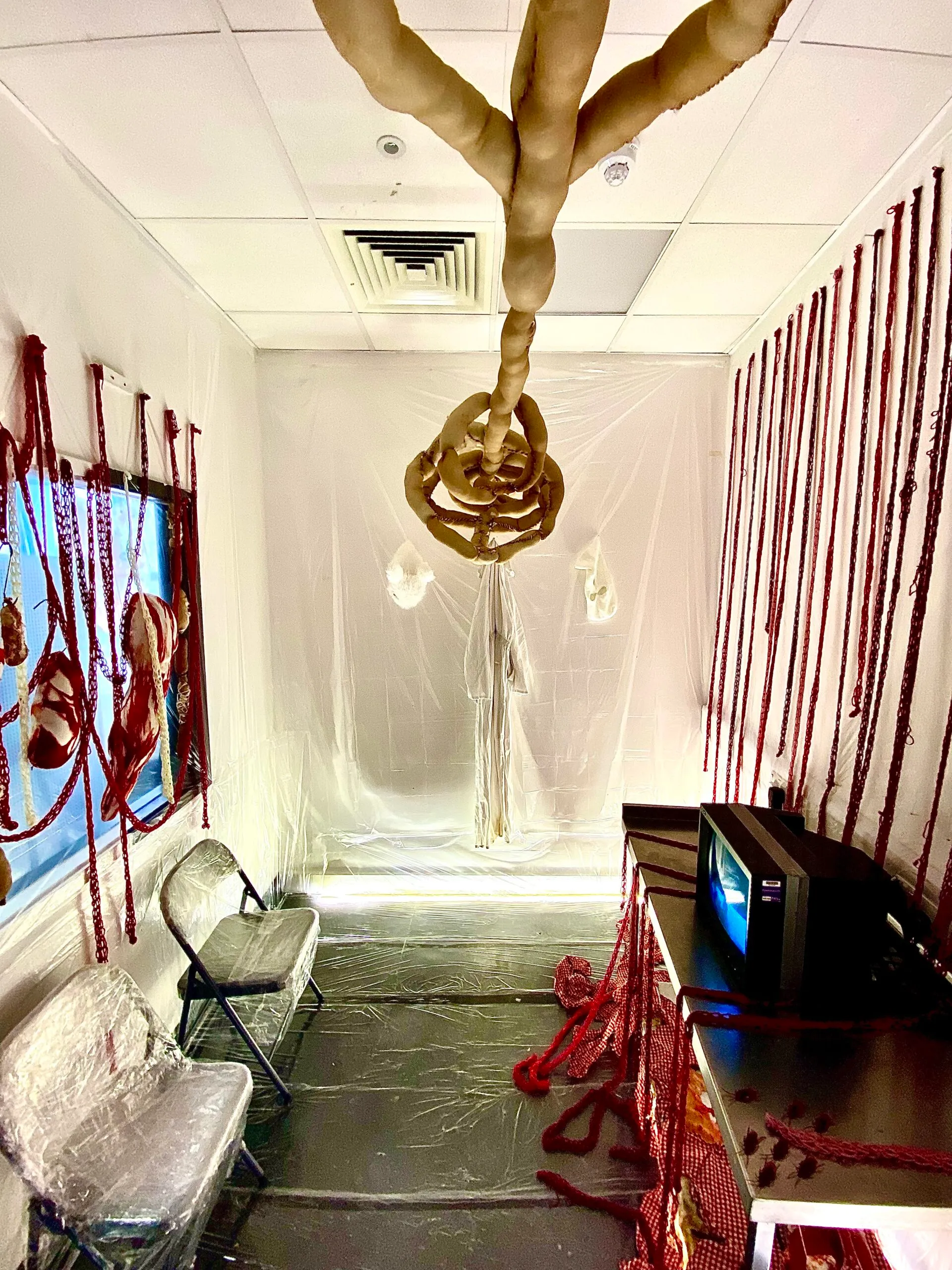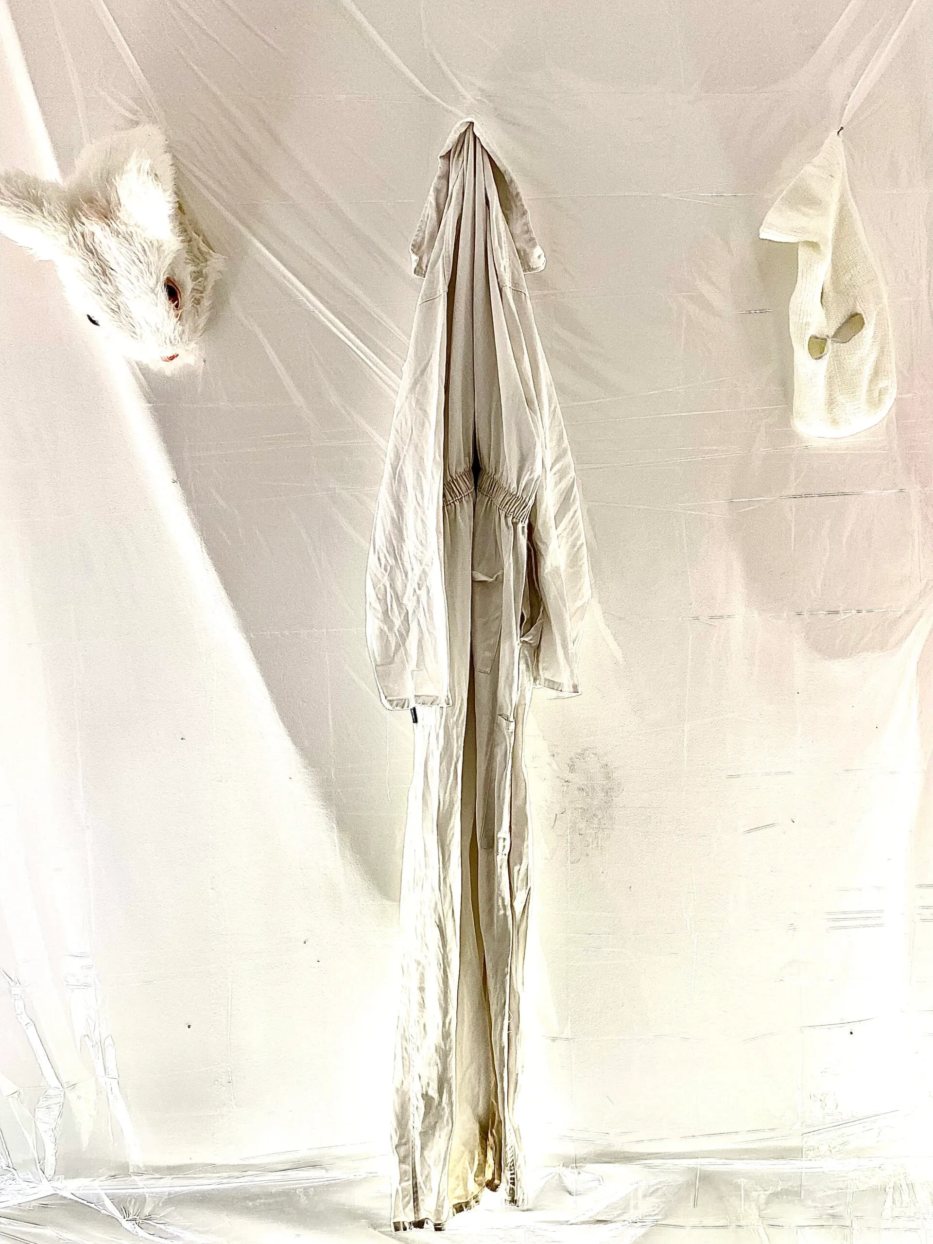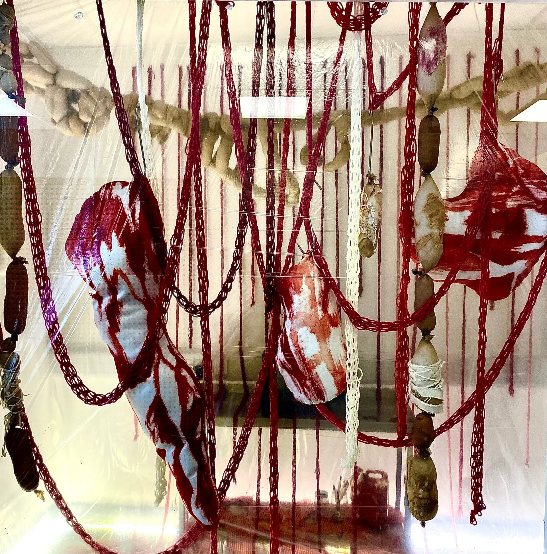 In the film, Gerrard wears a latex, rabbit mask to transform herself into a being she refers to as “The Creature”. The film follows “The Creature” as it undergoes the transition from girlhood into womanhood. The narrative tackles society and the media’s interference with female adolescence, encouraging young girls to grow up too fast. Meat, slaughter, and consumption are used in Gerrard’s reflection of her own adolescence, specifically the way others took advantage of her body.