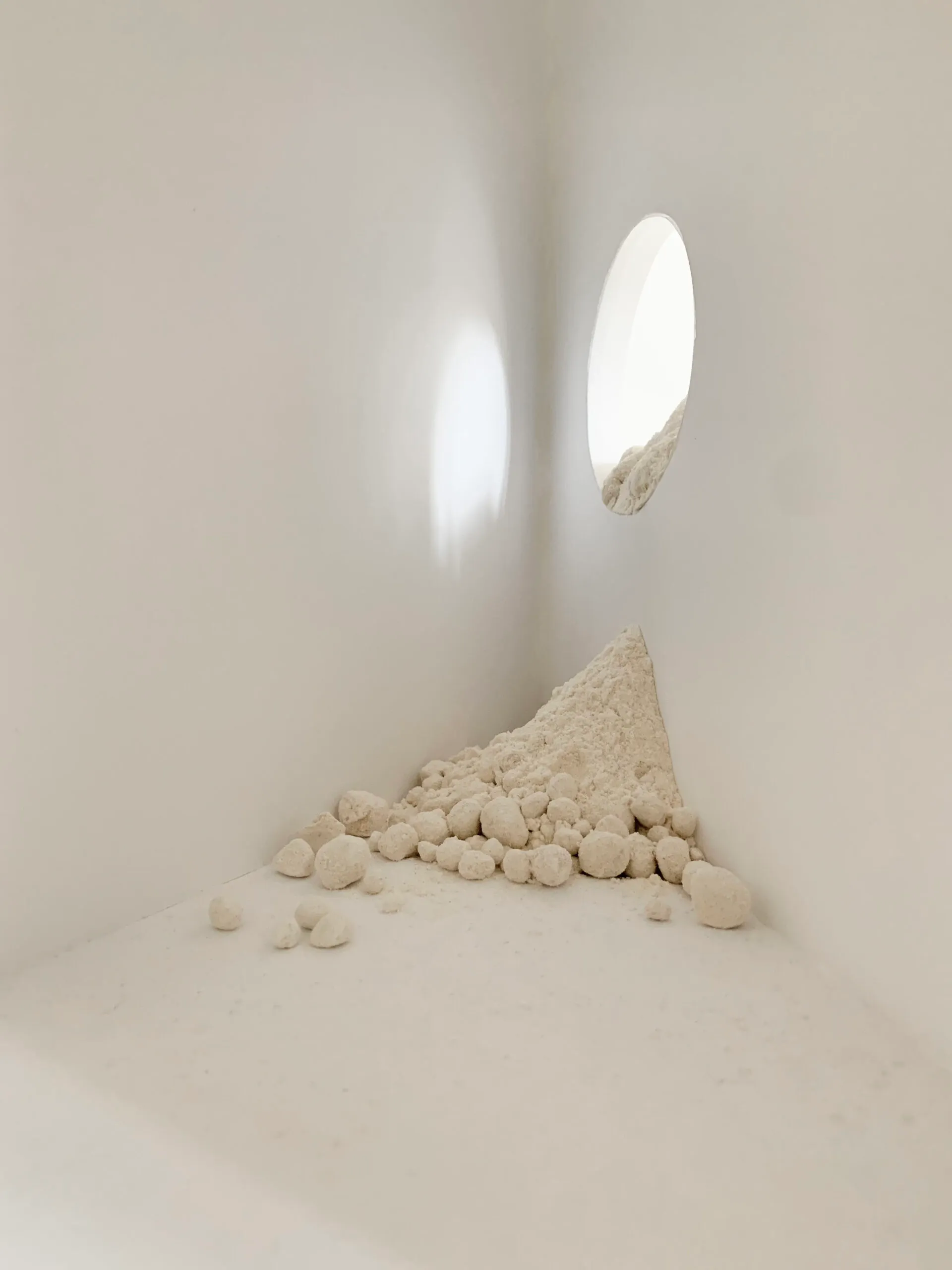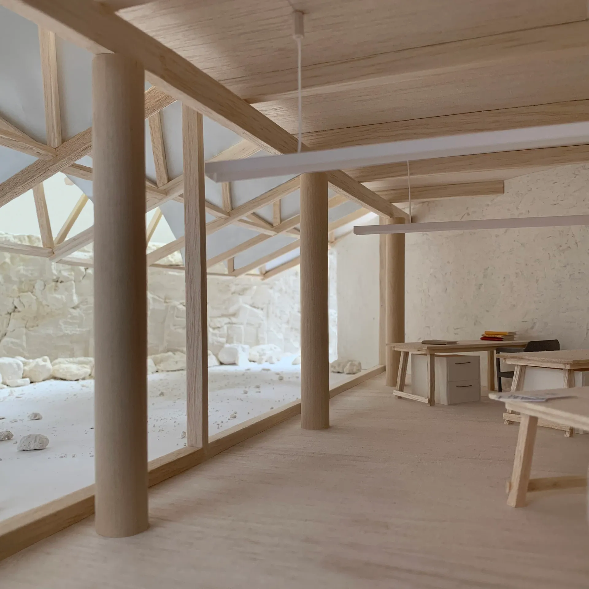 East Anglia is a very arable region and practices conventional farming. The connection between chalk and agriculture is well established but I am proposing a furthering of this relationship. Hemp can be grown in the surrounding land, improving ecology and biodiversity, as well as being a resource that can be paired with chalk to add to its utility. One continuous wall breaks up space into the different areas needed for chalk and hemp processing. Interior and exterior rooms are made, their use depending on what is appropriate for each step of the process. The two materials are divided along this wall until they come together at the end, encouraged by the changing angles of the triangle spaces. By the end of the wall they are together, ready for transportation now as a valuable and sustainable building system.