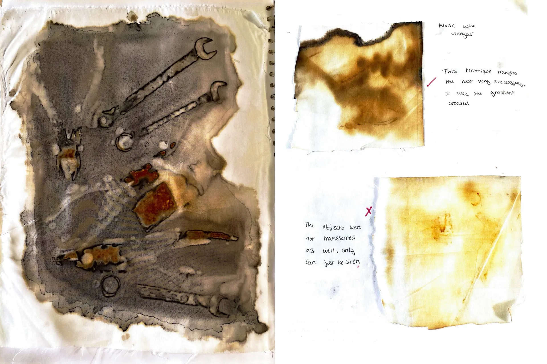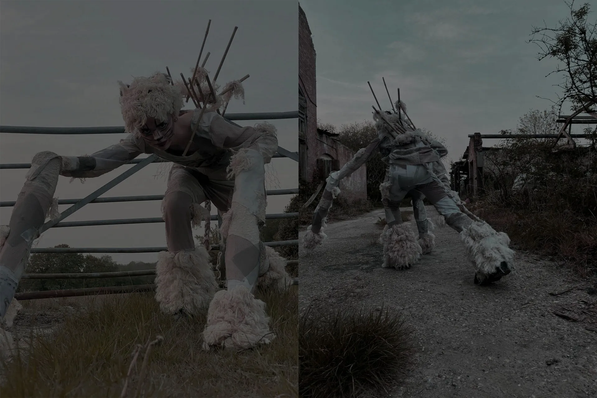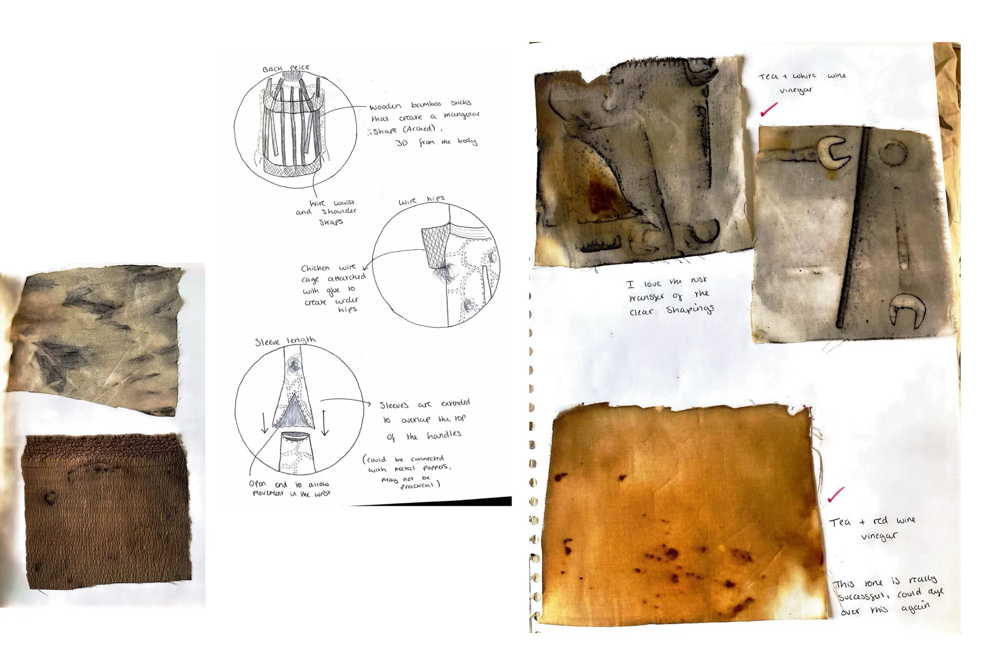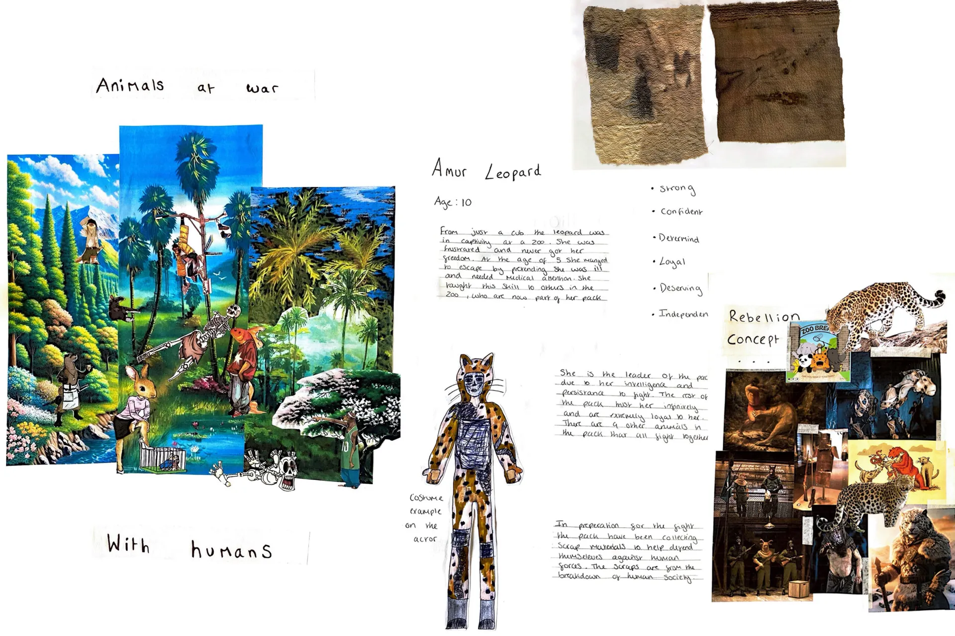 The process behind my project began by looking into extinction and the link between its causes through human activity and the rate it has increased by. My research lead me to then focused on current critically endangered animals and how I could create a scenario that postponed their extinction. My narrative is focused on the animals fighting back against their own potential extinction through preparing for a war to eradicate the human species. This is to be shown in a theatre performance where the character I developed and designed for is an Amur leopard that is the leader of the pack. All the animals have been kept and treated badly in captivity which is reflected in my final outcome. Within my design I included a range of rust dyed samples to mimic the idea of the leopards print, also reflecting how metal is used as armour protection in battles. Throughout my research I gained knowledge on the Amur leopards behaviours and anatomy which reflected into the human form. I wanted to present my character as intimidating to overpower the intended audience, this is shown through the eerie darkness of my final images. To create the intended silhouette I crafted wooden stilts and a back piece to transform the character away from the human body. I also included self made fur and chicken wire to further develop the leopards silhouette and backstory.