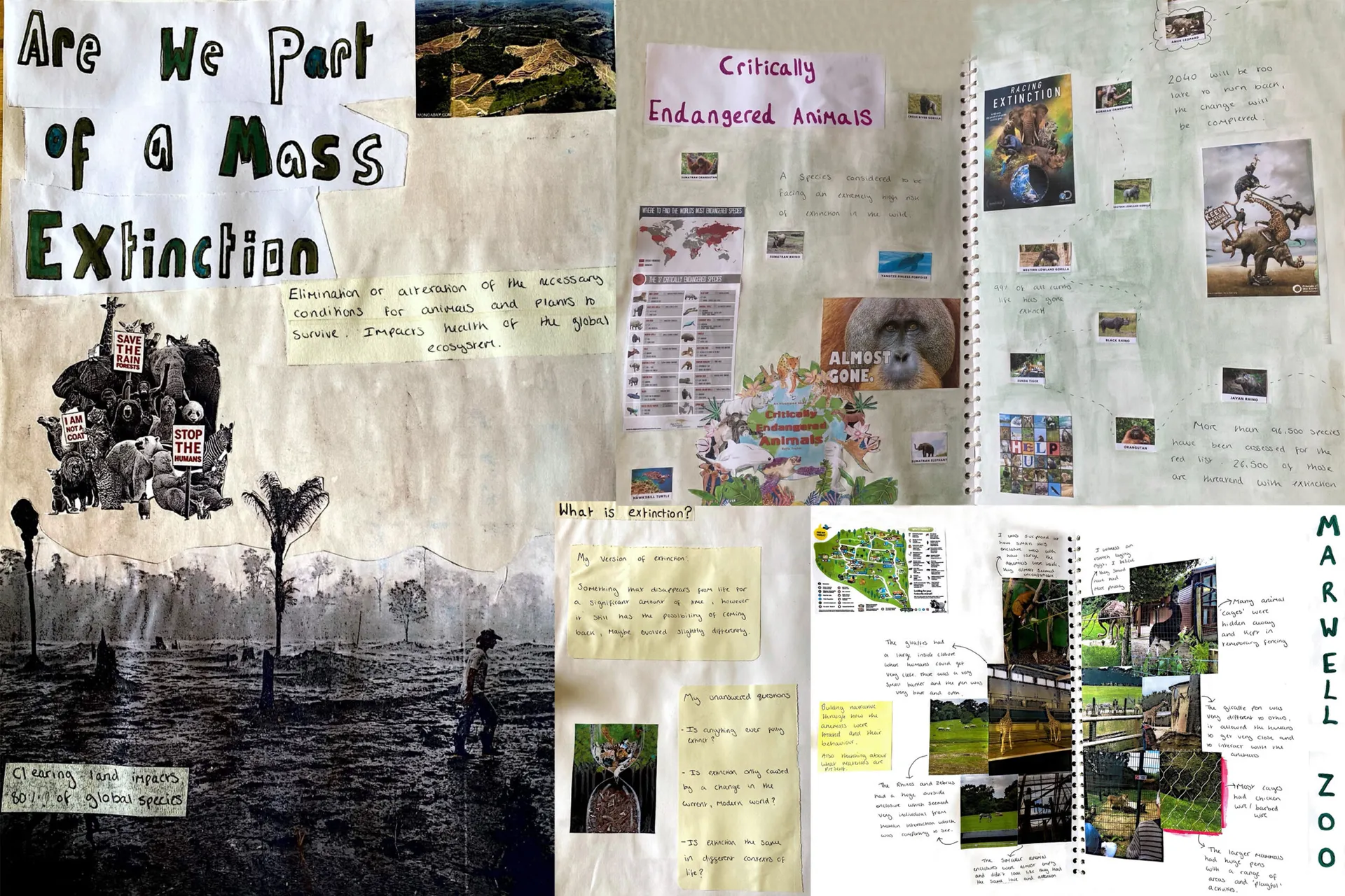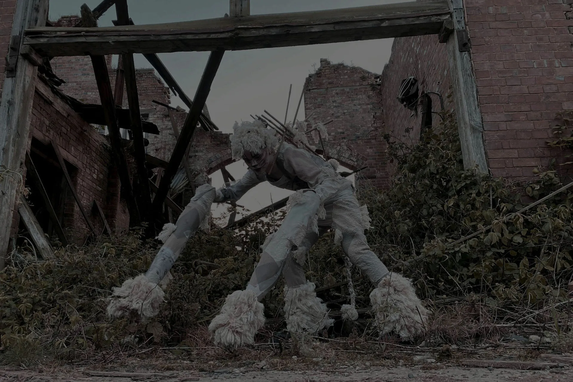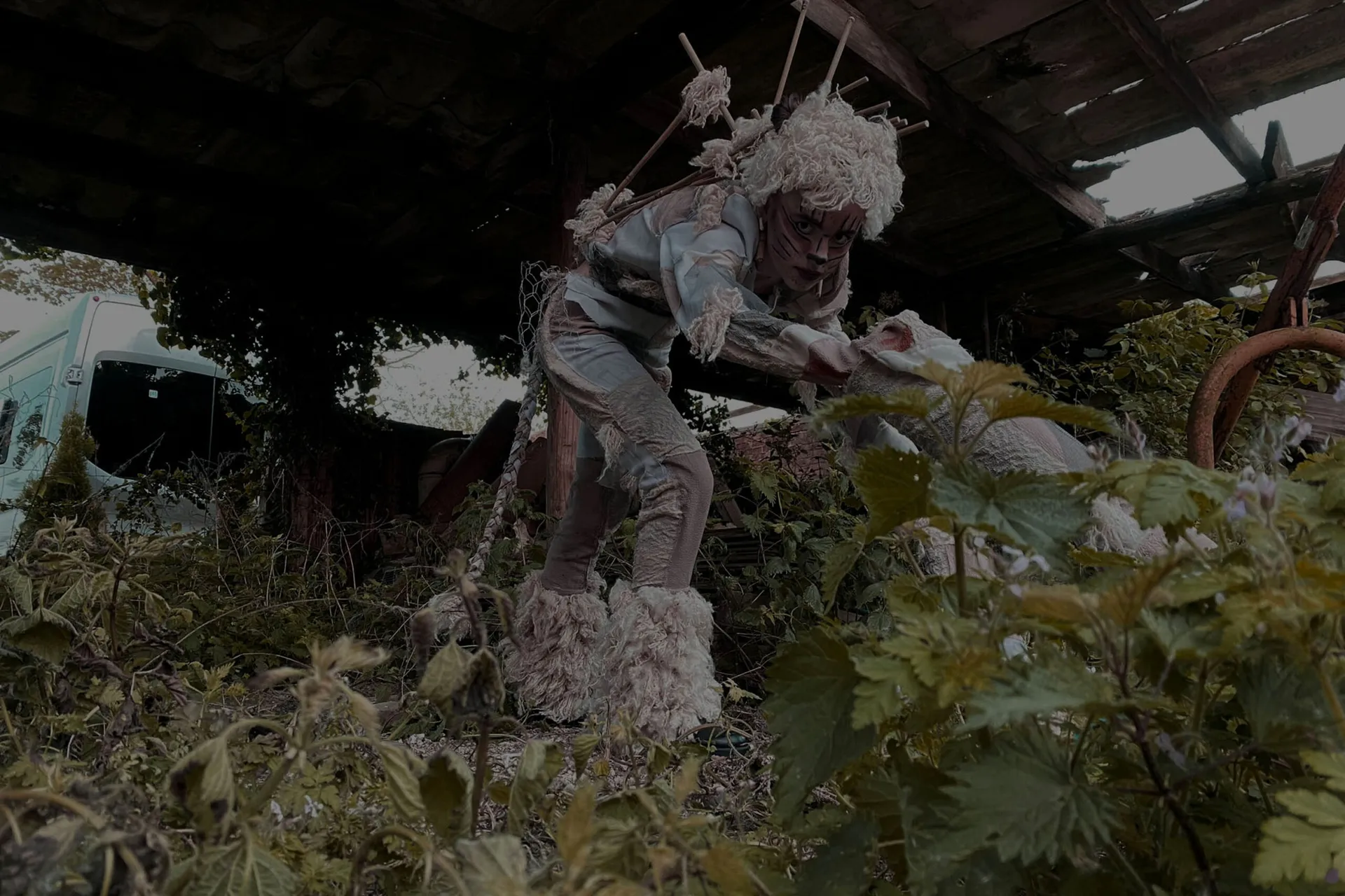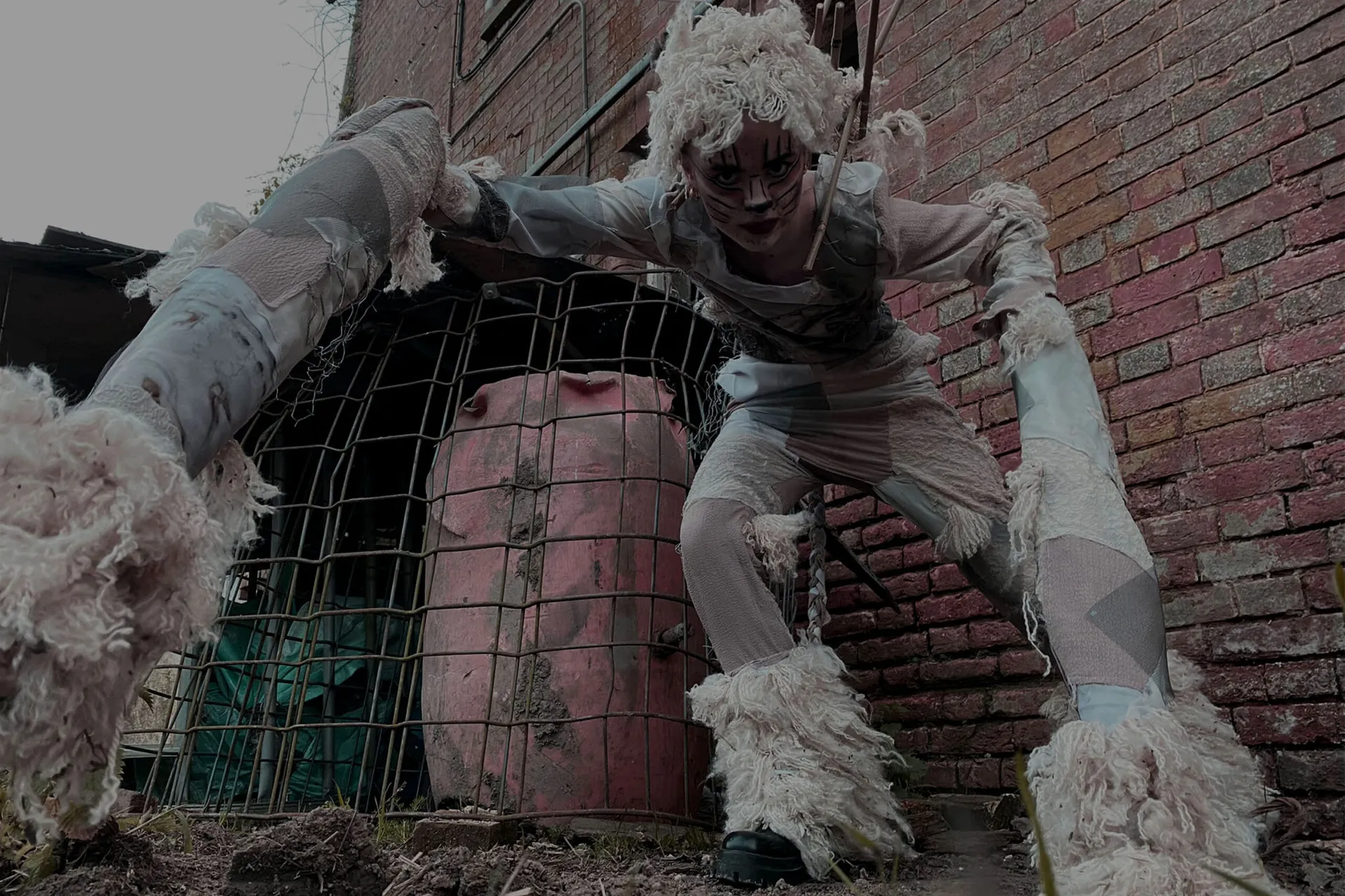 The process behind my project began by looking into extinction and the link between its causes through human activity and the rate it has increased by. My research lead me to then focused on current critically endangered animals and how I could create a scenario that postponed their extinction. My narrative is focused on the animals fighting back against their own potential extinction through preparing for a war to eradicate the human species. This is to be shown in a theatre performance where the character I developed and designed for is an Amur leopard that is the leader of the pack. All the animals have been kept and treated badly in captivity which is reflected in my final outcome. Within my design I included a range of rust dyed samples to mimic the idea of the leopards print, also reflecting how metal is used as armour protection in battles. Throughout my research I gained knowledge on the Amur leopards behaviours and anatomy which reflected into the human form. I wanted to present my character as intimidating to overpower the intended audience, this is shown through the eerie darkness of my final images. To create the intended silhouette I crafted wooden stilts and a back piece to transform the character away from the human body. I also included self made fur and chicken wire to further develop the leopards silhouette and backstory.