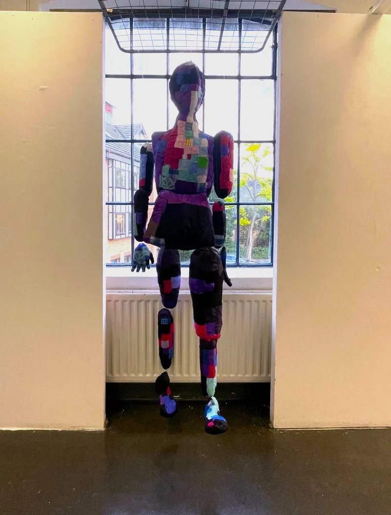 The suspended fabric body parts you see are remnants of a community I have tried to assimilate into for the past few months. I have rummaged through discarded clothing from charity shops around Kingston and used them to recreate the image of a person captured in 2018.