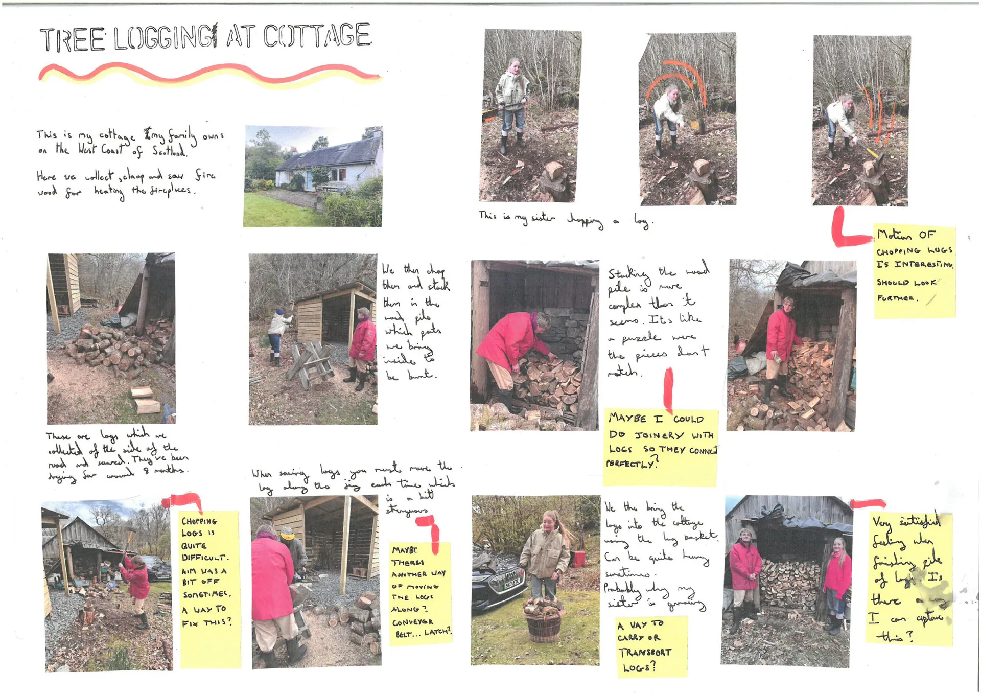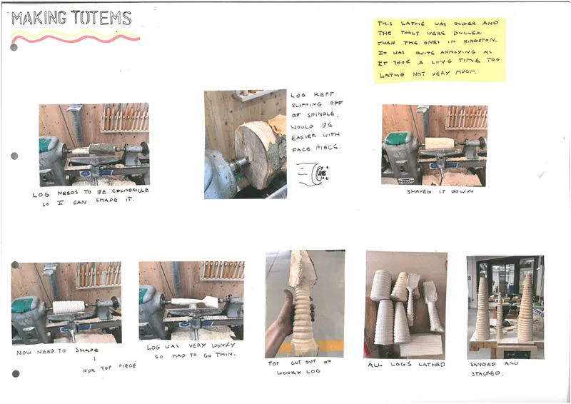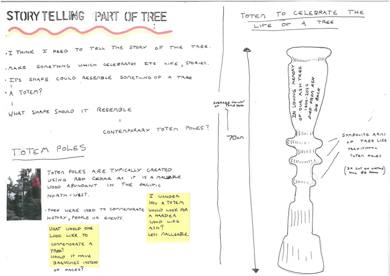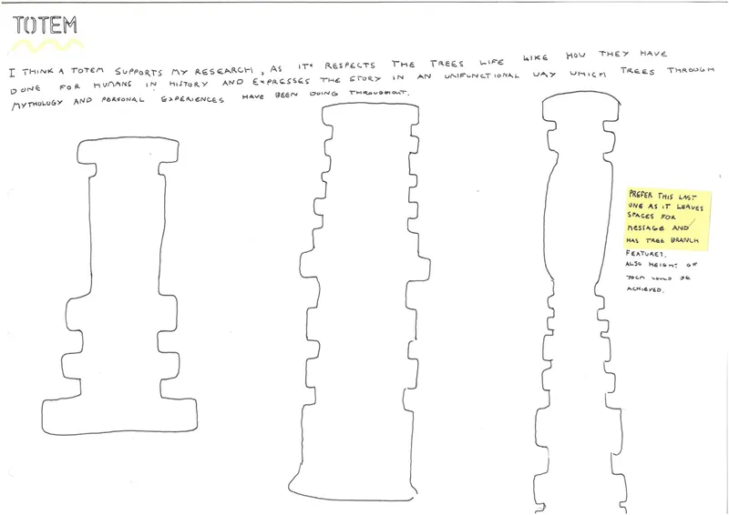 I’ve designed a totem pole memorial to celebrate trees’ lives, as totems have done for humans. It expresses the tree’s story and journey through the years, its life, and its admiration after its death, like traditional human tombstones. It focuses on the tree’s story. I think my design has answered the questions I sought in the project proposal, as it has answered the question of our importance to trees and how we are like them. It’s allowed me to realise that the human story and connection to the tree isn’t the central part, but the tree’s life and events hold much greater significance. I felt disconnected from my findings throughout my extensive research into tree mythology. So I thought I must look into my story with splitting logs, but that felt too personal, and not everyone would relate. So, by bringing the significance back to the trees story after hearing many people’s stories, I felt this gave a good representation of trees. I think my primary research in talking to people online and in person about their stories with trees and finding that everyone has their personal experiences was a great help. Also, speaking with tree surgeons was fascinating, showing how they respected the trees they cut down. Most of them are replanting, but some are just chipping them. That gave me an understanding of how I can appreciate them using symbols.