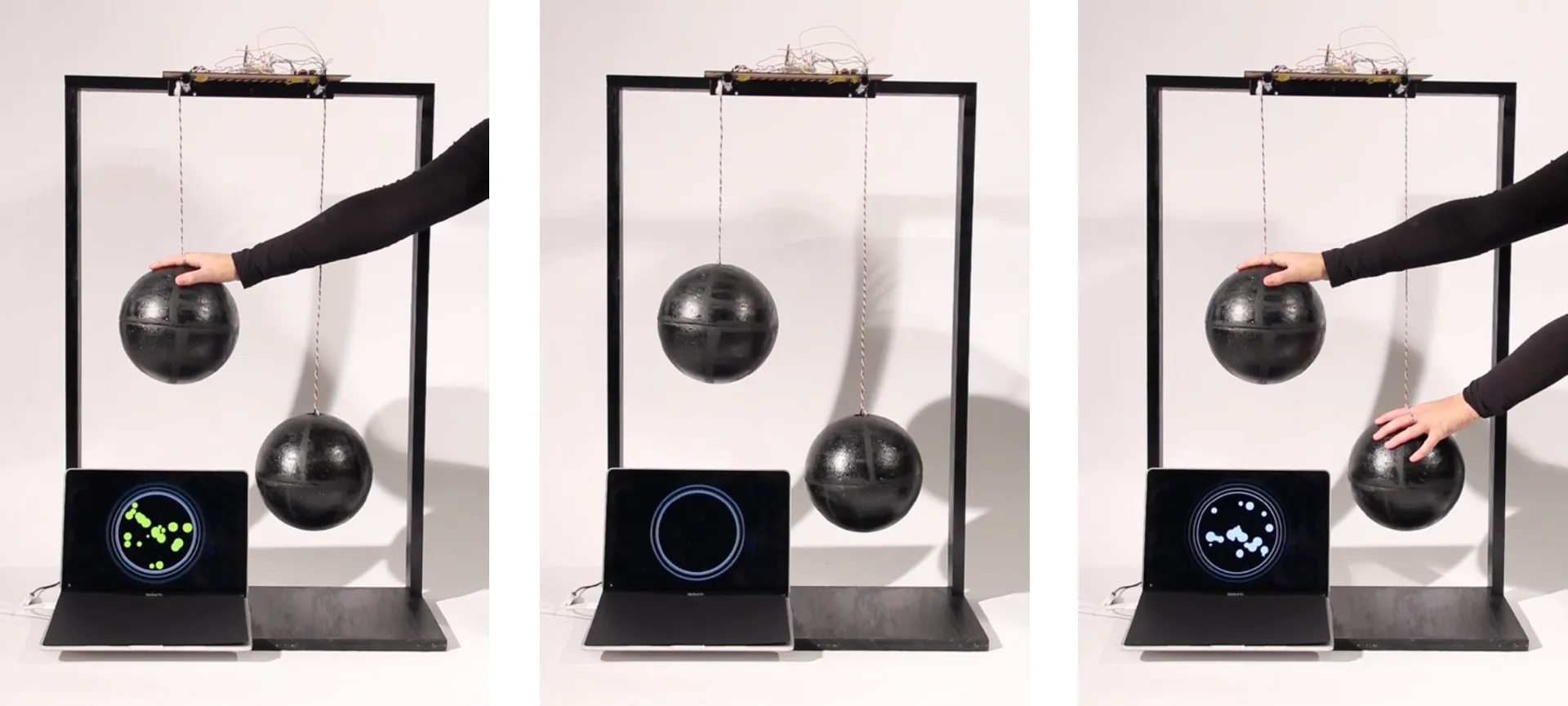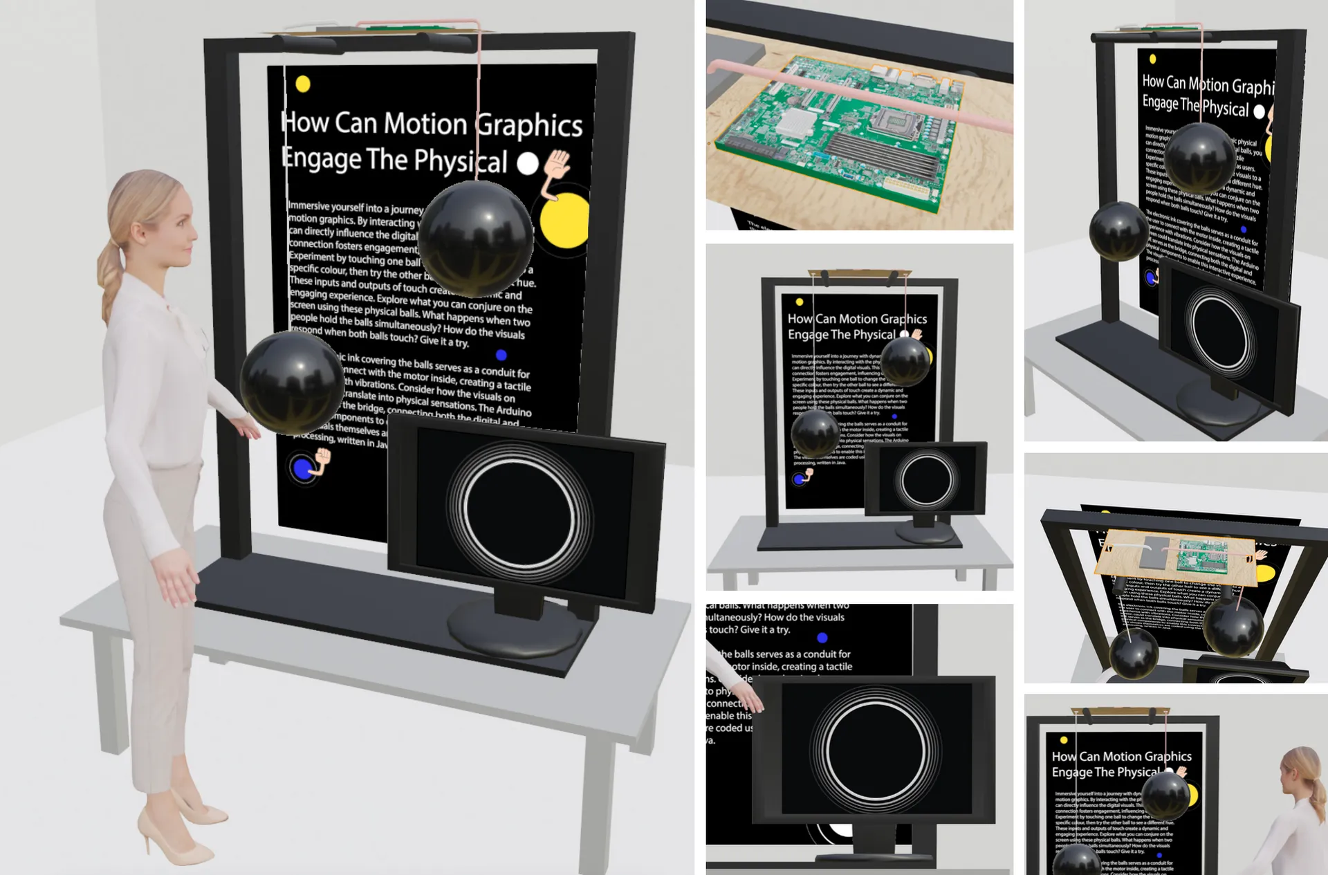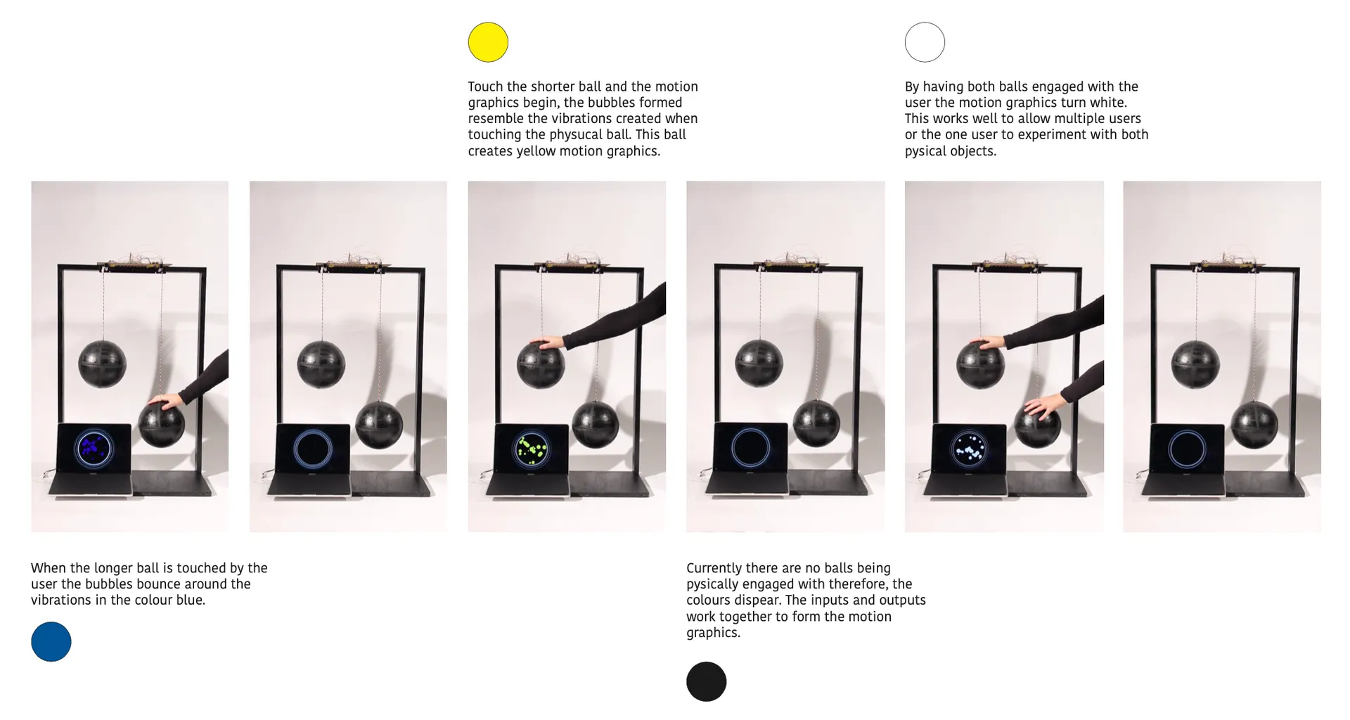 revolves around empowering users to create motion graphics through physical touch, immersing them in the project. Touching the electronic balls generates vibrations that signal the Arduino to initiate the motion graphics, enhancing what’s displayed on the screen. The interaction’s outcome depends on factors such as which ball is touched, the number of simultaneous touches, and the location of the touch. Colours correspond to the object’s touch, and visual bubbles emerge when interaction occurs. The outer circles represent the vibrations felt by the user upon touching, with the visuals mirroring this tactile experience.