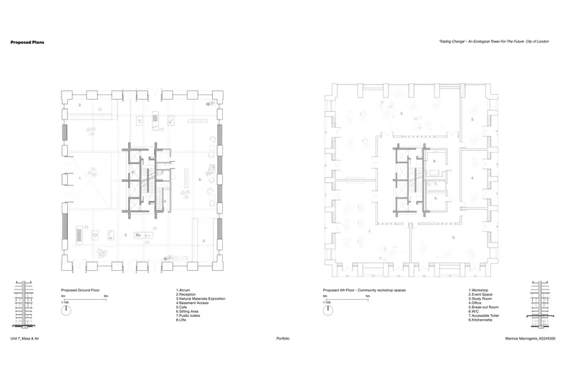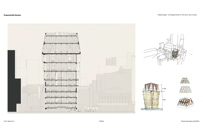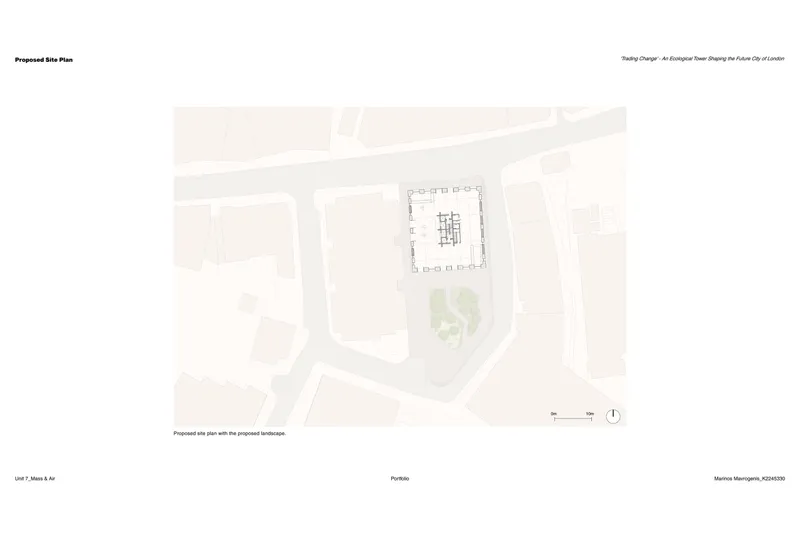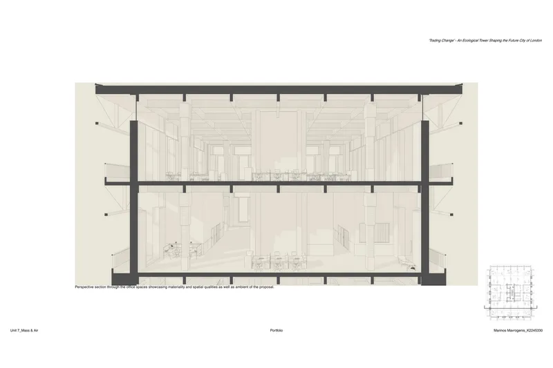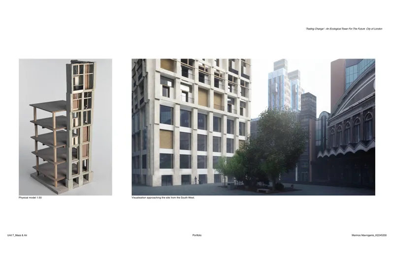 Utilising the geographical location of the site, the project acts as an environmental agent, fostering awareness and advocacy for sustainable practices. The ambition and ethos of the tower could attract environmental agencies such as the Architects Climate Action Network (ACAN) and could serve as the main London office for a sustainable bank like Triodos, imagining a future for the City of London where the worlds of trading and environmental activism meet.