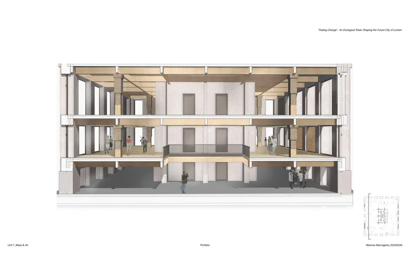 This project is situated amidst the urgency architects face in responding to the climate emergency and the tension in preserving architectural continuity. Confronting the challenge of re-evaluating conventional practices reliant on carbon-intensive materials while aspiring to maintain a sense of familiarity and permanence, the thesis highlights the necessity of dense buildings in financial districts to optimise land use and mitigate urban sprawl, thereby supporting sustainable urban growth.