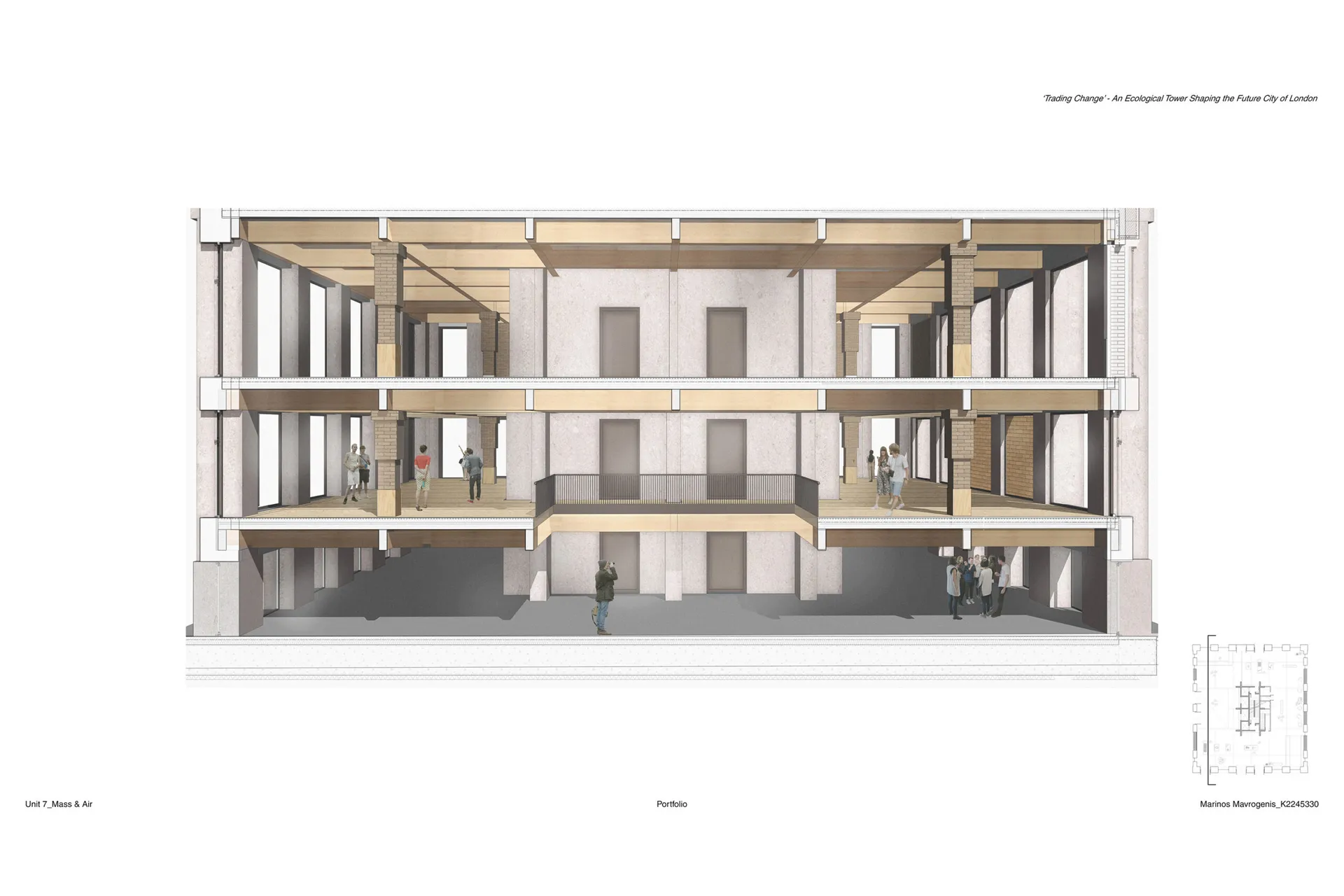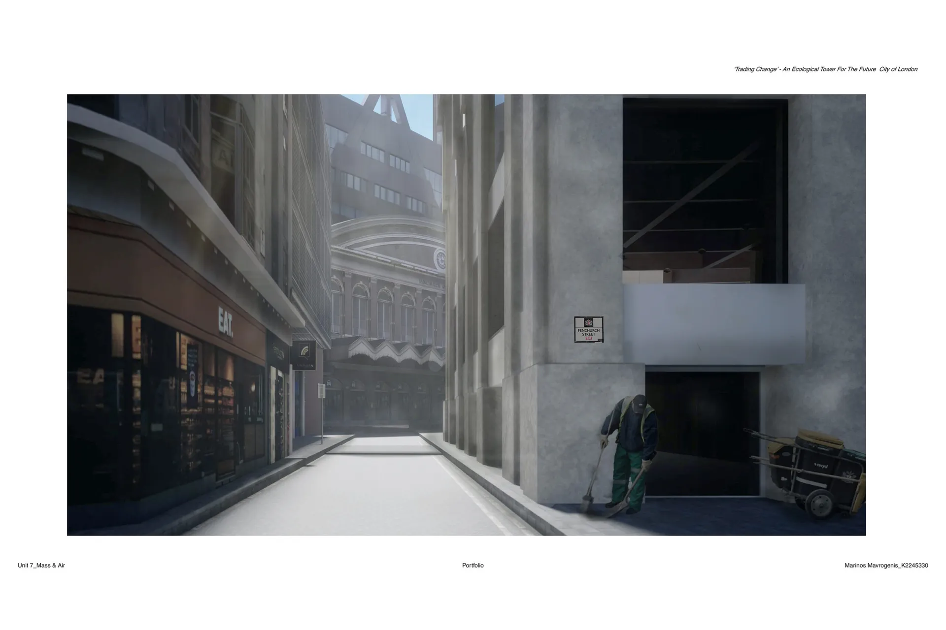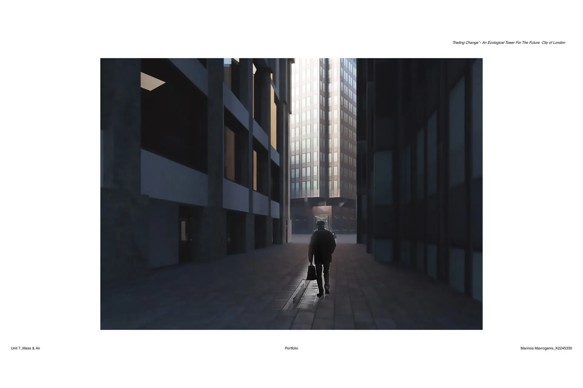 Utilising the geographical location of the site, the project acts as an environmental agent, fostering awareness and advocacy for sustainable practices. The ambition and ethos of the tower could attract environmental agencies such as the Architects Climate Action Network (ACAN) and could serve as the main London office for a sustainable bank like Triodos, imagining a future for the City of London where the worlds of trading and environmental activism meet.