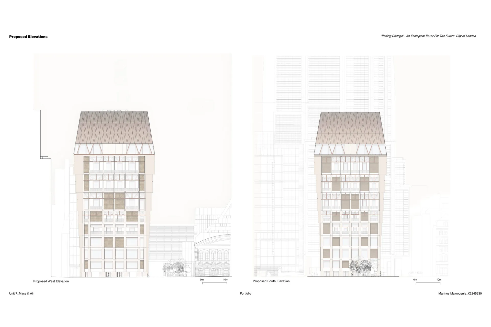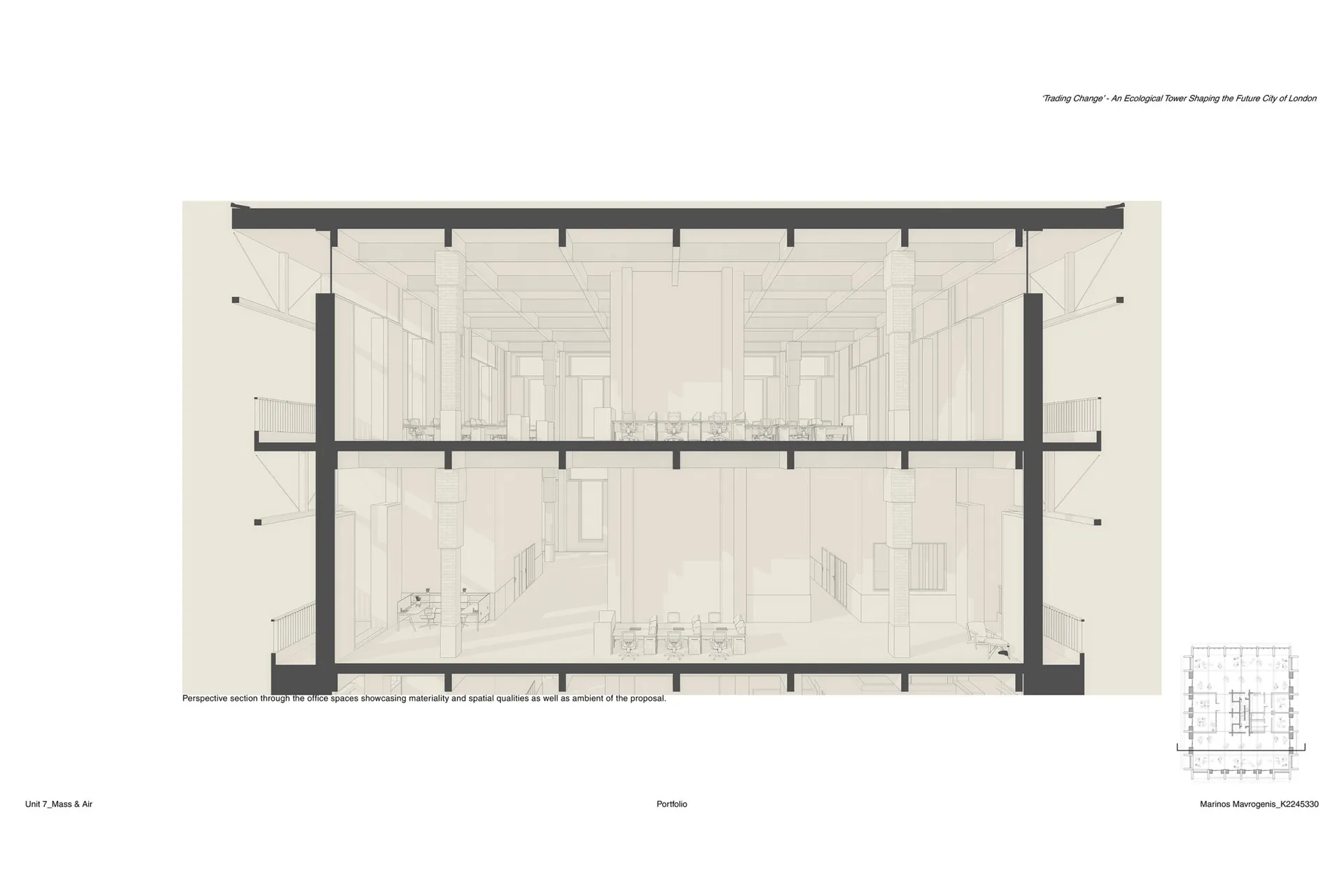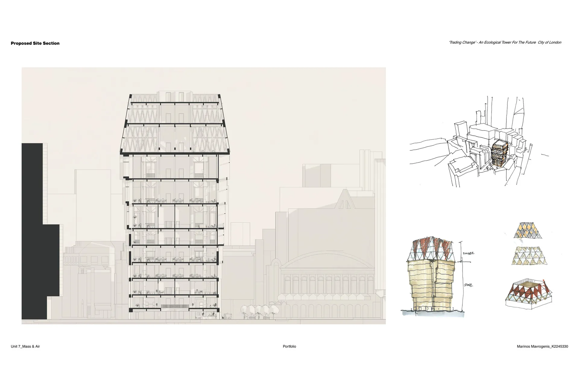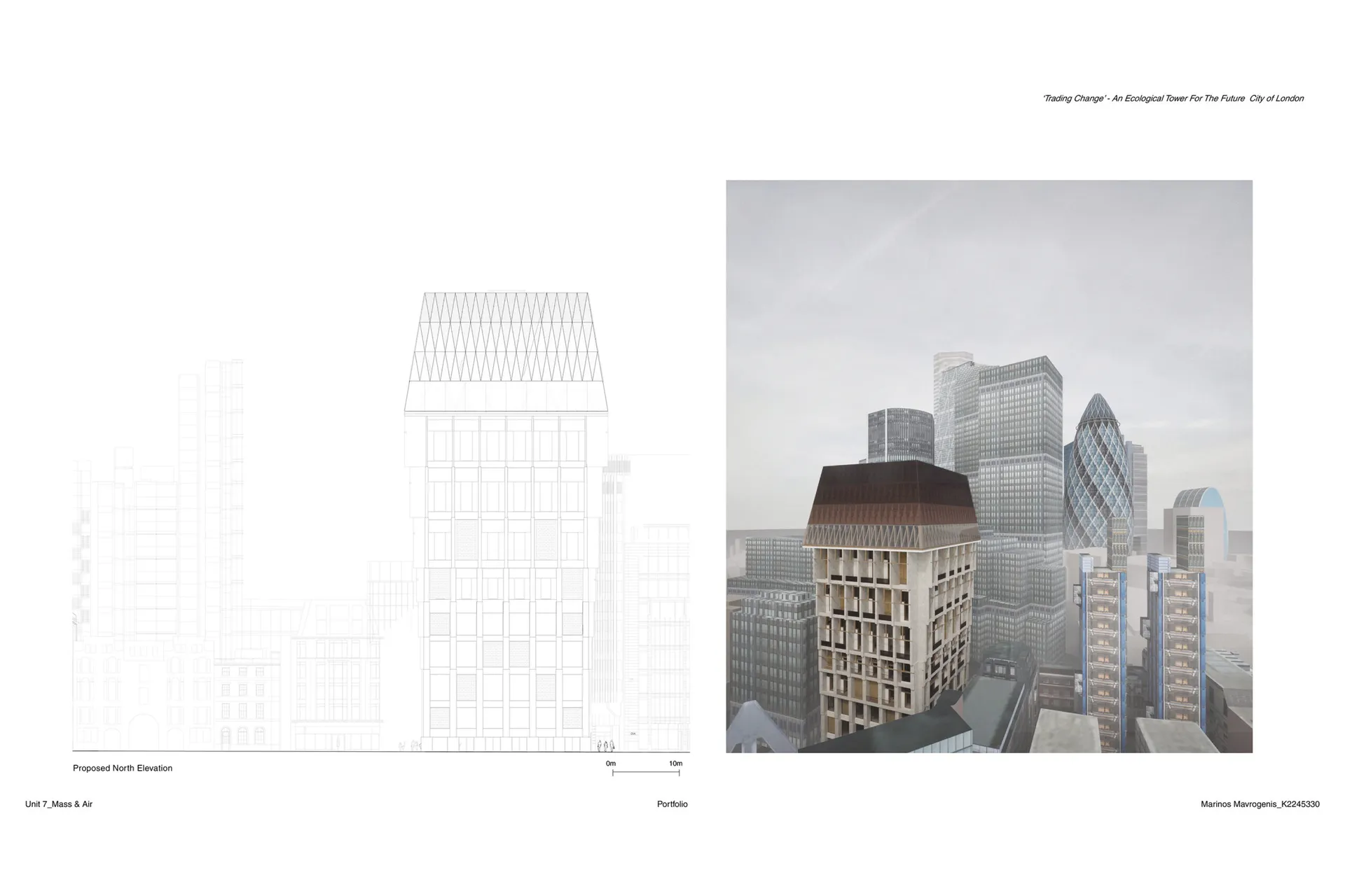Utilising the geographical location of the site, the project acts as an environmental agent, fostering awareness and advocacy for sustainable practices. The ambition and ethos of the tower could attract environmental agencies such as the Architects Climate Action Network (ACAN) and could serve as the main London office for a sustainable bank like Triodos, imagining a future for the City of London where the worlds of trading and environmental activism meet.