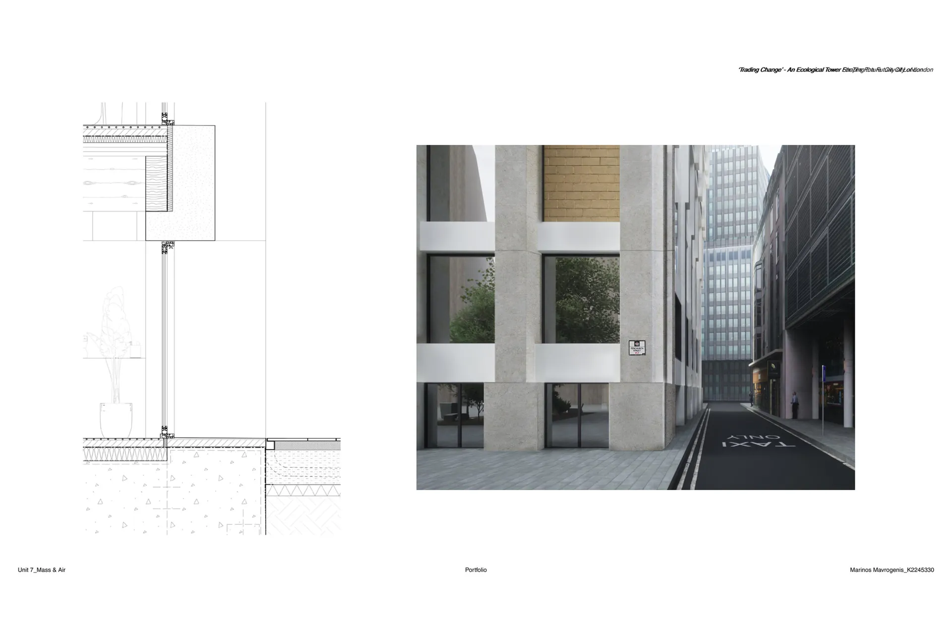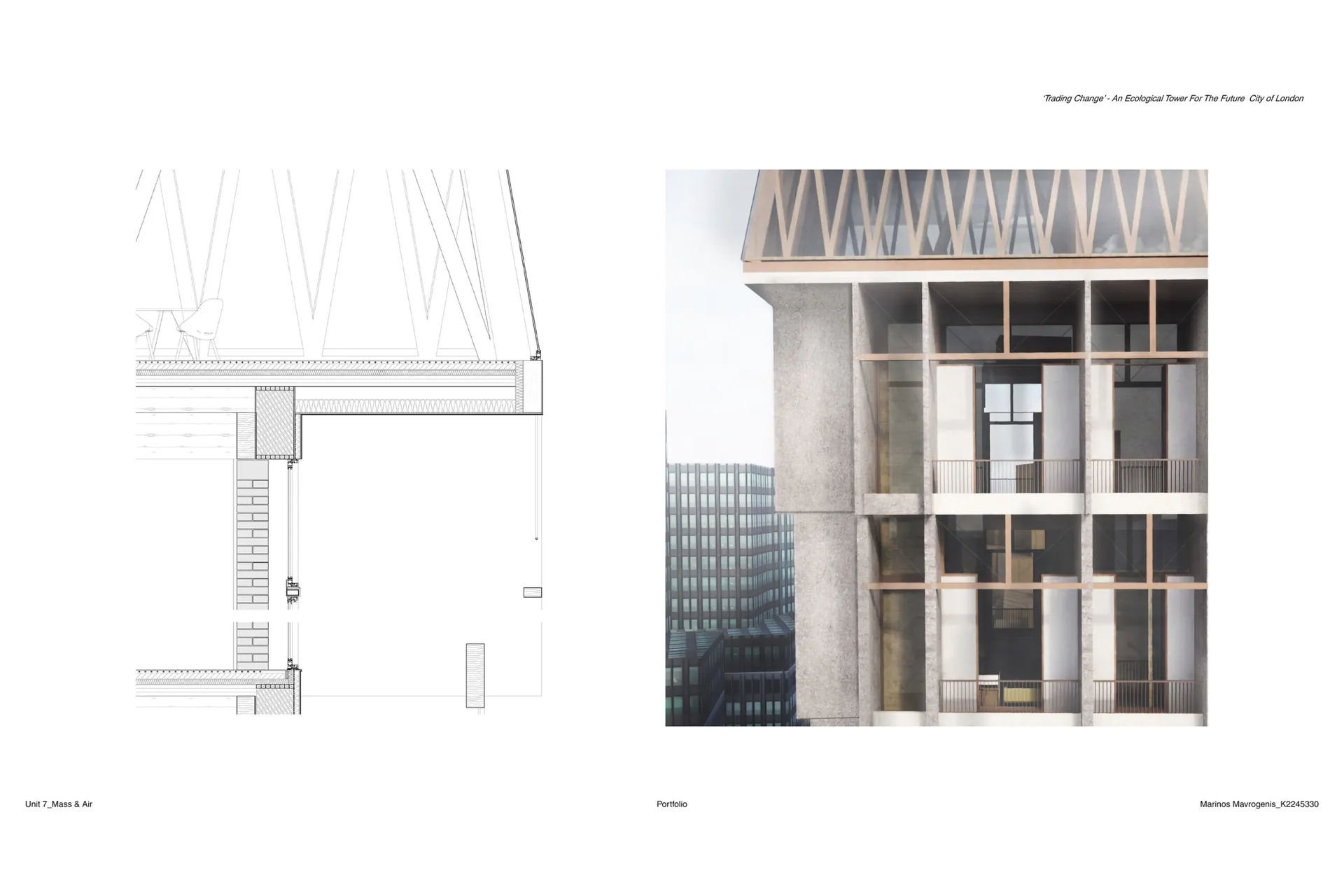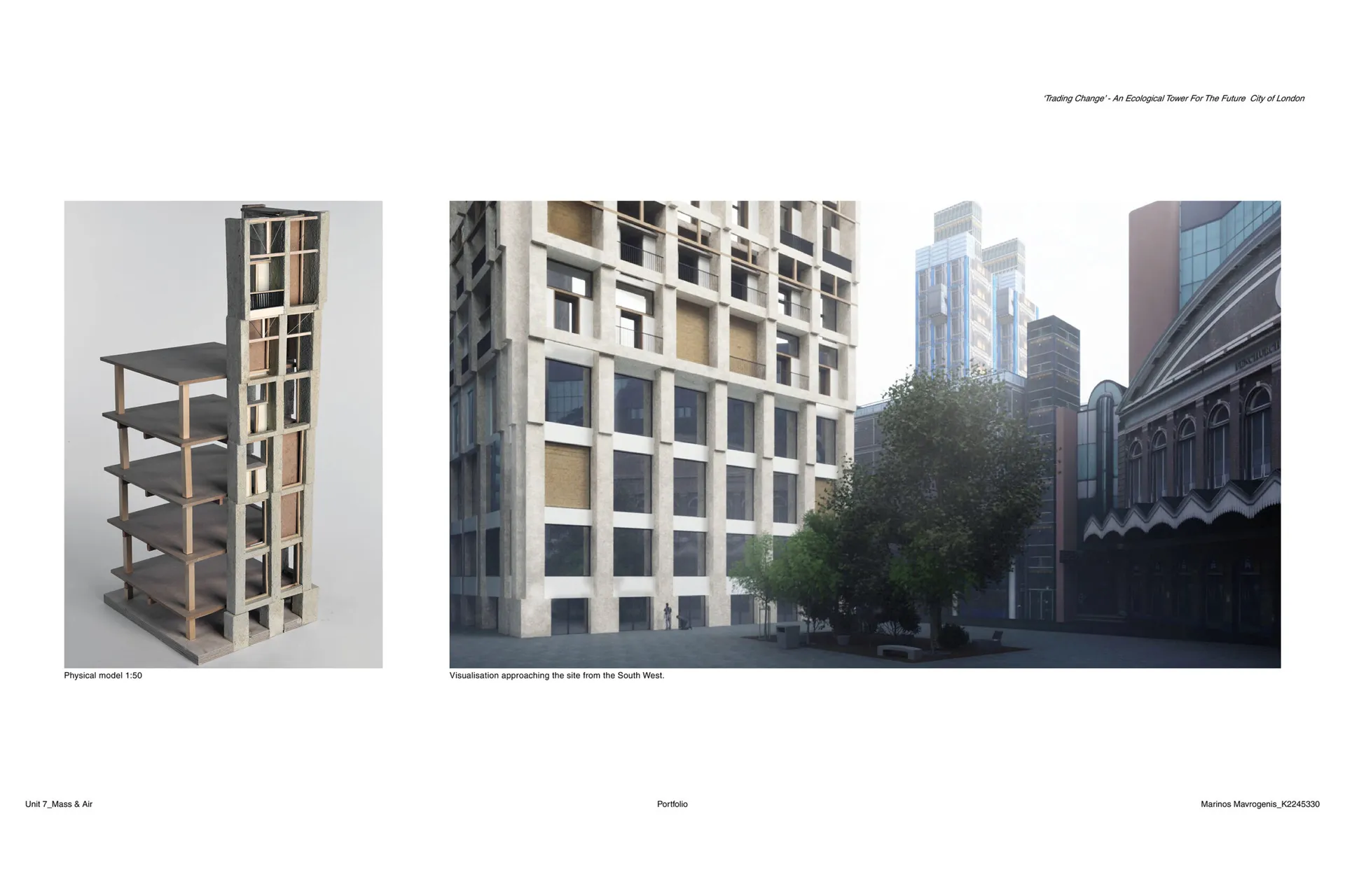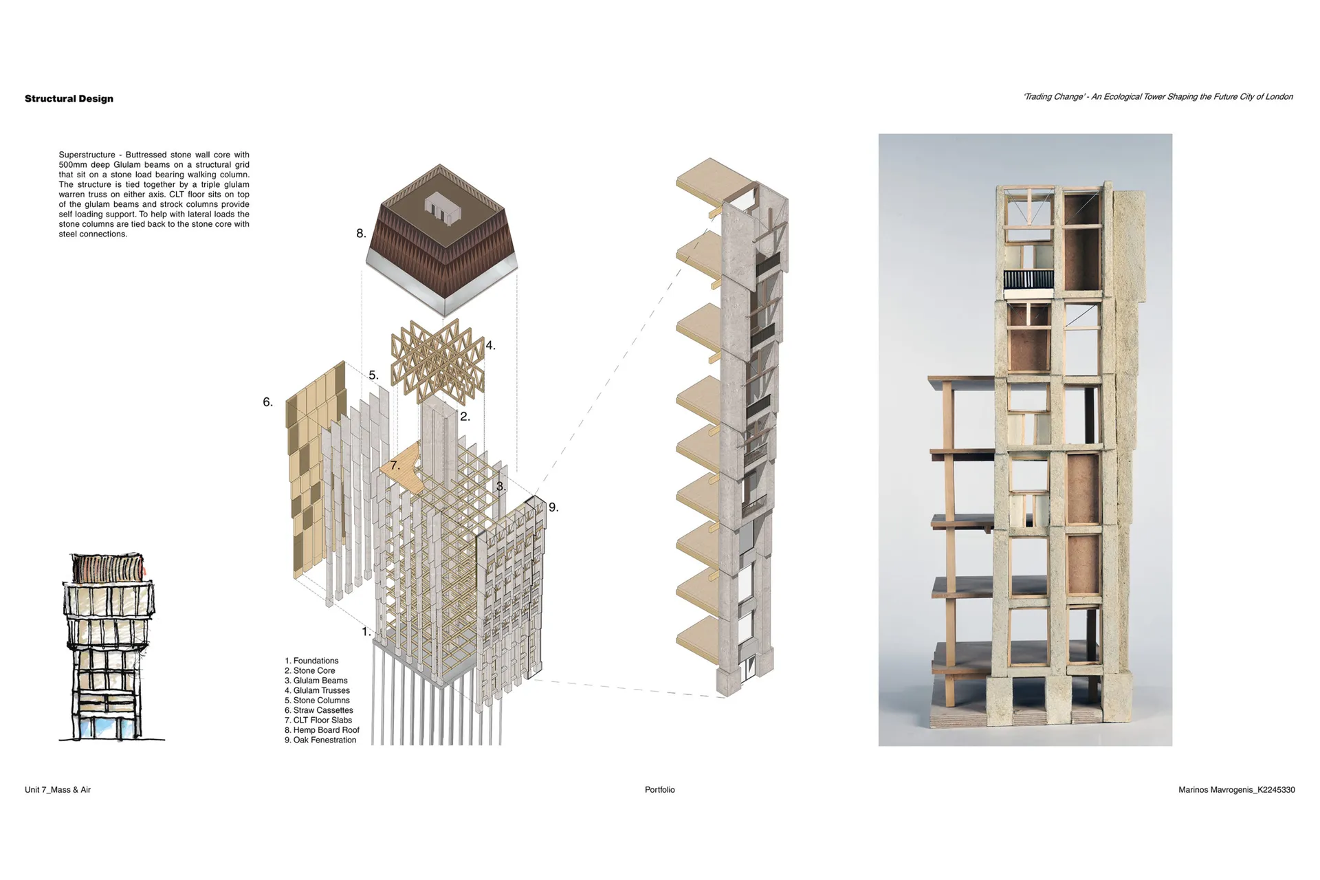 This project is situated amidst the urgency architects face in responding to the climate emergency and the tension in preserving architectural continuity. Confronting the challenge of re-evaluating conventional practices reliant on carbon-intensive materials while aspiring to maintain a sense of familiarity and permanence, the thesis highlights the necessity of dense buildings in financial districts to optimise land use and mitigate urban sprawl, thereby supporting sustainable urban growth.