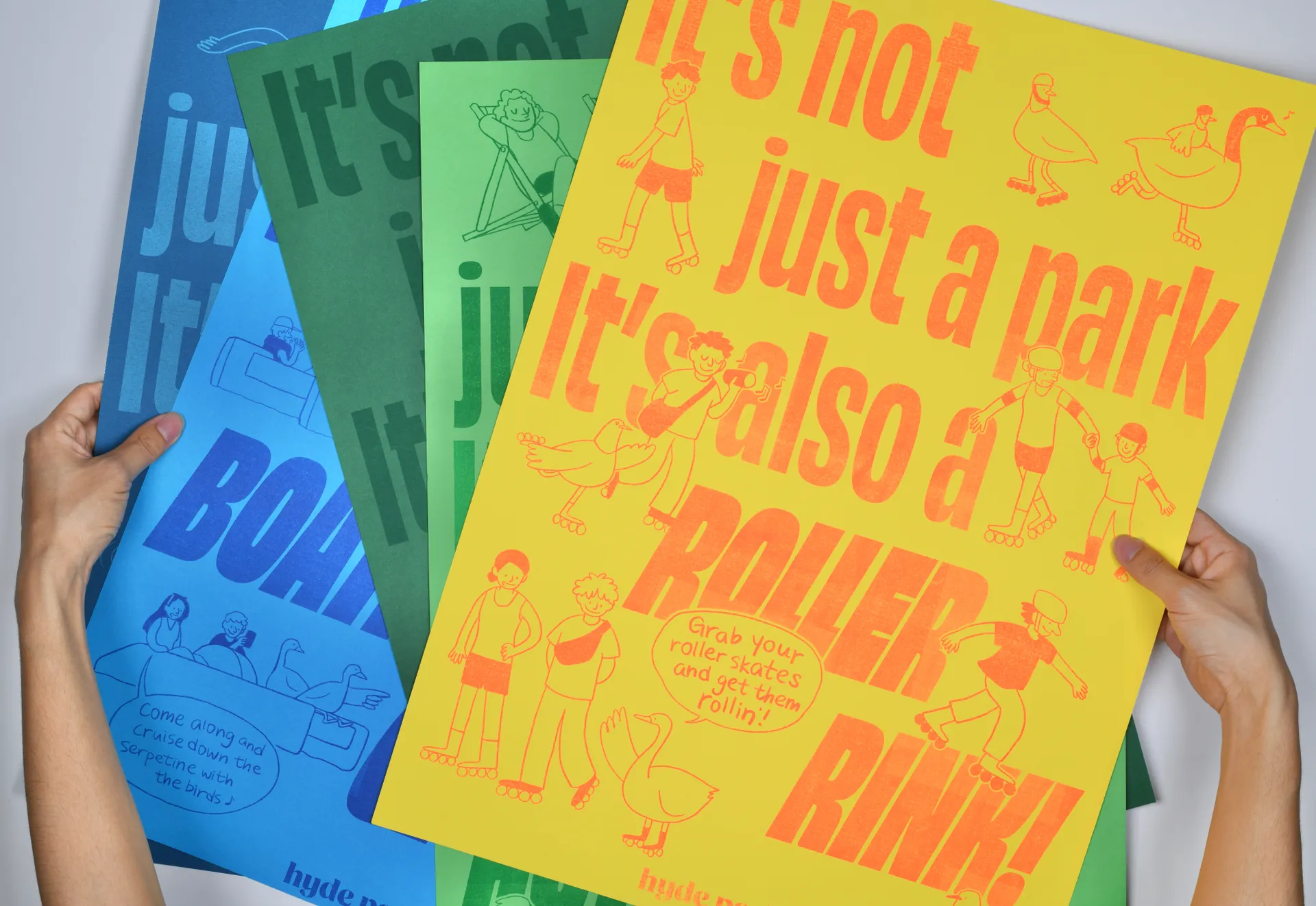 The illustrations are meant to create a light-hearted vibe to convey the message of how chill and relax it could be when you are in the park. All posters are printed with riso.