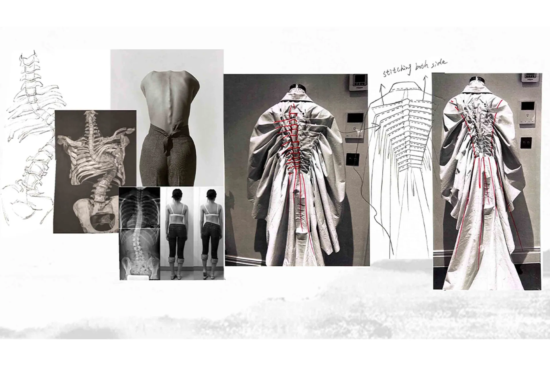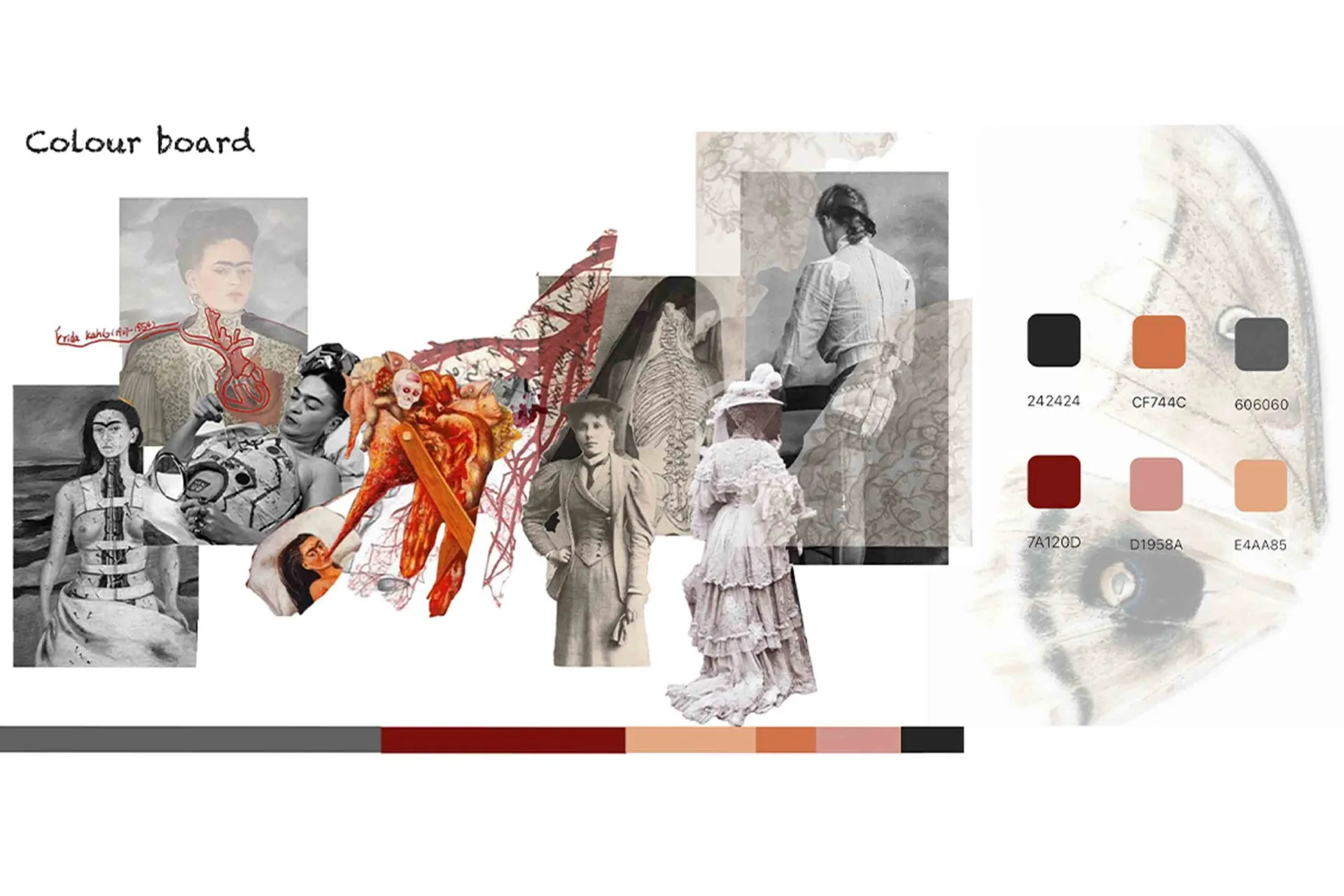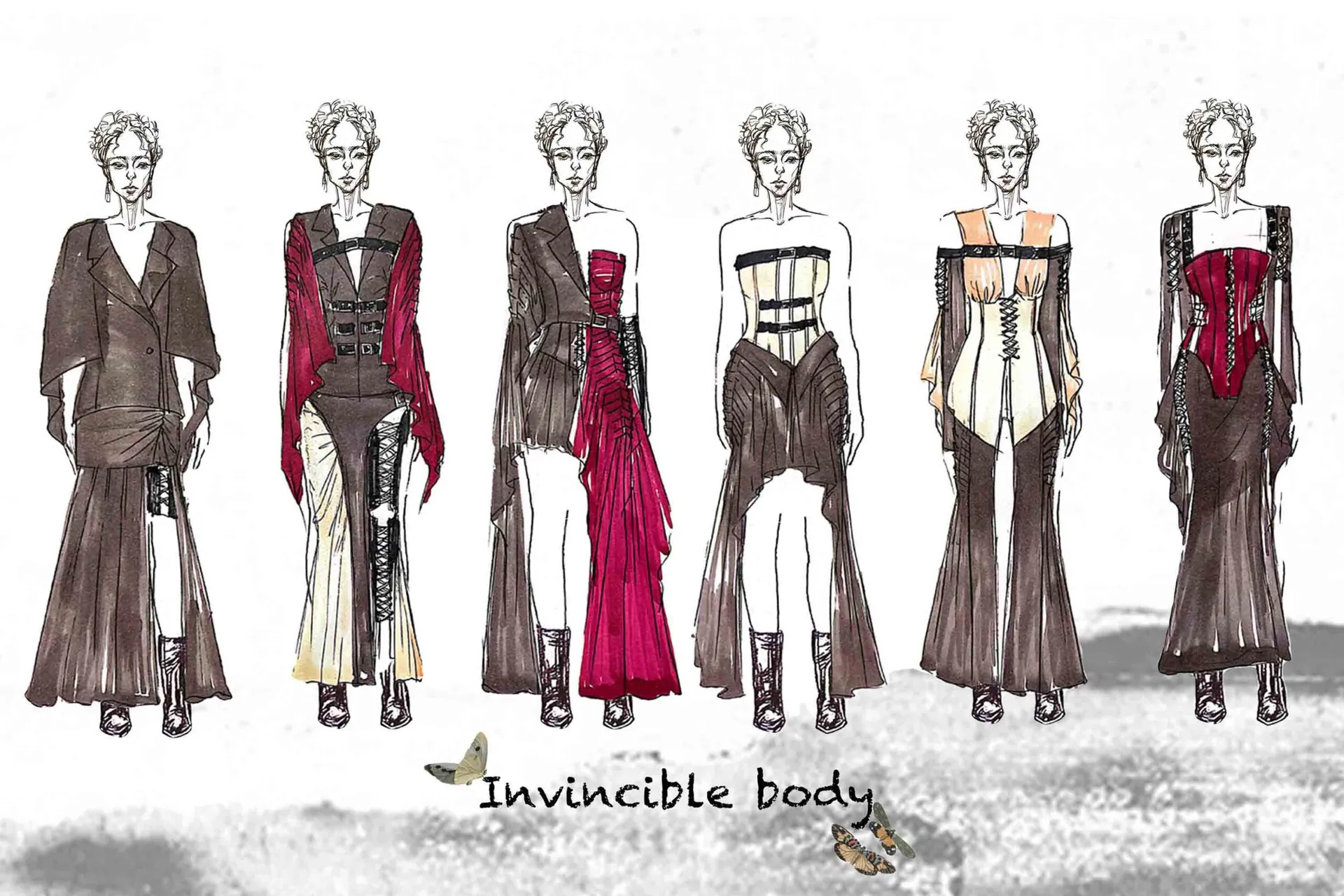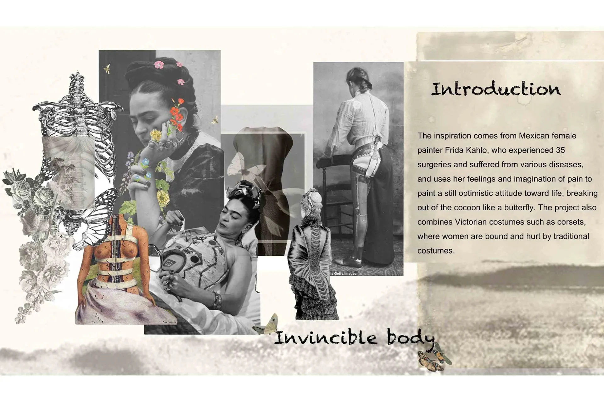 My project ‘Invincible Body’ was inspired by my muse a Mexican female painter Frida Kahlo, who experienced 35 surgeries and suffered from various diseases, and used her feelings and imagination of pain to paint a still optimistic attitude toward life, breaking out of the cocoon like a butterfly. The project also combines Victorian costumes such as corsets, where women are bound and hurt by traditional costumes.