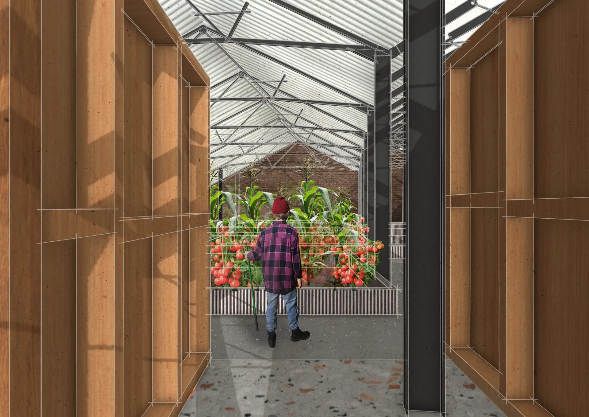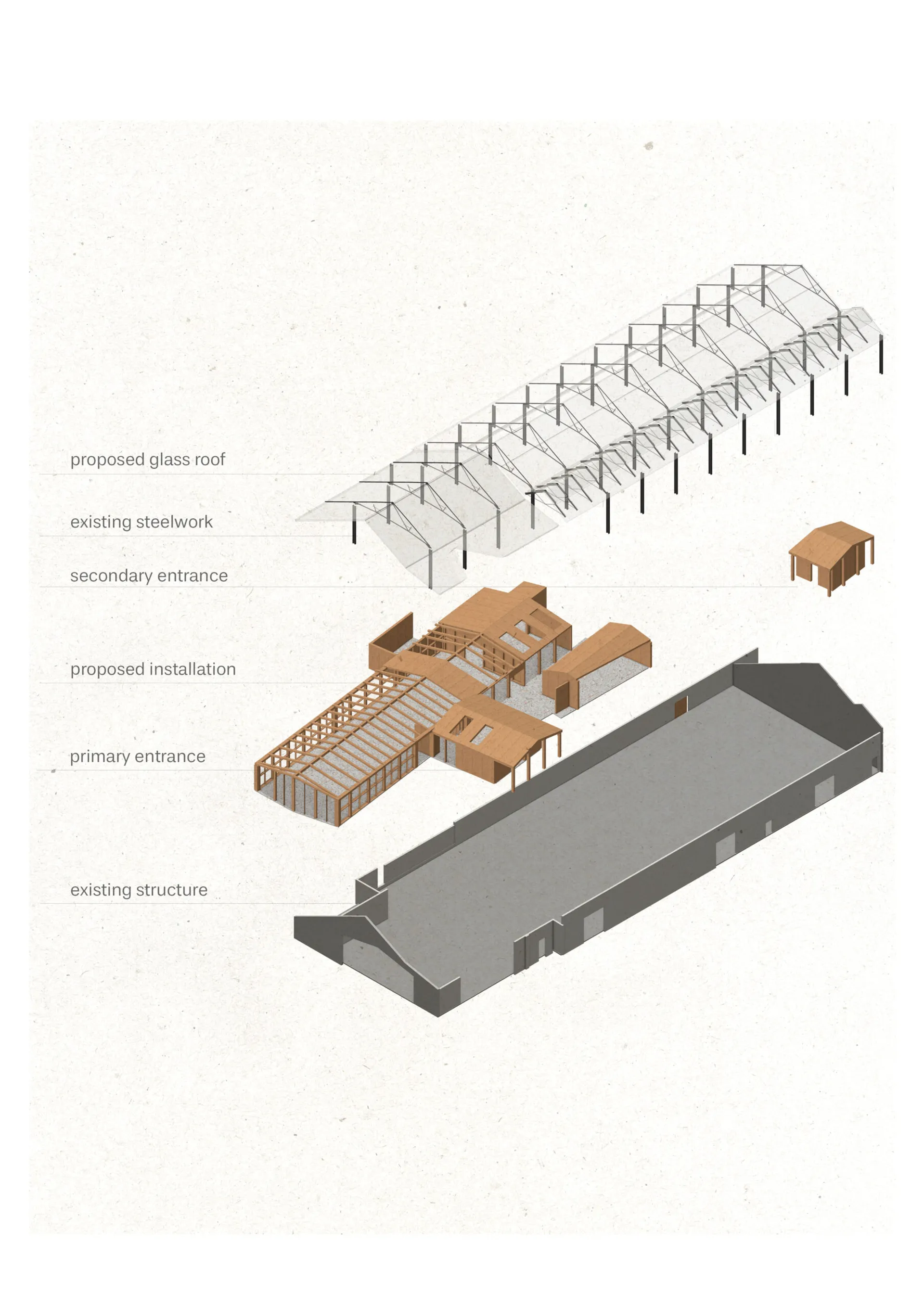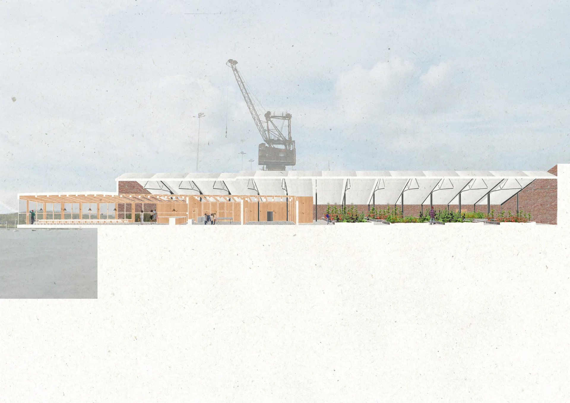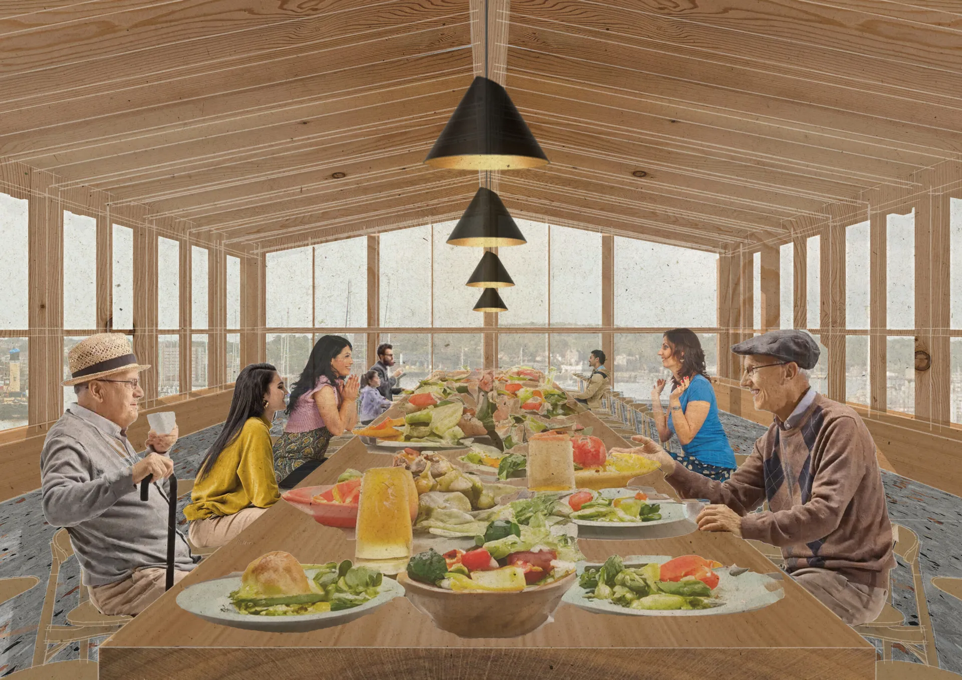 To remedy this social divide, the proposal aims to introduce the practice of commensality in Chatham as an adaptive reuse of a derelict workshop building within the historic dockyards. For millennia, the act of sharing a meal has played a vital role in societies for expressing ideas and strengthening communal bonds. The community kitchen will provide opportunities for individuals and families of all backgrounds to gather around cooking and eating. A large greenhouse grounds the proposal in self-sufficiency, allowing the cultivation of fresh produce and horticultural education opportunities. The preservation library acts as both a storage solution for preserving food, as well as a catalogue reading material surrounding culinary heritage, climate action, and cultivation techniques. In the kitchen, a single, central island unites cooks and diners together, encouraging socialization and fostering a stronger community bond. The kitchen also functions as a venue for cooking and baking classes for children attending the numerous primary and secondary schools in the area. The design emphasizes key views to the dockyards and the adjacent River Medway, reinforcing Chatham’s reconnection with nature, heritage, and history.