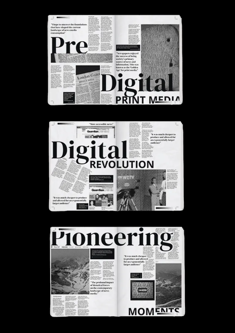 In this project: Paper to Pixels, I reimagined my dissertation, which was on the digitalisation of news media, as three newspaper editions. Each edition corresponds to a chapter of the dissertation: the first chapter explores print newspaper history which I presented as a printed newspaper using the research I conducted on letterpresses and layout to inform my design. The second chapter delves into the impact of digital news which I have presented in an iPad format, using my case study of The Daily to aid my design. Finally, in the third chapter, I explored the future of news media and how they will adapt to rising technologies; I envisioned this chapter as an interactive webpage newspaper.