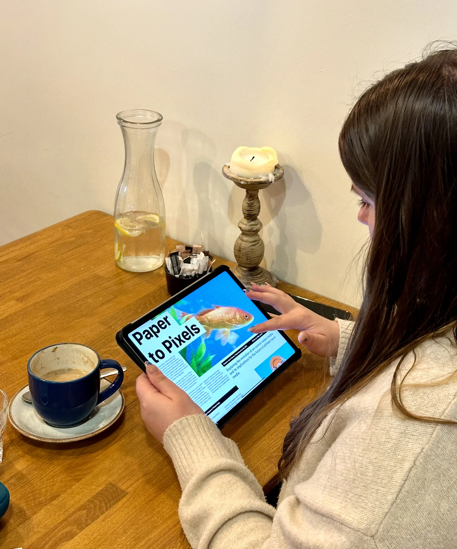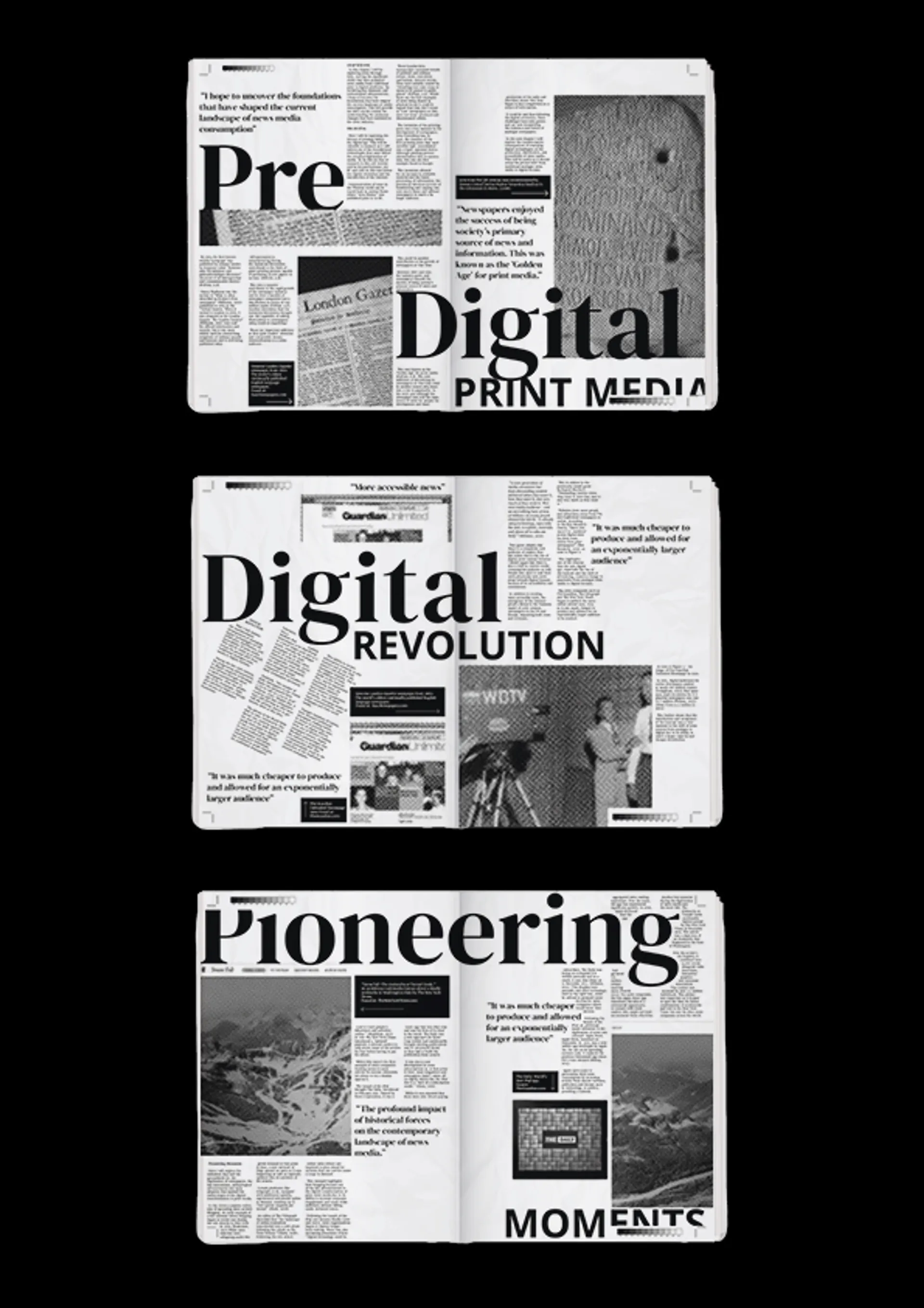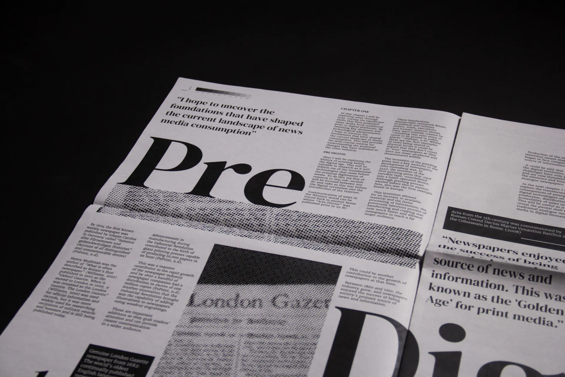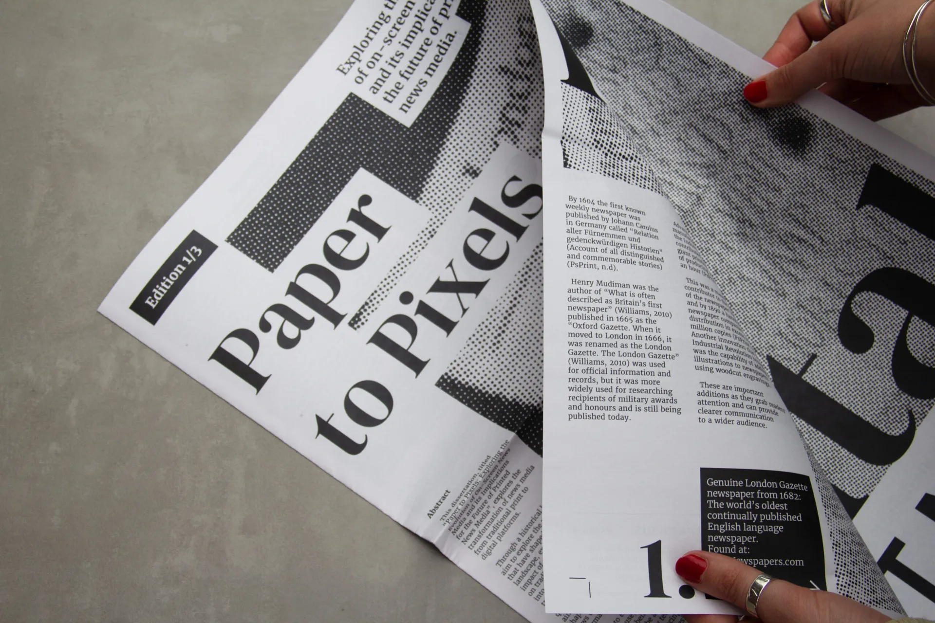 In this project: Paper to Pixels, I reimagined my dissertation, which was on the digitalisation of news media, as three newspaper editions. Each edition corresponds to a chapter of the dissertation: the first chapter explores print newspaper history which I presented as a printed newspaper using the research I conducted on letterpresses and layout to inform my design. The second chapter delves into the impact of digital news which I have presented in an iPad format, using my case study of The Daily to aid my design. Finally, in the third chapter, I explored the future of news media and how they will adapt to rising technologies; I envisioned this chapter as an interactive webpage newspaper.